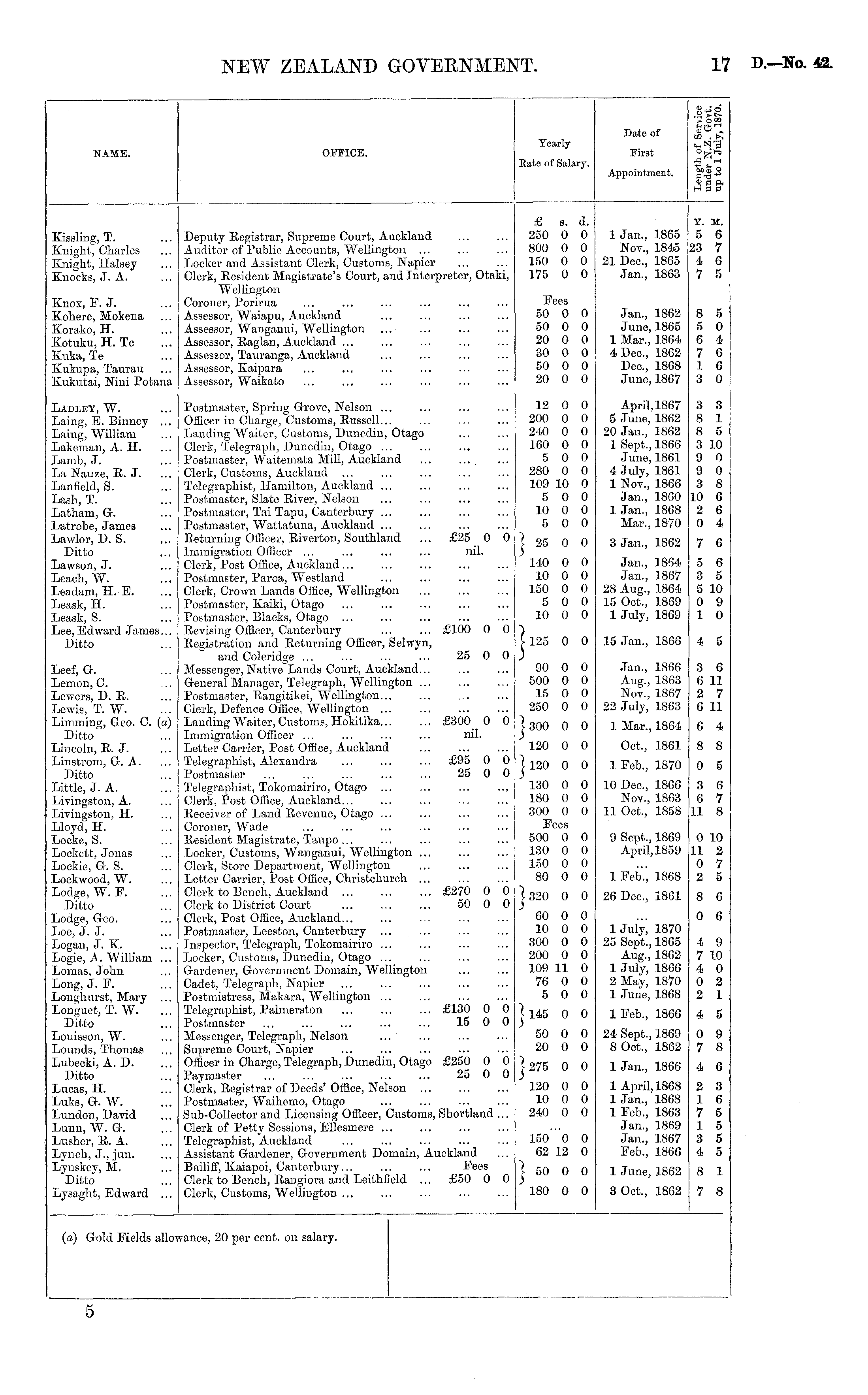 Yearly Date of First CO . t^ chN-3 ja ft rf I? M 2 3^3 0< fl 3. NAME. OFFICE. Rate of Salary. Appointment. Kissling, T. Knight, Charles Knight, Halsey Knocks, J. A. Deputy Registrar, Supreme Court, Auckland Auditor of Public Accounts, Wellington ... Locker and Assistant Clerk, Customs, Napier Clerk, Resident Magistrate's Court, and Interpreter, Otaki, Wellington Coroner, Porirua Assessor, Waiapu, Auckland Assessor, Wanganui, Wellington Assessor, Raglan, Auckland ... Assessor, Tauranga, Auckland Assessor, Kaipara Assessor, Waikato £ s. d. 250 0 0 800 0 0 150 0 0 175 0 0 1 Jan., 1865 Nov., 1845 21 Dec, 1865 Jan., 1863 Y. M. 5 6 23 7 4 6 7 5 Knox, F. J. Kohere, Mokena Korako, H. Kotuku, H. Te Kuka, Te Kukupa, Taurau Kukutai, Nini Potana Fees 50 0 0 50 0 0 20 0 0 30 0 0 50 0 0 20 0 0 Jan., 1862 June, 1865 1 Mar., 1864 4 Dec, 1862 Dec, 1868 June, 1867 8 5 5 0 6 4 7 6 1 6 3 0 Ladley, W. Laing, E. Binney ... Laing, William Lakeman, A. H. Lamb, J. La Nauze, R. J. Lanfield, S. Lash, T. Latham, G. Latrobe, James Lawlor, D. S. Ditto Lawson, J. Leach, W. Leadam, H. E. Leask, H. Leask, S. Lee, Edward James... Ditto Leef, G. Lemon, C. Lewers, D. R. Lewis, T. W. Limming, Geo. C. (a) Ditto Lincoln, R. J. Linstrom, G. A. Ditto Little, J. A. Livingston, A. Livingston, H. Lloyd, H. Locke, S. Lockett, Jonas Lockie, G. S. Lockwood, W. Lodge, W. F. Ditto Lodge, Geo. Loe, J. J. Logan, J. K. Logie, A. William ... Lomas, John Long, J. F. Longhurst, Mary ... Longuet, T. W. Ditto Louisson, W. Lounds, Thomas Lubecki, A. D. Ditto Lucas, H. Luks, G. W. Lundon, David Lunn, W. G. Lusher, R. A. Lynch, J., jun. Lynskey, M. Ditto Lysaght, Edward ... Postmaster, Spring Grove, Nelson ... Officer in Charge, Customs, Russell... Landing Waiter, Customs, Dunedin, Otago Clerk, Telegraph, Dunedin, Otago ... ... Postmaster, Waitemata Mill, Auckland ... ... Clerk, Customs, Auckland Telegraphist, Hamilton, Auckland ... ... Postmaster, Slate River, Nelson ... ... Postmaster, Tai Tapu, Canterbury ... Postmaster, Wattatuna, Auckland ... Returning Officer, Riverton, Southland ... £25 0 0 Immigration Officer ... ... ... ... nil. Clerk, Post Office, Auckland ... Postmaster, Paroa, Westland ... ... Clerk, Crown Lands Office, Wellington Postmaster, Kaiki, Otago Postmaster, Blacks, Otago ... Revising Officer, Canterbury ... ... £100 0 0 Registration and Returning Officer, Selwyn, and Coleridge 25 0 0 Messenger,Native Lands Court, Auckland... General Manager, Telegraph, Wellington Postmaster, Rangitikei, Wellington... Clerk, Defence Office, Wellington ... Landing Waiter, Customs, Hokitika £300_ 0 0 Immigration Officer ... ... ... ... nil. Letter Carrier, Post Office, Auckland Telegraphist, Alexandra £95 0 0 Postmaster 25 0 0 Telegraphist, Tokomairiro, Otago ... Clerk, Post Office, Auckland Receiver of Land Revenue, Otago ... Coroner, Wade Resident Magistrate, Taupo... Locker, Customs, Wanganui, Wellington ... Clerk, Store Department, Wellington Letter Carrier, Post Office, Christchurch ... Clerk to Bench, Auckland £270 0 0 Clerk to District Court 50 0 0 Clerk, Post Office, Auckland... Postmaster, Leeston, Canterbury Inspector, Telegraph, Tokomairiro ... Locker, Customs, Dunedin, Otago ... Gardener, Government Domain, Wellington Cadet, Telegraph, Napier Postmistress, Makara, Wellington ... ... Telegraphist, Palmerston ... ... ... £130 0 0 Postmaster ... ... ... ... ... 15 0 0 Messenger, Telegraph, Nelson Supremo Court, Napier Officer in Charge, Telegraph, Dunedin, Otago £250 0 0 Paymaster 25 0 0 Clerk, Registrar of Deeds'Office, Nelson ... Postmaster, Waihemo, Otago Sub-Collector and Licensing Officer, Customs, Shortland ... Clerk of Petty Sessions, Ellesmere Telegraphist, Auckland Assistant Gardener, Government Domain, Auckland Bailiff, Kaiapoi, Canterbury... ... ... Fees Clerk to Bench, Rangiora and Leithfield ... £50 0 0 Clerk, Customs, Wellington 12 0 0 200 0 0 240 0 0 160 0 0 5 0 0 280 0 0 109 10 0 5 0 0 10 0 0 5 0 0 | 25 0 0 140 0 0 10 0 0 150 0 0 5 0 0 10 0 0 (125 0 0 90 0 0 500 0 0 15 0 0 250 0 0 ] 300 0 0 120 0 0 | 120 0 0 130 0 0 180 0 0 300 0 0 Fees 500 0 0 130 0 0 150 0 0 80 0 0 April, 1867 5 June, 1862 20 Jan., 1862 1 Sept., 1866 June, 1861 4 July, 1861 1 Nov., 1866 Jan., 1860 1 Jan., 1868 Mar., 1870 3 Jan., 1862 Jan., 1864 Jan., 1867 28 Aug., 1864 15 Oct., 1869 1 July, 1869 15 Jan., 1866 Jan., 1866 Aug., 1863 Nov., 1867 22 July, 1863 1 Mar., 1864 Oct., 1861 1 Feb., 1870 10 Dec, 1866 Nov., 1863 11 Oct., 1858 3 3 8 1 8 5 3 10 9 0 9 0 3 8 10 6 2 6 0 4 7 6 5 6 3 5 5 10 0 9 1 0 4 5 3 6 6 11 2 7 6 11 6 4 8 8 0 5 3 6 6 7 11 8 9 Sept., 1869 April, 1859 0 10 11 2 0 7 2 5 1 Feb.', 1868 ) 320 0 0 26 Dec, 1861 8 6 60 0 0 10 0 0 300 0 0 200 0 0 109 11 0 76 0 0 5 0 0 Uuly, 1870 25 Sept., 1865 Aug., 1862 1 July, 1866 2 May, 1870 1 June, 1868 0 6 4 9 7 10 4 0 0 2 2 1 ] 145 0 0 1 Feb., 1866 4 5 50 0 0 20 0 0 24 Sept., 1869 8 Oct., 1862 0 9 7 8 J275 0 0 Uan., 1866 4 6 120 0 0 10 0 0 240 0 0 1 April, 1868 1 Jan., 1868 1 Feb., 1863 Jan., 1869 Jan., 1867 Feb., 1866 2 3 1 6 7 5 1 5 3 5 4 5 150 "o 0 62 12 0 ] 50 0 0 1 June, 1862 8 1 180 0 0 3 Oct., 1862 7 8 (a) Gold Fields alio vance, 20 per cent, on salary.