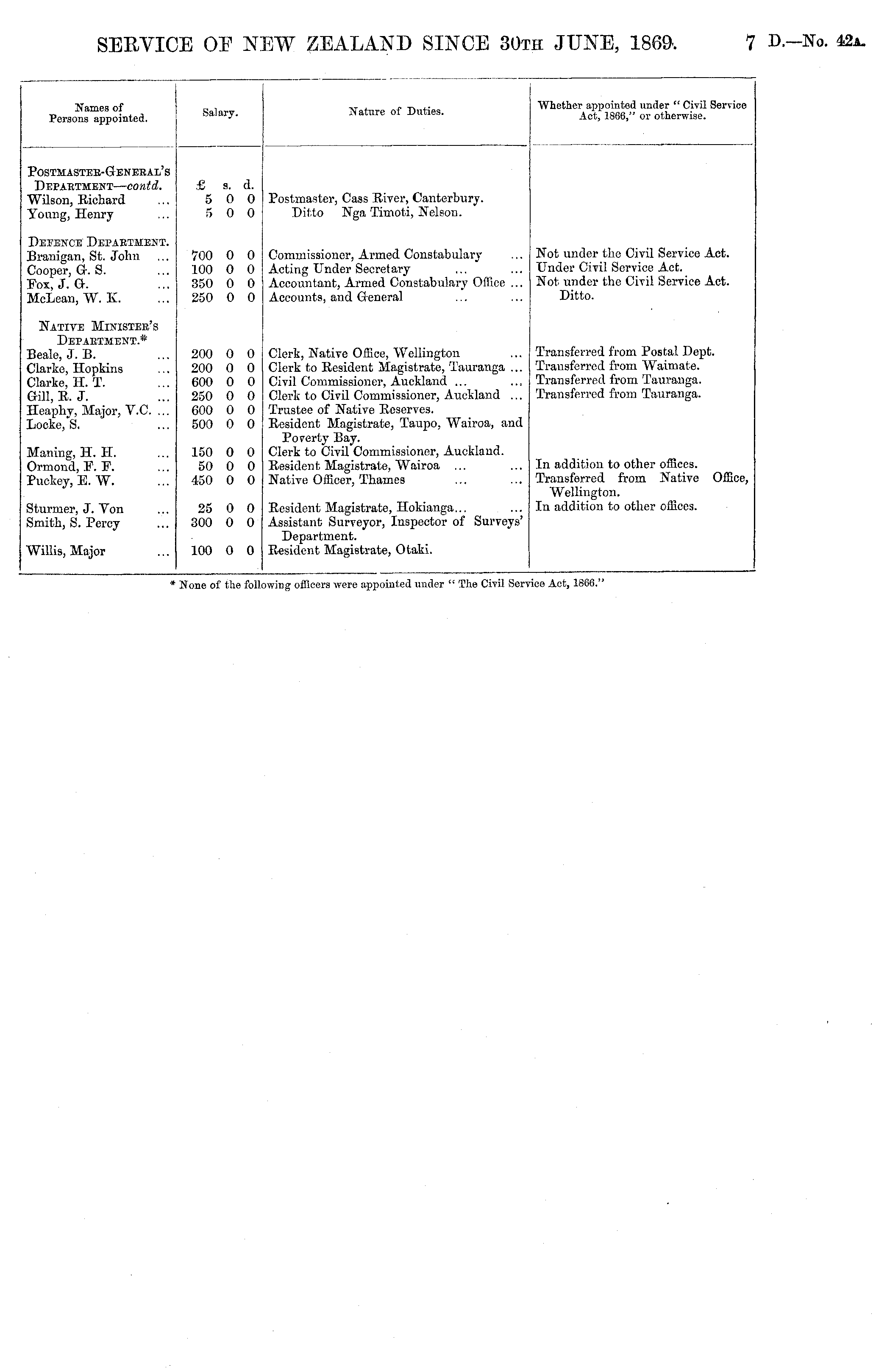 Names of Persons appointed. Salary. Nature of Duties. Whether appointed under " Civil Service Act, 1866," or otherwise. Postmaster-General's Department— contd, Wilson, Richard Young, Henry £ s. d. 5 0 0 5 0 0 Postmaster, Cass River, Canterbury. Ditto Nga Timoti, Nelson. Deeence Department. Branigan, St. John Cooper, G. S. Fox, J. G. McLean, W. K. 700 0 0 100 0 0 350 0 0 250 0 0 Commissioner, Armed Constabulary Acting Under Secretary Accountant, Armed Constabulary Office ... Accounts, and General Not under the Civil Service Act. Under Civil Service Act. Not under the Civil Service Act. Ditto. Native Minister's Department.* Beale, J. B. Clarke, Hopkins Clarke, H. T. Gill, R.J. Heaphy, Major, V.C. ... Locke, S. 200 0 0 200 0 0 600 0 0 250 0 0 600 0 0 500 0 0 Clerk, Office, Wellington Clerk to Resident Magistrate, Tauranga ... Civil Commissioner, Auckland ... Clerk to Civil Commissioner, Auckland ... Trustee of Native Reserves. Resident Magistrate, Taupo, Wairoa, and Poverty Bay. Clerk to Civil Commissioner, Auckland. Resident Magistrate, Wairoa ... Native Officer, Thames Transferred from Postal Dept. Transferred from Waimate. Transferred from Tauranga. Transferred from Tauranga. Maning, H. H. Ormond, F. F. Puckey, E. W. 150 0 0 50 0 0 450 0 0 In addition to other offices. Transferred from Native Office, Wellington. In addition to other offices. Stunner, J. Von Smith, S. Percy 25 0 0 300 0 0 Resident Magistrate, Hokianga... Assistant Surveyor, Inspector of Surveys' Department. Resident Magistrate, Otaki. Willis, Major 100 0 0 * None of the following officers were appointed under " The Civil Service Act, 1866."