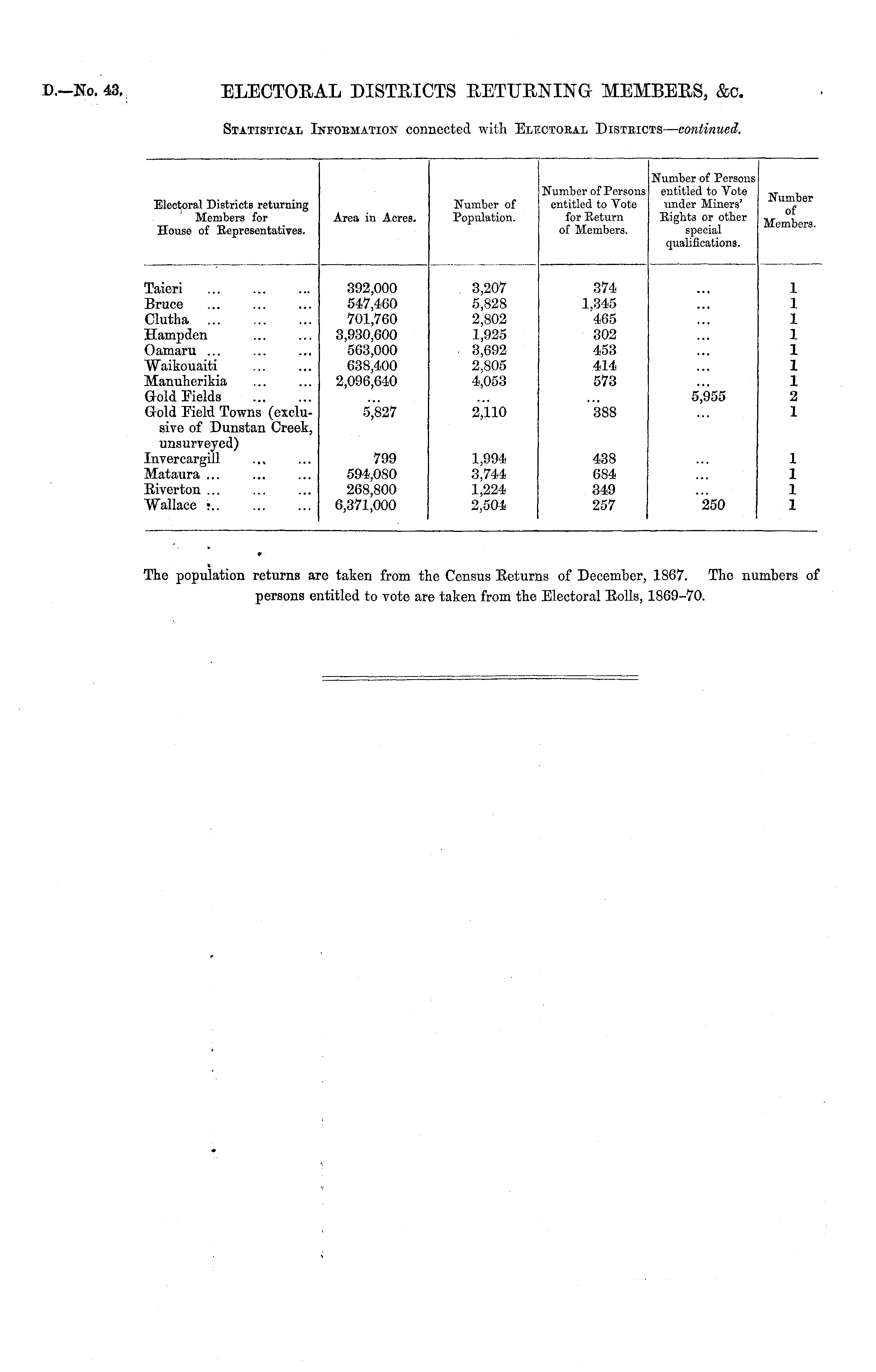 iTATISTICAL toemation" connec wit; iLECTOEAL 'ISTBIi its — continue* Electoral Districts returning Members for House of Representatives. Number of Population. Number of Persons entitled to Vote for Return of Members. Number of Persons entitled to Vote under Miners' Higlits or other special qualifications. Number of Members. Area in Acres. Paieri 392,000 547,460 701,760 3,930,600 563,000 638,400 2,096,640 3,207 5,828 2,802 1,925 3,C92 2,805 4,053 374 1,345 465 302 453 414 573 1 1 1 1 1 1 1 2 1 3ruce Ulutha BEampden Damaru ... ftfaikouaiti tfanuherikia Sold Fields 3-old Reid Towns (exclusive of Dunstan Creek, unsurveyed) nvercargill MCataura ... Jiverton ... vVallace ?.. 5,827 2,110 388 5,955 799 594,080 268,800 6,371,000 1,994 3,744 1,224 2,504 438 684 349 257 1 1 1 1 250 * 'he population returns are taken from the Census Eeturns of December, 1867. The numbers of persons entitled to vote are taken from the Electoral Eolls, 1869-70.