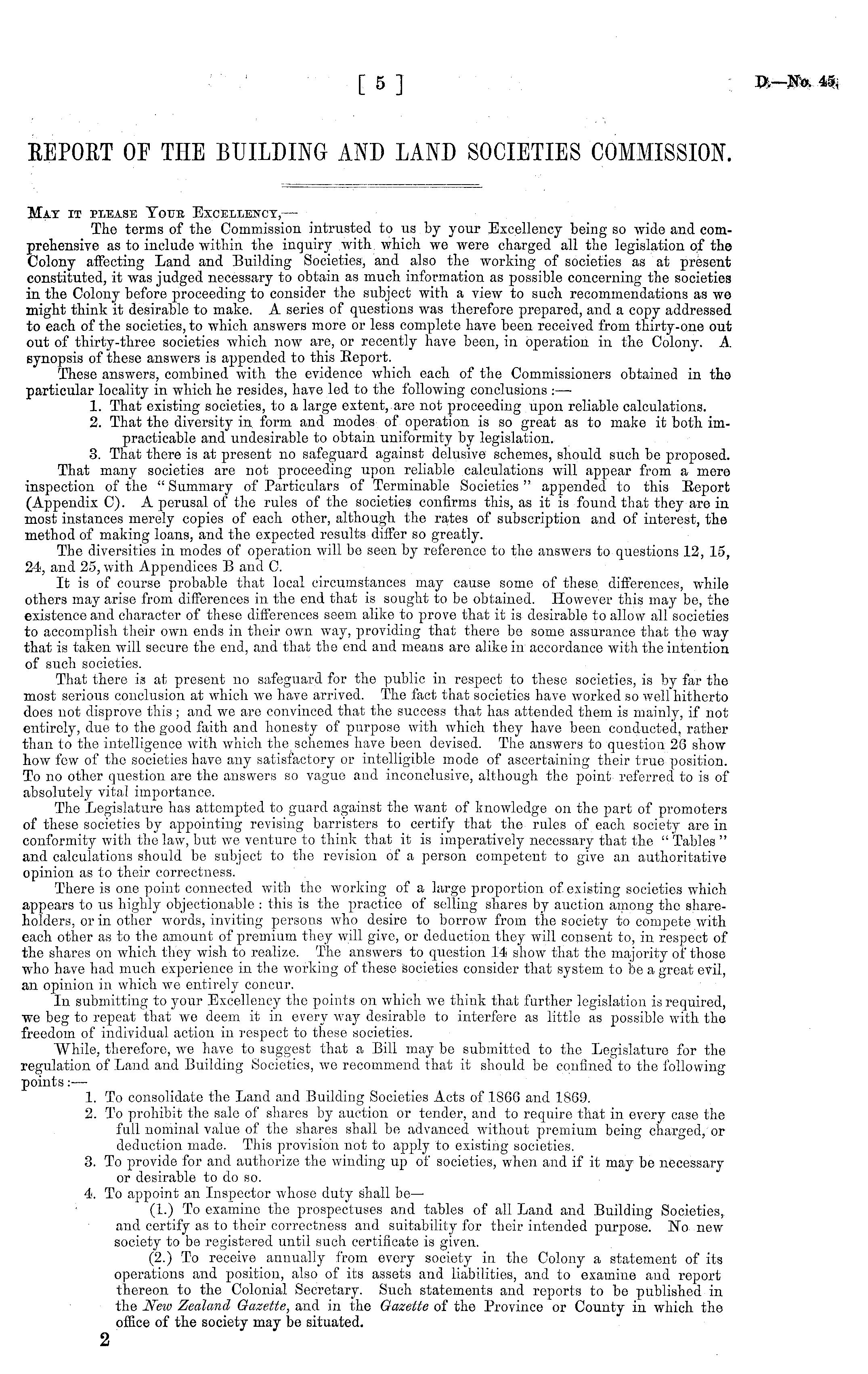 May it please Tour Excellency,— The terms of the Commission intrusted to us by your Excellency being so wide and comprehensive as to include within the inquiry with which we were charged all the legislation of the Colony affecting Land and Building Societies, and also the working of societies as at present constituted, it was judged necessary to obtain as much information as possible concerning the societies in the Colony before proceeding to consider the subject with a view to such recommendations as we might think it desirable to make. A series of questions was therefore prepared, and a copy addressed to each of the societies, to which answers more or less complete have been received from thirty-one out out of thirty-three societies which now are, or recently have been, in operation in the Colony. A. synopsis of these answers is appended to this Eeport. These answers, combined with the evidence which each of the Commissioners obtained in the particular locality in which he resides, have led to the following conclusions : — 1. That existing societies, to a large extent, are not proceeding upon reliable calculations. 2. That the diversity in form and modes of operation is so great as to make it both impracticable and undesirable to obtain uniformity by legislation. 3. That there is at present no safeguard against delusive schemes, should such be proposed. That many societies are not proceeding upon reliable calculations will appear from a mere inspection of the " Summary of Particulars of Terminable Societies " appended to this Eeport (Appendix C). A perusal of the rules of the societies confirms this, as it is found that they are in most instances merely copies of each other, although the rates of subscription and of interest, the method of making loans, and the expected results differ so greatly. The diversities in modes of operation will bo seen by reference to the answers to questions 12, 15, 24, and 25, with Appendices B and C. It is of course probable that local circumstances may cause some of these differences, while others may arise from differences in the end that is sought to be obtained. However this may be, the existence and character of these differences seem alike to prove that it is desirable to allow all societies to accomplish their own ends in their own way, providing that there be some assurance that the way that is taken will secure the end, and that the end and means are alike in accordance with the intention of such societies. That there is at present no safeguard for the public in respect to these societies, is by far the most serious conclusion at which we have arrived. The fact that societies have worked so well hitherto does not disprove this; and we are convinced that the success that has attended them is mainly, if not entirely, due to the good faith and honesty of purpose with which they have been conducted, rather than to the intelligence with which the schemes have been devised. The answers to question 26 show how few of the societies have any satisfactory or intelligible mode of ascertaining their true position. To no other question are the answers so vague and inconclusive, although the point referred to is of absolutely vital importance. The Legislature has attempted to guard against the want of knowledge on the part of promoters of these societies by appointing revising barristers to certify that the rules of each society are in conformity with the law, but we venture to think that it is imperatively necessary that the " Tables " and calculations should be subject to the revision of a person competent to give an authoritative opinion as to their correctness. There is one point connected with the working of a large proportion of existing societies which appears to us highly objectionable : this is the practice of selling shares by auction among the shareholders, or in other words, inviting persons who desire to borrow from the society to compete with each other as to the amount of premium they will give, or deduction they will consent to, in respect of the shares on which they wish to realize. The answers to question 14 show that the majority of those who have had much experience in the working of these societies consider that system to be a great evil, an opinion in which we entirely concur. In submitting to your Excellency the points on which we think that further legislation is required, we beg to repeat that we deem it in every way desirable to interfere as little as possible with the freedom of individual action in respect to these societies. While, therefore, we have to suggest that a Bill may be submitted to tho Legislature for the regulation of Land and Building Societies, we recommend that it should be confined to the following points: — 1. To consolidate tho Land and Building Societies Acts of 1860 and 1869. 2. To prohibit the sale of shares by auction or tender, and to require that in every case the full nominal value of the shares shall be advanced without premium being charged, or deduction made. This provision not to apply to existing societies. 3. To provide for and authorize the winding up of societies, when and if it may be necessary or desirable to do so. 4. To appoint an Inspector whose duty shall bo — (1.) To examine the prospectuses and tables of all Land and Building Societies, and certify as to their correctness and suitability for their intended purpose. No new society to be registered until such certificate is given. (2.) To receive annually from every society in the Colony a statement of its operations and position, also of its assets and liabilities, and to examine and report thereon to the Colonial Secretary. Such statements and reports to be published in the JVeiv Zealand Gazette, and in the Gazette of the Province or County in which the office of the society may be situated. 2