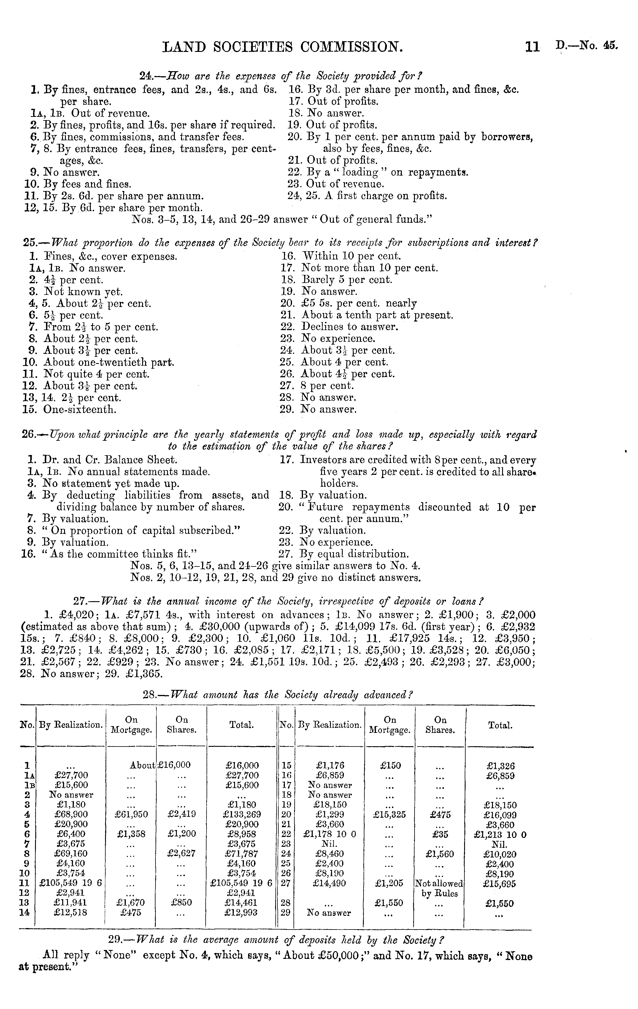 o. By Eealization. On Mortgage. On Shares. Total. No. By Realization. On Mortgage. On Shares. Total. 1 Ia IB 2 3 4 5 6 7 8 9 LO LI :2 13 L4 About £16,000 £16,000 £27,700 £15,600 15 16 17 18 19 20 21 22 23 24 25 26 27 £1,176 £6,859 No answer No answer £18,150 £1,299 £3,660 £1,178 10 0 Nil. £8,460 £2,400 £8,190 £14,490 £150 £1,326 £6,859 £27,700 £15,600 No answer £1,180 £68,900 £20,900 £6,400 £3,675 £69,160 £4,160 £3,754 £105,549 19 6 £2,941 £11,941 £12,518 £61,950 £1,358 £2,419 £1,200 £2,627 £1,180 £133,269 £20,900 £8,958 £3,675 £71,787 £4,160 £3,754 £105,549 19 6 £2,941 £14,461 £12,993 £15,325 £475 £35 £1,560 £18,150 £16,099 £3,660 £1,213 10 0 Nil. £10,020 £2,400 £8,190 £15,695 £1,205 Not allowed by Rules &X0O £475 £850 28 29 No answer £1,550 £1,550 29.— Wh it is the werage amoun, i, which says,' deposits held by the Sc ;" and No. wiety ? All reply " None" exi it present." :ept No. :ia: iout £50,000; 17, which says, " None