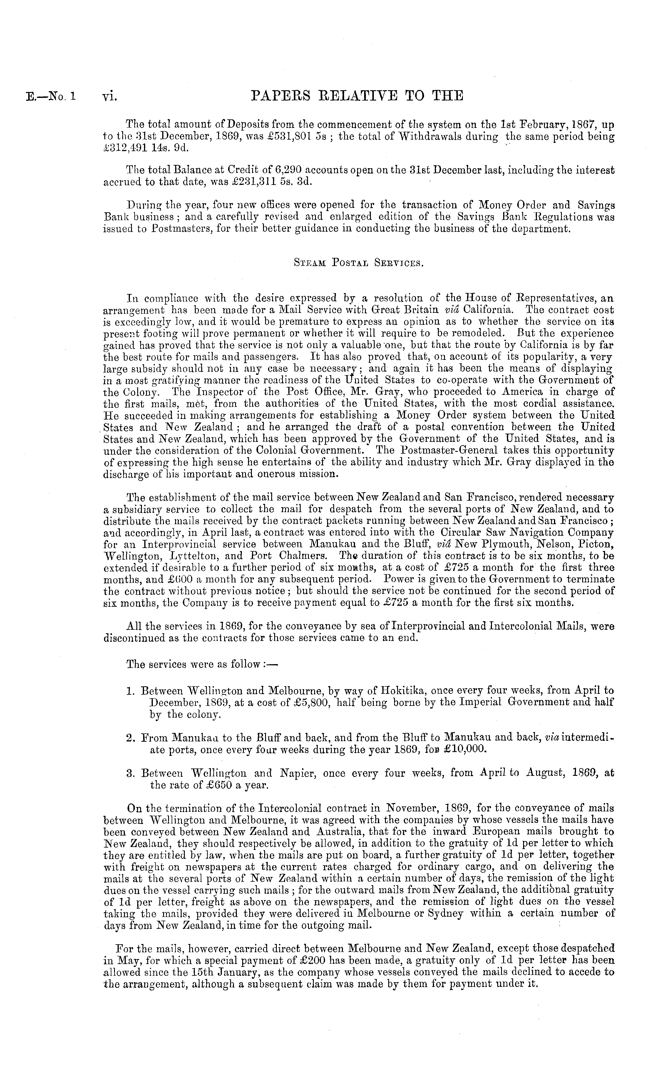 The total amount of Deposits from the commencement of the system on the Ist Eebruary, 1867, up to the 31st December, 1869, was £531,801 5s ; the total of Withdrawals during the same period being £312,491 14s. 9d. The total Balance at Credit of 6,290 accounts open on the 31st December last, including the interest accrued to that date, was £231,311 ss. 3d. During the year, four new offices were opened for the transaction of Money Order and Savings Bank business ; and a carefully revised and enlarged edition of the Savings Bank Eegulations was issued to Postmasters, for their better guidance in conducting the business of the department. Steam Postal Serttces. In compliance with the desire expressed by a resolution of the House of Eepresentatives, an arrangement has been made for a Mail Service with Great Britain via California. The contract cost is exceedingly low, and it would be premature to express au opinion as to whether the service on its present footing will prove permanent or whether it will require to be remodeled. But the experience gained has proved that the service is not only a valuable one, but that the route by California is by far the best route for mails and passengers. It has also proved that, on account of its popularity, a very large subsidy should not in any case be necessary; and again it has been the means of displaying in a most gratifying manner the readiness of the United States to co-operate with the Government of the Colony. The Inspector of the Post Office, Mr. Gray, who proceeded to America in charge of the first mails, met, from the authorities of the United States, with the most cordial assistance. He succeeded in making arrangements for establishing a Money Order system between the United States and New Zealand ; and he arranged the draft of a postal convention between the United States and New Zealand, which has been approved by the Government of the United States, and is under the consideration of the Colonial Government. Tho Postmaster-General takes this opportunity of expressing the high sense he entertains of the ability and industry which Mr. Gray displayed in the discharge of his important and onerous mission. The establishment of the mail service between New Zealand and San Francisco, rendered necessary a subsidiary service to collect the mail for despatch from the several ports of New Zealand, and to distribute the mails received by the contract packets running between New Zealand and San Francisco ; and accordingly, in April last, a contract was entered into with the Circular Saw Navigation Company for an Interprovincial service between Manukau and the Bluff, via New Plymouth, Nelson, Picton, Wellington, Lyttelton, and Port Chalmers. The duration of this contract is to be six months, to be extended if desirable to a further period of six months, at a cost of £725 a month for the first three months, and £600 a month for any subsequent period. Power is given to the Government to terminate the contract without previous notice; but should the service not be continued for the second period of six months, the Company is to receive payment equal to £725 a month for the first six months. All the services in 1869, for the conveyance by sea of Interprovincial and Intercolonial Mails, were discontinued as the contracts for those services came to an end. The services were as follow :— 1. Between Wellington and Melbourne, by way of Hokitika, once every four weeks, from April to December, 1869, at a cost of £5,800, half being borne by the Imperial Government and half by the colony. 2. From Manukau to the Bluff and back, and from the Bluff to Manukau and back, via intermediate ports, once every four weeks during the year 1869, fou £10.000. 3. Between Wellington and Napier, once every four weeks, from April to August, 1869, at the rate of £650 a year. On the termination of the Intercolonial contract in November, 1869, for the conveyance of mails between Wellington and Melbourne, it was agreed with the companies by whose vessels the mails have been conveyed between New Zealand and Australia, that for the inward European mails brought to New Zealand, they should respectively be allowed, in addition to the gratuity of Id per letter to which they are entitled by law, when the mails are put on board, a further gratuity of Id per letter, together with freight on newspapers at the current rates charged for ordinary cargo, and on delivering the mails at the several ports of New Zealand within a certain number of days, the remission of the light dues on the vessel carrying such mails ; for the outward mails from New Zealand, the additional gratuity of Id per letter, freight as above on the newspapers, and the remission of light dues on the vessel taking the mails, provided they were delivered in Melbourne or Sydney within a certain number of days from New Zealand, in time for the outgoing mail. For the mails, however, carried direct between Melbourne and New Zealand, except those despatched in May, for which a special payment of £200 has been made, a gratuity only of Id per letter has been allowed since the 15th January, as the company whose vessels conveyed the mails declined to accede to the arrangement, although a subsequent claim was made by them for payment under it.