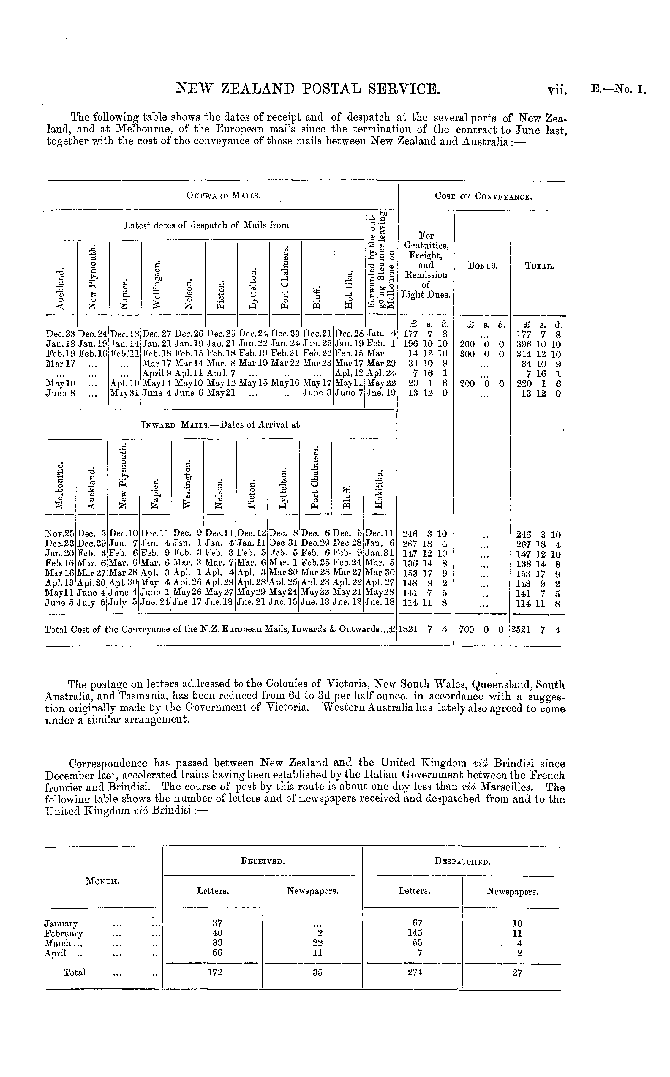 The postage on letters addressed to the Colonies of Victoria, New South Wales, Queensland, South Australia, and Tasmania, has been reduced from 6d to 3d per half ounce, in accordance with a suggestion originally made by the Government of Victoria. Western Australia has lately also agreed to come under a similar arrangement. Correspondence has passed between New Zealand and the United Kingdom via Brindisi since December last, accelerated trains having been established by the Italian Government between the French frontier and Brindisi. The course of post by this route is about one day less than via Marseilles. The following table shows the number of letters and of newspapers received and despatched from and to the United Kingdom via Brindisi: —