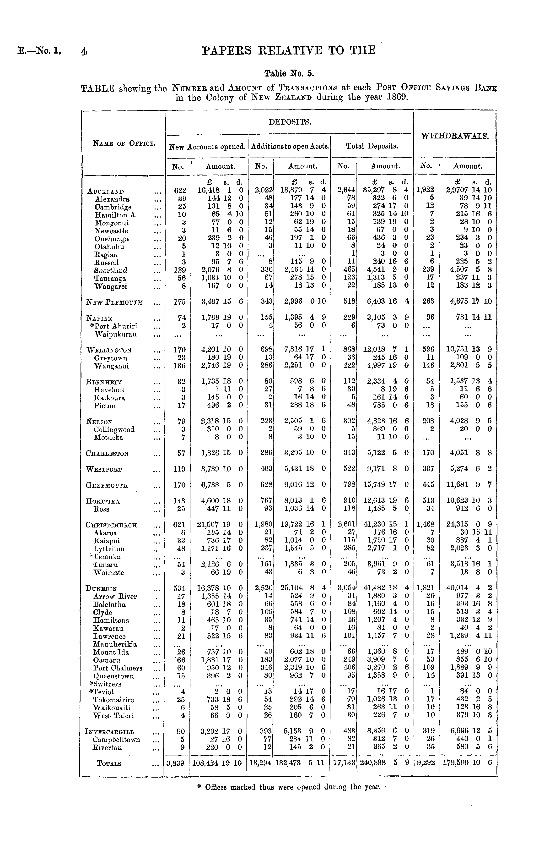 Table No. 5. TABLE shewing the Number and AMOUNT of TRANSACTIONS at each POST OFFICE SAVINGS BANK in the Colony of NEW ZEALAND during the year 1869.