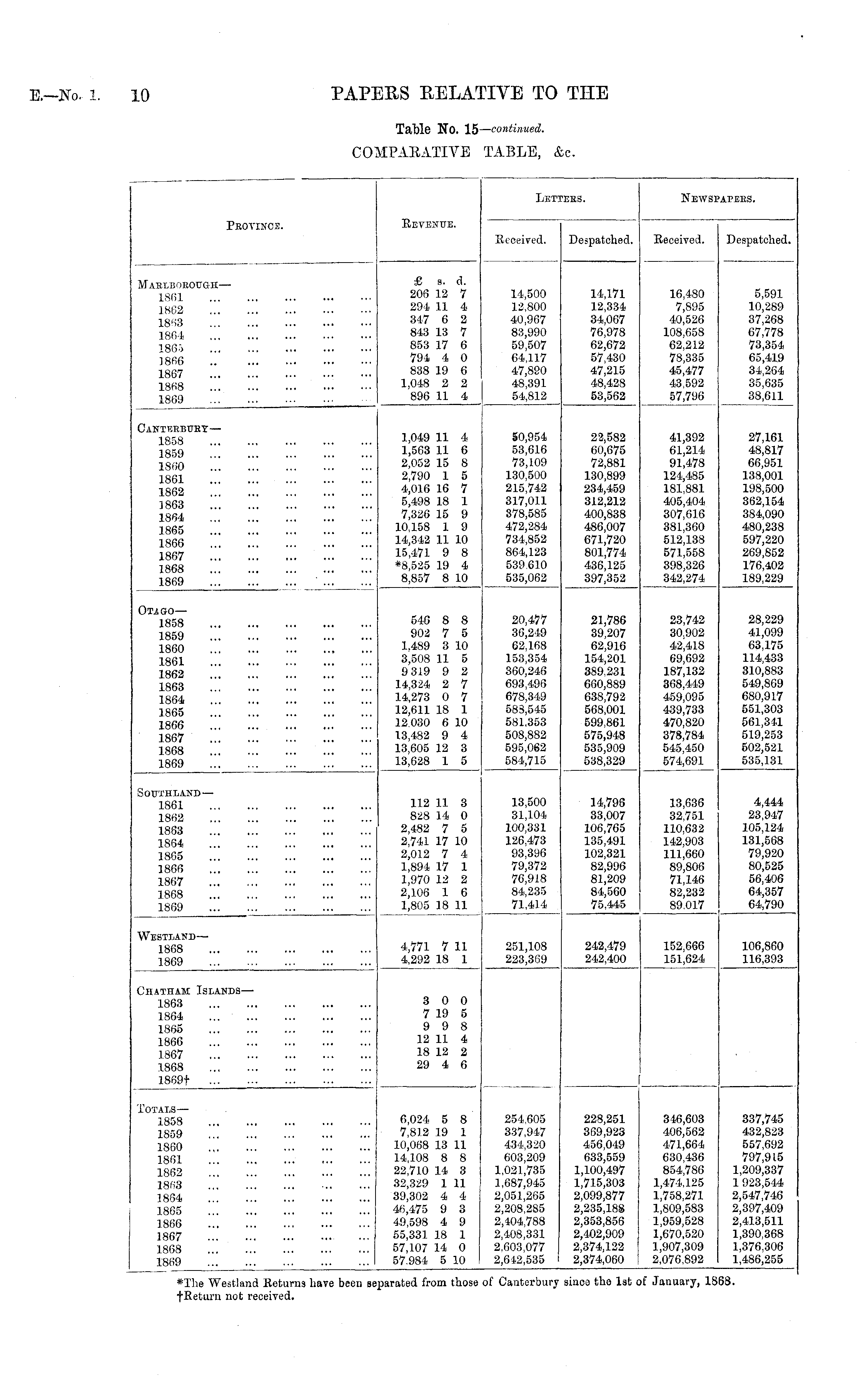 Lettees. News: ■apees. Peovince. Revenue. Received. Despatched. Received. Despatohei "aelboeough— 1861 1802 1863 1804 1865 1866 1867 1868 1869 £ a. d. 206 12 7 294 11 4 347 6 2 843 13 7 853 17 6 794 4 0 838 19 6 1,048 2 2 896 11 4 14,500 12,800 40,967 83,990 59,507 64,117 47,890 48,391 54,812 14,171 12,334 34,067 76,978 62,672 57,430 47,215 48,428 53,562 16,480 7,895 40,526 108,658 62,212 78,335 45,477 43,592 57,796 5,591 10,289 37,268 67,778 73,354 65,419 34,264 35,635 38,611 Ianteebuey— 1858 1859 1860 1861 1862 1863 1864 1865 1866 1867 1868 1869 1,049 11 4 1,563 11 6 2,052 15 8 2,790 1 5 4,016 16 7 5,498 18 1 7,326 15 9 10,158 1 9 14,342 11 10 15,471 9 8 *8,525 19 4 8,857 8 10 50,954 53,616 73,109 130,500 215,742 317,011 378,585 472,284 734,852 804,123 539.610 535,062 22,582 60,675 72,881 130,899 234,459 312,212 400,838 486,007 671,720 801,774 436,125 397,352 41,392 61,214 91,478 124,485 181,881 405,404 307,616 381,360 512,138 571,558 398,326 342,274 27,161 48,817 66,951 138,001 198,500 362,154 384,090 480,238 597,220 269,852 176,402 189,229 Otago— 1858 1859 1860 1861 1862 1863 1864 1865 1866 1867 1868 1869 546 8 8 902 7 5 1.489 3 10 3,508 11 5 9 319 9 2 14,324 2 7 14,273 0 7 12,611 18 1 12030 6 10 13,482 9 4 13,605 12 3 13,628 1 5 20,477 36,249 62,168 153,354 360,246 693,496 678,349 583,545 581,353 508,882 595,062 584,715 21,786 39,207 62,916 154,201 389,231 660,889 638,792 568,001 599,861 575,948 535,909 538,329 23,742 30,902 42,418 69,692 187,132 368,449 459,095 439,733 470,820 378,784 545,450 574,691 28,229 41,099 63,175 114,433 310,883 549,869 680,917 551,303 561,341 519,253 502,521 535,131 iOUTHLAND — 1861 1862 1863 1864 1865 1866 1867 1868 1S69 112 11 3 828 14 0 2,482 7 5 2,741 17 10 2,012 7 4 1,894 17 1 1,970 12 2 2,106 1 6 1,805 18 11 13,500 31,104 100,331 126,473 93,396 79,372 76,918 84,235 71,414 14,796 33,007 106,765 135,491 102,321 82,996 81,209 84,560 75,445 13,636 32,751 110,632 142,903 111,660 89,806 71,146 82,232 89.017 4,444 23,947 105,124 131,568 79,920 80,525 56,406 64,357 64,790 'estland— 1868 1869 4,771 7 11 4,292 18 1 251,108 223,369 242,479 242,400 152,666 151,624 106,860 116,393 Chatham Islands— 1863 1864 1865 1866 1867 1868 1869+ ... j. 3 0 0 7 19 5 9 9 8 12 11 4 18 12 2 29 4 6 Totals— 1858 1859 1860 1861 1862 1863 1864 1865 1866 1867 1868 1809 6,024 5 8 7,812 19 1 10,068 13 11 14,108 8 8 22,710 14 3 32,329 1 11 39,302 4 4 46,475 9 3 4.9,598 4 9 55,331 18 1 57,107 14 0 57,984 5 10 254,605 337,947 434,320 603,209 1,021,735 1,687,945 2,051,265 2,208,285 2,404.788 2,408,331 2,003,077 2,612,535 228,251 369,923 456,049 633,559 1,100,497 1,715,303 2,099,877 2,235,188 2,353,856 2,402,909 2,374,122 2,374,060 346,603 406,562 471,664 630,436 854,786 1,474.125 1,758,271 1,809,583 1,959,528 1,670,520 1,907,309 2,076,892 337,745 432,823 557,692 797,915 1,209,337 1 923,544 2,547,746 2,397,409 2,413,511 1,390,368 1,376,306 1,486,255 *The Westland Returns have been si +Return not received. sparated from those of Canterbur since the 1st if January, 1868.