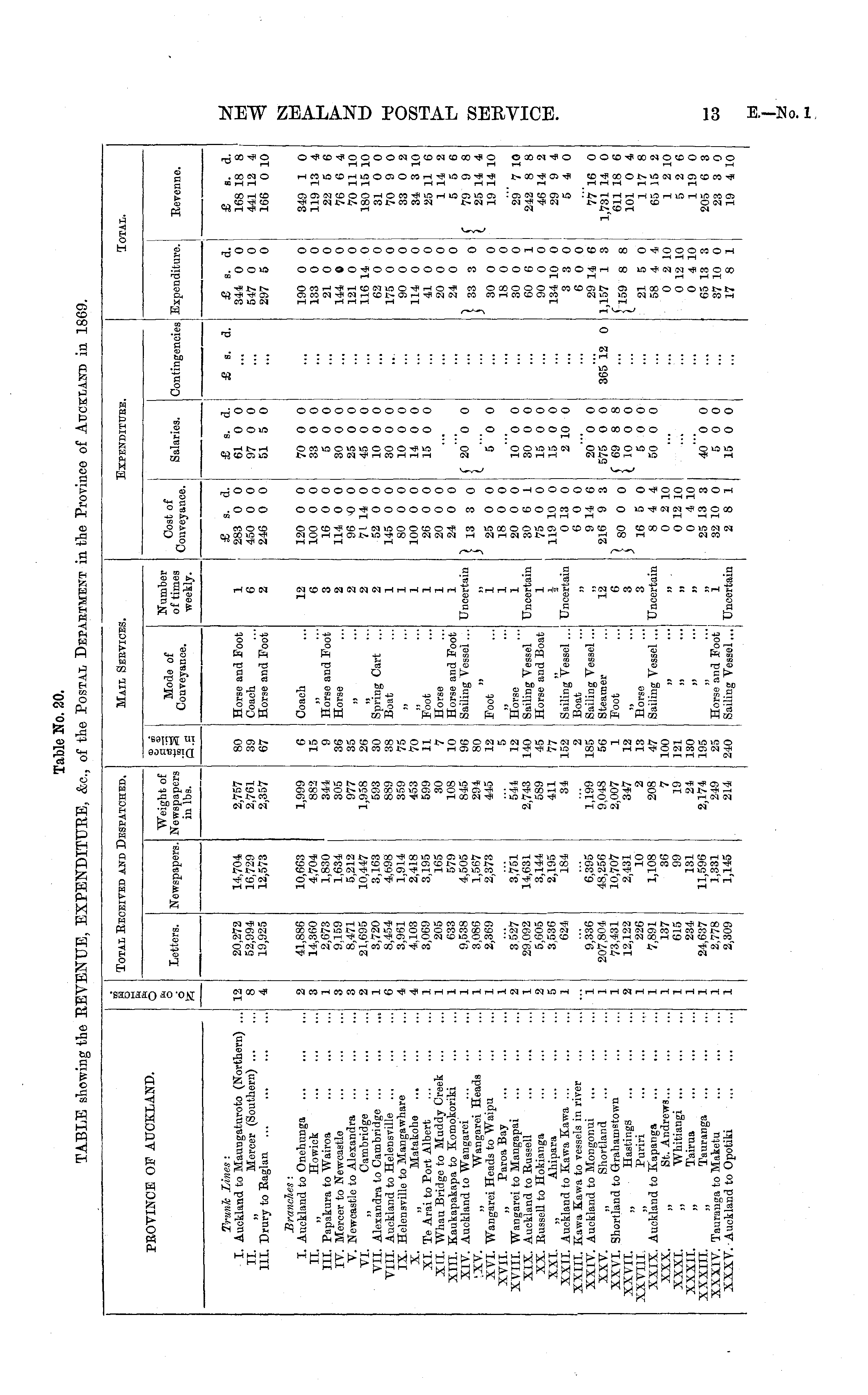 Table No. 20. TABLE showing the REVENUE, EXPENDITURE, &c, of the POSTAL Department in the Province of AUCKLAND in 1869.