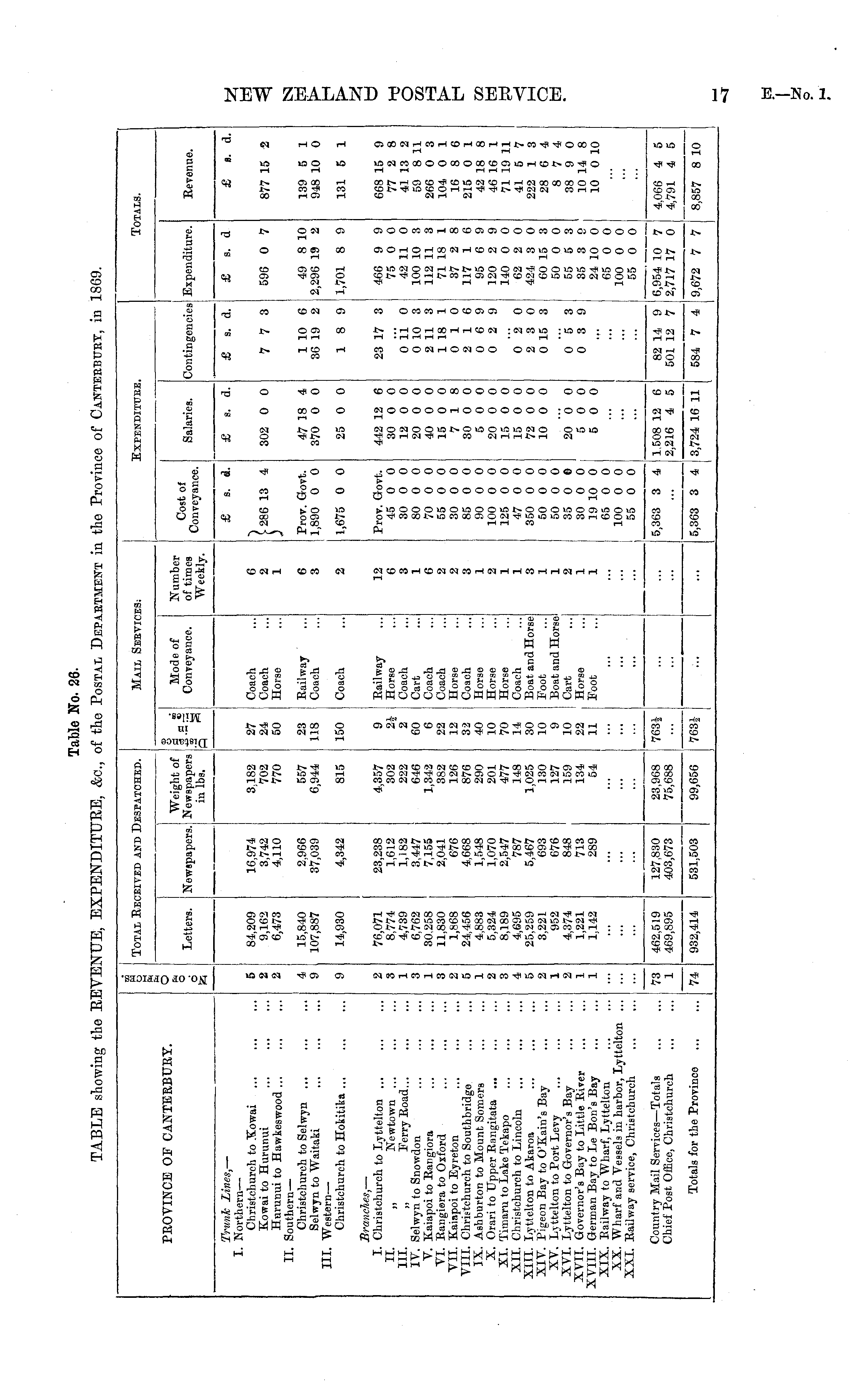 _ ft ft Total Received and Despatched. Mail SeeviceS; EXPENDITUEE. Totals. PROVINCE OF CANTERBURY. O ft o d Letters. Newspapers.: Weight of Newspapers in lbs. _> Mode of Conveyance. Number of times Weekly. Cost of Conveyance. Salaries. Contingencies Expenditure. Revenue. Trunk Lines, — I. Northern — Christchurch to Kowai ... Kowai to Hurunui Hurunui to Hawkeswood ... II. Southern — Christchurch to Selwyn ... Selwyn to Waitaki III. Western — Christchurch to Hokitika ... £ s. d. £ s. d. £ s. d. £ s. d £ s. d. 5 2 2 84,209 9,162 6,473 16,974 3,742 4,110 3,182 702 770 27 24 50 Coach Coach Horse 6 2 1 £286 13 4 302 0 0 7 7 3 596 0 7 877 15 2 4 9 15,840 107,887 2,966 37,039 557 6,944 23 i 118 j Railway ' Coach 6 3 Pro v. Govt. 1,890 0 0 47 18 4 370 0 0 1 10 6 36 19 2 49 8 10 2,296 19 2 139 5 1 948 10 0 9 14,930 4,342 815 150 Coach 2 I 1,675 0 0 25 0 0 18 9 1,701 8 9 131 5 1 Branches, — I. Christchurch to Lyttelton ... II- ,> Newtown ... HI. „ Ferry Road IV. Selwyn to Snowdon V. Kaiapoi to Rargiora VI. Rangiora to Oxford VII. Kaiapoi to Eyreton VIII. Christchurch to Southbridge IX. Ashburton to Mount Somers X. Orari to Upper Rangitata ... XI. Timaru to Lake Tekapo XII. Christchurch to Lincoln XIII. Lyttelton to Akaroa XIV. Pigeon Bay to O'Kain's Bay XV. Ljttelton to Port Levy XVI. Lyttelton to Governor's Bay XVII. Governor's Bay to Little River XVIII. German Bay to Le Bon's Bay XIX. Railway to Wharf, Lyttelton XX. Wharf and Vessels in harbor, Lyttelton ... XXI. Railway service, Christchurch 2 3 1 3 1 3 2 5 1 2 3 4 5 2 1 2 1 1 76,071 8,774 4,739 6.762 30,258 11,830 1,868 24,456 4,883 5,324 8,189 4,695 25,259 3,221 952 4,374 1,221 1,142 23,238 1,612 1,182 3,447 7,155 2,041 676 4,668 1,548 1,070 2,547 787 5,467 693 676 848 713 289 4,357 302 222 646 1,342 382 126 876 290 201 477 148 1,025 130 127 159 134 54 9 2i 2 60 6 22 12 32 40 10 70 14 30 10 9 10 22 11 Railway Horse Coach Cart Coach Coach Horse Coach Horse Horse Horse Coach Boat and Horse Foot Boat and Horse Cart ! Horse Foot 12 6 3 1 6 2 2 3 1 2 1 1 3 1 1 2 1 1 Prov. Govt. 45 0 0 30 0 0 80 0 0 70 0 0 55 0 0 30 0 0 85 0 0 90 0 0 100 0 0 125 0 0 47 0 0 350 0 0 50 0 0 50 0 0 35 0 0 30 0 0 19 10 0 65 0 0 100 0 0 55 0 0 442 12 6 30 0 0 12 0 0 20 0 0 40 0 0 15 0 0 7 18 30 0 0 5 0 0 20 0 0 15 0 0 15 0 0 72 0 0 10 0 0 23 17 3 0 11 0 0 10 3 2 11 3 1 18 1 0 10 2 16 0 6 9 0 2 9 466 9 9 75 0 0 42 11 0 100 10 3 112 11 3 71 18 1 37 2 8 117 1 6 95 6 9 120 2 9 140 0 0 62 2 0 424 3 0 60 15 3 50 0 0 55 5 3 35 3 9 24 10 0 65 0 0 100 0 0 55 0 0 668 15 9 77 2 8 41 13 2 59 8 11 266 0 3 104 0 1 16 8 6 215 0 1 42 18 8 46 16 1 71 19 11 41 5 7 222 1 3 28 6 4 8 7 4 38 9 0 10 14 8 10 0 10 0 2 0 2 3 0 0 15 3 20 0 0 5 0 0 5 0 0 0 5 3 0 3 9 ... | I - ... ... I • ... Country Mail Services —Totals Chief Post Office, Christchurch 73 1 462,519 469,895 127,830 403,673 ' "I 23,968 75,688 763| I 5,363 3 4 1,508 12 6 2,216 4 5 82 14 9 501 12 7 I 6,954 10 7 2,717 17 0 4,066 4 5 4,791 4 5 8,857 8 10 ... Totals for the Province 74 | 763i 584 7 4 9,672 7 7 932,414 531,503 99,656 ... 5,363 3 4 3,724 16 11