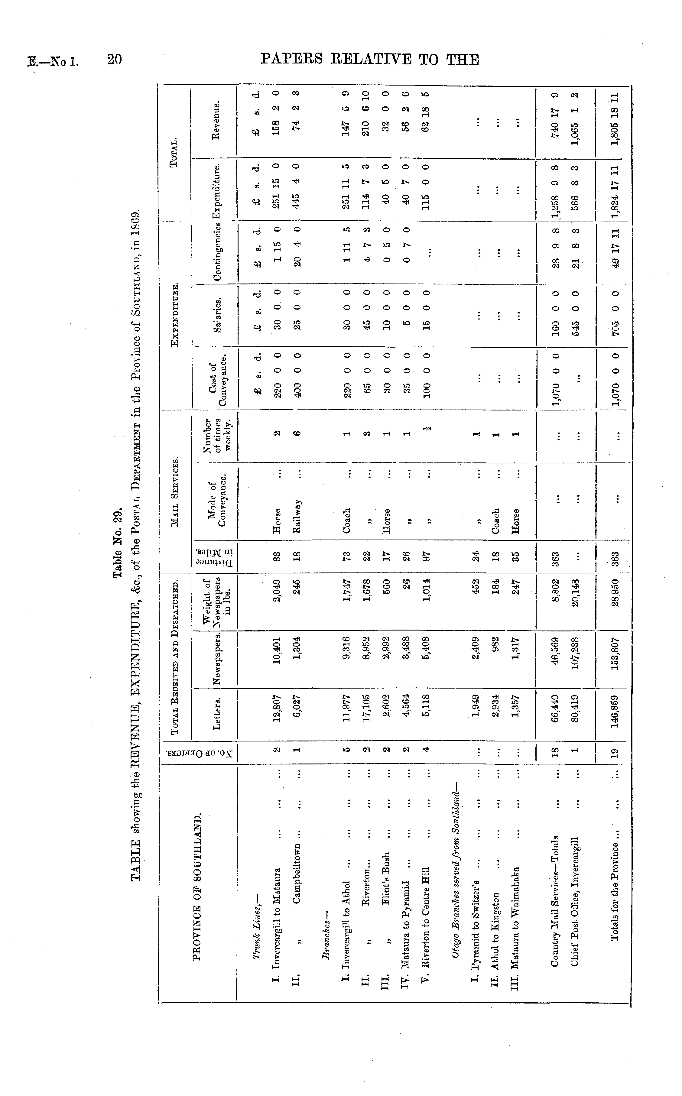 Table No. 29. TABLE showing the REVENUE, EXPENDITURE, &c, of the POSTAL DEPARTMENT in the Province of SOUTHLAND, in 1869.