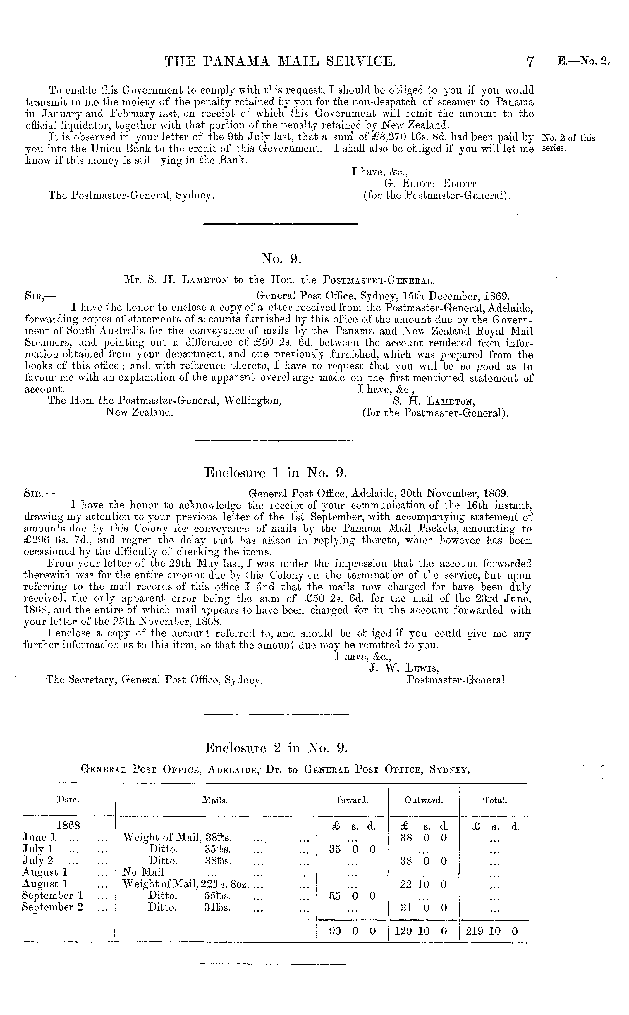 Enclosure 1 in No. 9. Sir, — General Post Office, Adelaide, 30th November, 1869. I have the honor to acknowledge the receipt of your communication of the 16th instant, drawing my attention to your previous letter of the Ist September, with accompanying statement of amounts due by this Colony for conveyance of mails by the Panama Mail Packets, amounting to £296 6s. 7d., and regret the delay that has arisen in replying thereto, which however has been occasioned by the difficulty of checking the items. From your letter of the 29th May last, I was under the impression that the account forwarded therewith was for the entire amount due by this Colony on the termination of the service, but upon referring to the mail records of this office I find that the mails now charged for have been duly received, the only apparent error being the sum of £50 2s. 6d. for the mail of the 23rd June, 1868, and the entire of which mail appears to have been charged for in the account forwarded with your letter of the 25th November, 1868. I enclose a copy of the account referred to, and should be obliged if you could give me any further information as to this item, so that the amount due may be remitted to you. I have, &c., J. W. Lewis, The Secretary, General Post Office, Sydney. Postmaster-General.