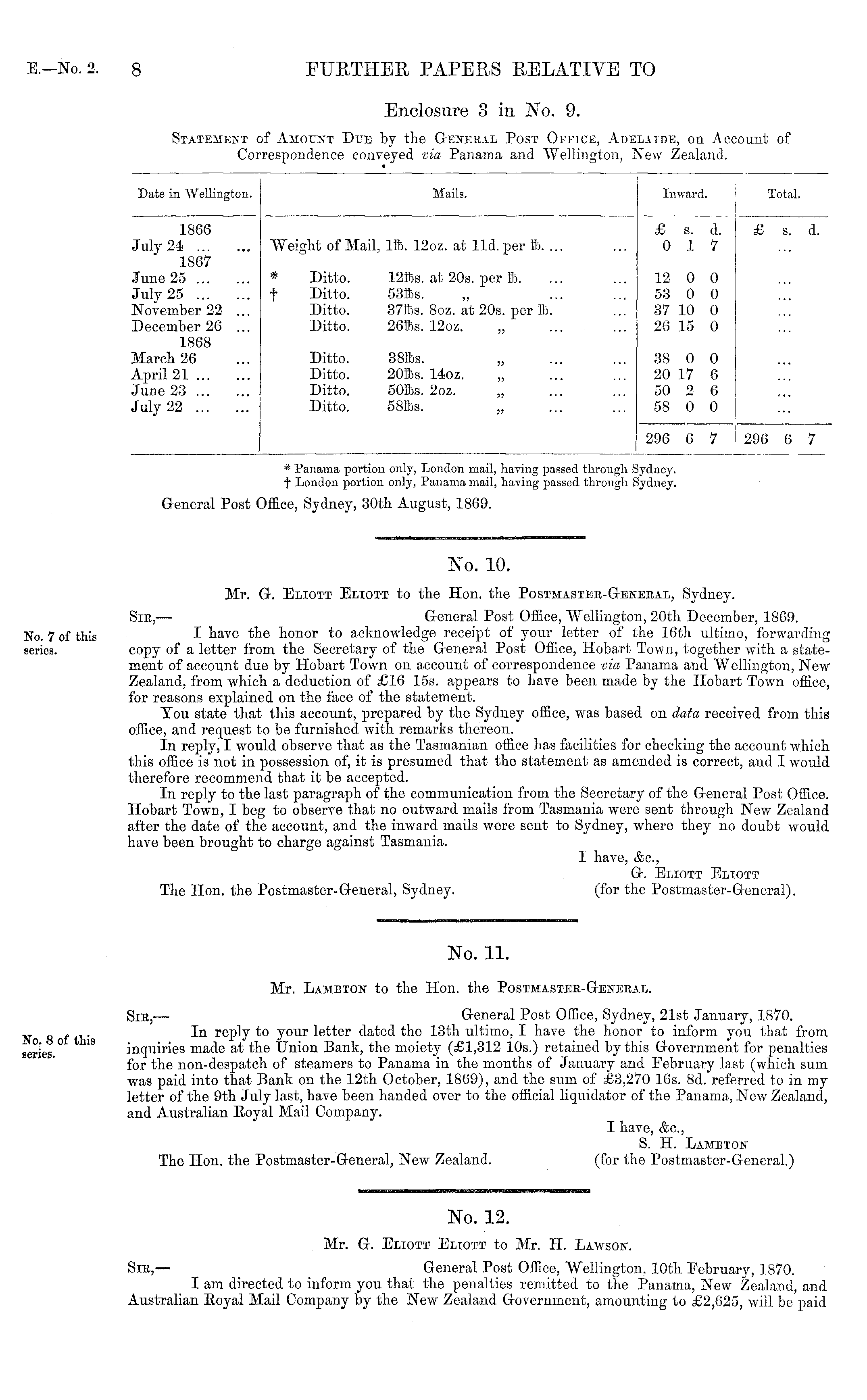 No. 12. Mr. G. Eliott Eliott to Mr. H. Lawson. Sir, — General Post Office, Wellington, 10th February, 1870. I am directed to inform you that the penalties remitted to the Panama, New Zealand, and Australian Eoyal Mail Company by the New Zealand Government, amounting to £2,625, will be paid