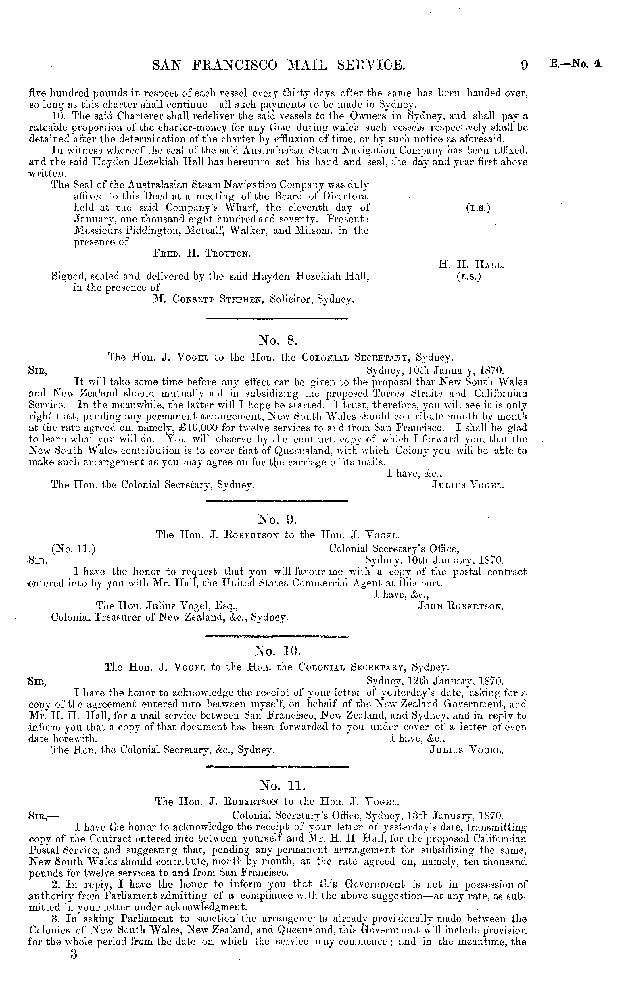 No. 10. The Hon. J. Vogel to the Hon. the Colonial Secretary, Sydney. Sir, — Sydney, 12th January, 1870. I have tho honor to acknowledge the receipt of your letter of yesterday's date, asking for a copy of the agreement entered into between myself, on behalf of the New Zealand Government, and Mr. H. H. Hall, for a mail service between San Erancisco, New Zealand, and Sydney, and in reply to inform you that a copy of that document has been forwarded to you under cover of a letter of even date herewith. 1 have, &c, The Hon. the Colonial Secretary, See., Sydney. Julius Vogel.