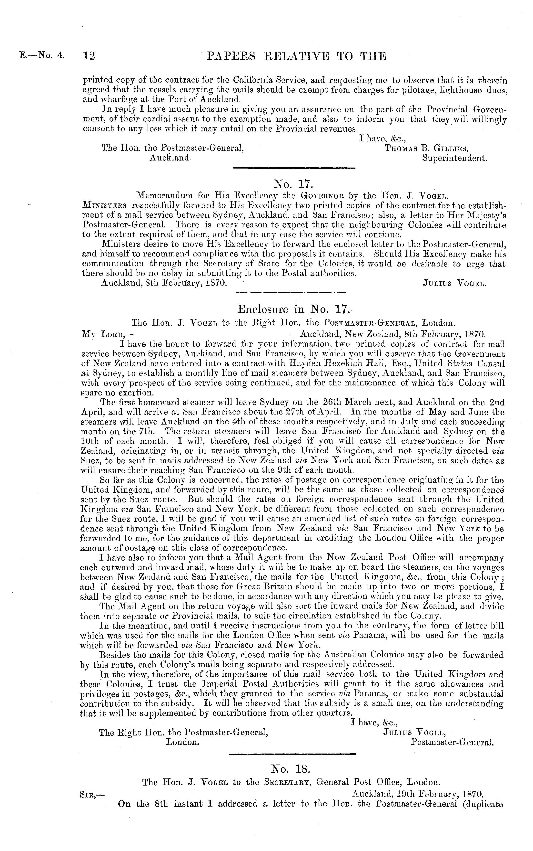 No. 18. The Hon. J. Vogel to the Secretary, General Post Office, London. Sir, — Auckland, 19th February, 1870. On the Bth instant I addressed a letter to the Hon. the Postmaster-General (duplicate