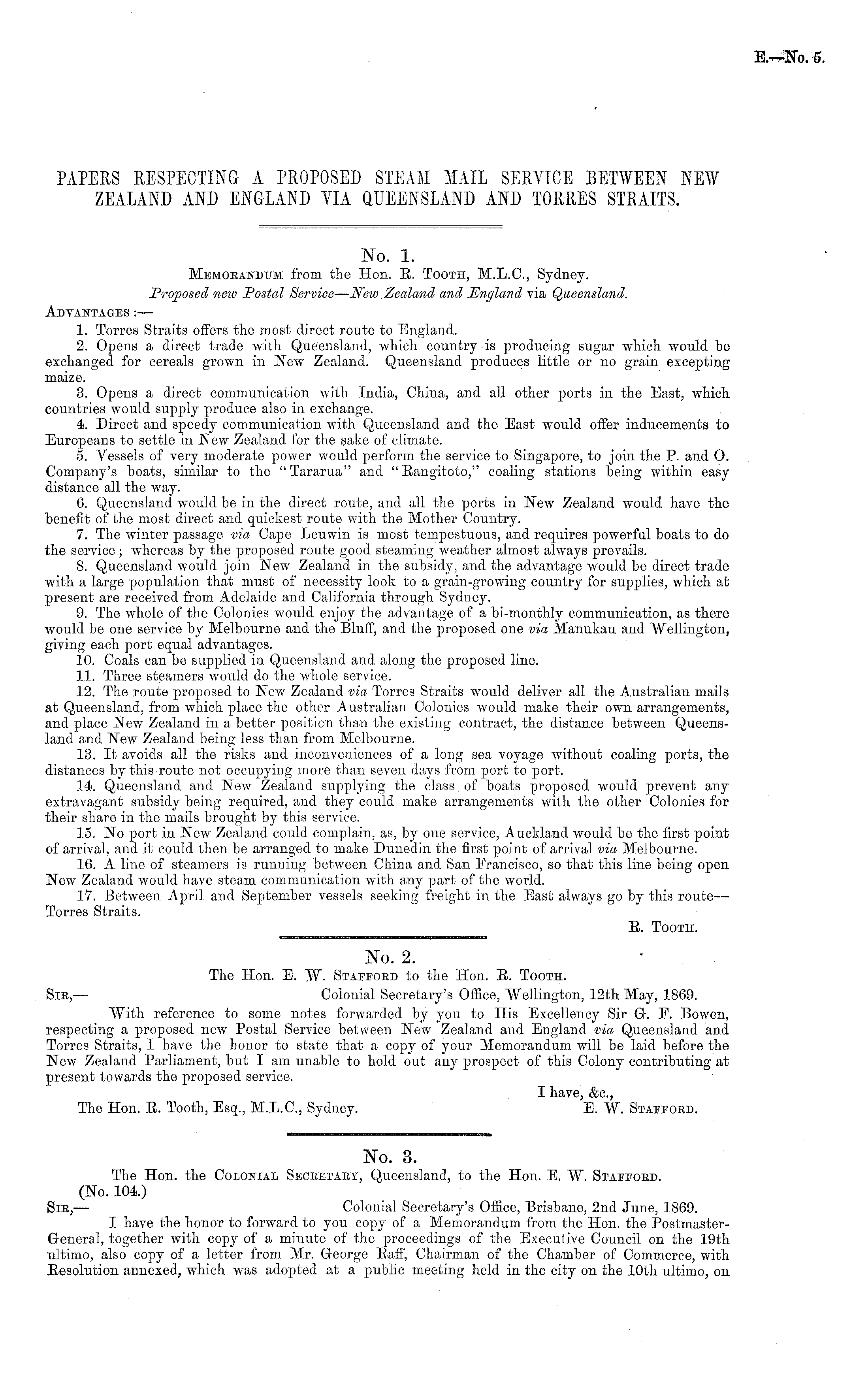 No. 1. Memorandum from tho Hon. B. Tooth, M.L.C., Sydney. Proposed new Postal Service — New Zealand and England via Queensland. Advantages :— 1. Torres Straits offers the most direct route to England. 2. Opens a direct trade with Queensland, which country-is producing sugar which would be exchanged for cereals grown in New Zealand. Queensland produces little or no grain excepting maize. 3. Opens a direct communication with India, China, and all other ports in the East, which countries would supply produce also in exchange. 4. Direct and speedy communication with Queensland and the East would offer inducements to Europeans to settle in New Zealand for the sake of climate. 5. Vessels of very moderate power would perform the service to Singapore, to join the P. and 0. Company's boats, similar to the "Tararua" and " Bangitoto," coaling stations being within easy distance all the way. 6. Queensland would be in the direct route, and all the ports in New Zealand would have the benefit of the most direct and quickest route with the Mother Country. 7. The winter passage via Cape Leuwin is most tempestuous, and requires powerful boats to do the service; whereas by the proposed route good steaming weather almost always prevails. 8. Queensland would join New Zealand in the subsidy, and the advantage would be direct trade with a large population that must of necessity look to a grain-growing country for supplies, which at present are received from Adelaide and California through Sydney. 9. The whole of the Colonies would enjoy the advantage of a bi-monthly communication, as there would be one service by Melbourne and the Bluff, and the proposed one via Manukau and Wellington, giving each port equal advantages. 10. Coals can be supplied in Queensland and along the proposed line. 11. Three steamers would do the whole service. 12. The route proposed to New Zealand via Torres Straits would deliver all the Australian mails at Queensland, from which place the other Australian Colonies would make their own arrangements, and place New Zealand in a better position than the existing contract, the distance between Queensland and New Zealand being less than from Melbourne. 13. It avoids all the risks and inconveniences of a long sea voyage without coaling ports, the distances by this route not occupying more than seven days from port to port. 14. Queensland and New Zealand supplying the class of boats proposed would prevent any extravagant subsidy being required, and they could make arrangements with the other Colonies for their share in the mails brought by this service. 15. No port in New Zealand could complain, as, by one service, Auckland would be the first point of arrival, and it could then be arranged to make Dunedin the first point of arrival via Melbourne. 16. A line of steamers is running between China and San Francisco, so that this line being open New Zealand would have steam communication with any part of the world. 17. Between April and September vessels seeking freight in the East always go by this route — Torres Straits. B. Tooth.