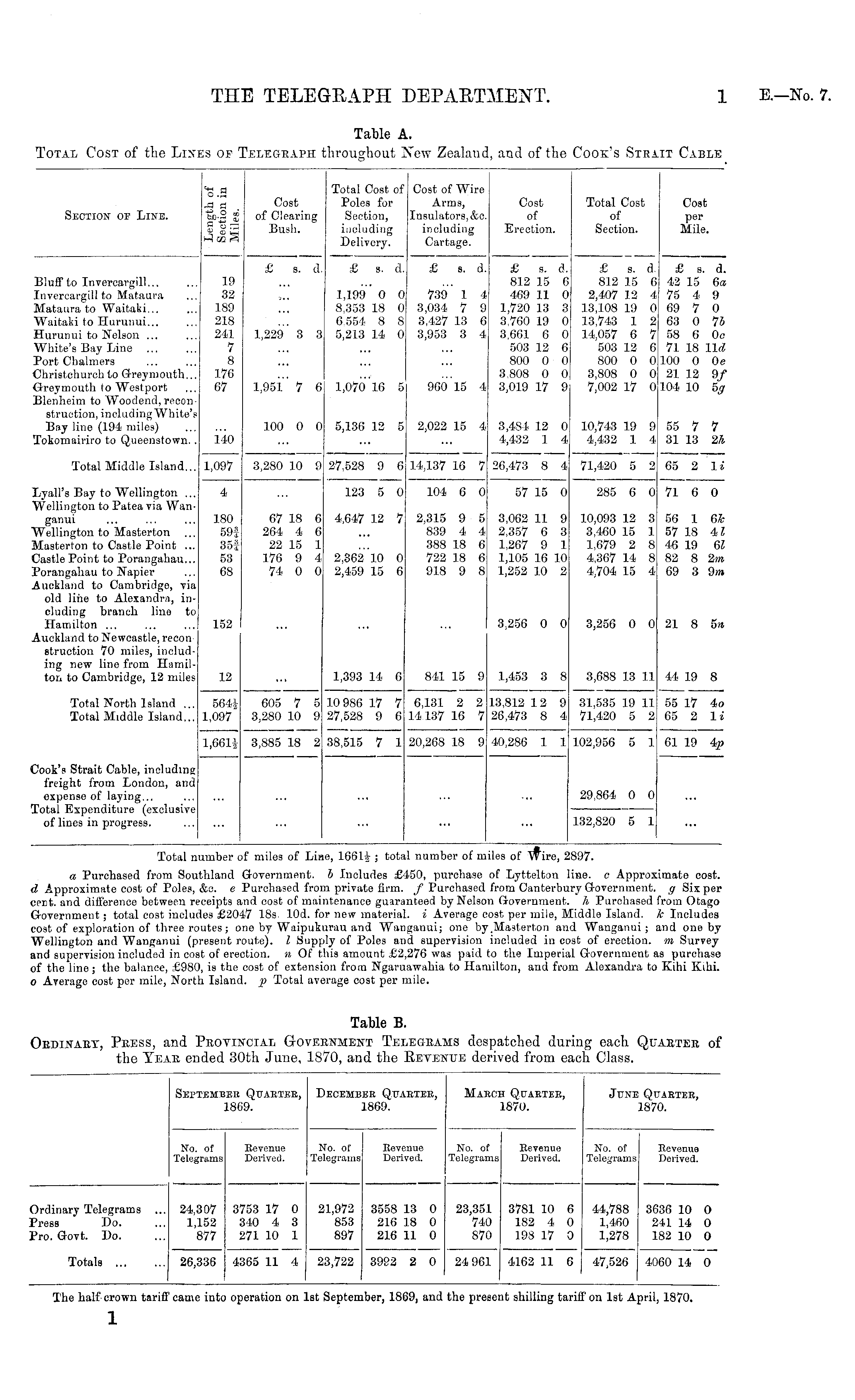 Section op Line. =+« a o.9 M CO r3 Cost of Clearing Bush. Total Cost of Poles for Section, including Delivery. Cost of Wire Arms, Insulators, &o. including Cartage. Cost of Erection. Total Cost of Section. Cost per Mile. Bluff to Invercargill... Invercargill to Mataura Mataura to Waitaki... W raitaki to Hurunui... Hurunui to Nelson ... White's Bay Line Port Chalmers Christchurch to Greymouth... Greymouth to Westport Blenheim to Woodend,reconstruction, including White's Bay line (194 miles) Tokomairiro to Queenstown. . 19 32 189 218 241 7 8 176 67 £ s. d. 1,229' 3 3 £ s. d. 1,199 0 0 8,353 18 0 6.554 8 8 5,213 14 0 £ s. d. 739 1 4 3,034 7 9 3,427 13 6 3,953 3 4 £ s. d. 812 15 6 469 11 0 1,720 13 3 3,760 19 0 3,661 6 0 503 12 6 800 0 0 3,808 0 0 3,019 17 9 £ s. d. 812 15 6 2,407 12 4 13,108 19 0 13,743 1 2 14,057 6 7 503 12 6 800 0 0 3,808 0 0 7,002 17 0 £ s. d. 42 15 6a 75 4 9 69 7 0 63 0 71 58 6 0c 71 18 lid 100 0 Oe 21 12 9/ 104 10 5> 1,951' 7 6 1,070 16 5 960 15 4 140 100 0 0 5,136 12 5 2,022 15 4 3,484 12 0 4,432 1 4 10,743 19 9 4,432 1 4 55 7 7 31 13 2h Total Middle Island... 1,097 3,280 10 9 27,528 9 6 14,137 16 7 26,473 8 4 71,420 5 2 65 2 li Lyall's Bay to Wellington ... Wellington to Patea via Wanganui Wellington to Masterton Masterton to Castle Point ... Castle Point to Porangahau... Porangahau to Napier Auckland to Cambridge, via old line to Alexandra, including branch line to Hamilton ... Auckland to Newcastle, recon struction 70 miles, including new line from Hamilton to Cambridge, 12 miles 4 180 59| 35f 53 68 67 18 6 264 4 6 22 15 1 176 9 4 74 0 0 123 5 0 4,647 12 7 2,362 10 0 2,459 15 6 104 6 0 2,315 9 5 839 4 4 388 18 6 722 18 6 918 9 8 57 15 0 3,062 11 9 2,357 6 3 1,267 9 1 1,105 16 10 1,252 10 2 285 6 0 10,093 12 3 3,460 15 1 1,679 2 8 4,367 14 8 4,704 15 4 71 6 0 56 1 etc 57 18 4Z 46 19 61 82 8 2m 69 3 9m 152 3,256 0 0 3,256 0 0 21 8 5» 1,393 14 6 841 15 9 1,453 3 8 3,688 13 11 44 19 8 12 Total North Island ... Total Middle Island... 5641 1,097 605 7 5 3,280 10 9 10 986 17 7 27,528 9 6 6,131 2 2 1-4137 16 7 13,812 12 9 26,473 8 4 31,535 19 11 71,420 5 2 55 17 4o 65 2 li 1,6611 3,885 18 2 38,515 7 1 20,268 18 9 40,286 1 1 102,956 5 1 61 19 4p look's Strait Cable, including freight from London, and expense of laying... 'otal Expenditure (exclusive of lines in progress. 29,864 0 0 132,820 5 1 Total number of miles of Line, 1661 \ ; tot! Government, b Includes £ Purchased from private firm, and cost of maintenance guar; )47 18s. lOd. for new materia one by Waipukurau and Wai route), t Supply of Poles ai ection. n Of this amount £2 ? cost of extension from Ngan id. p Total average cost per tal number of miles of Wire, 2897. a Purchased from Southland d Approximate cost of Poles, &e. e cert, and difference between receipts : Government; total cost includes £20 cost of exploration of three routes ; ( Wellington and Wanganui (present ] and supervision included in cost of ore of the line; the balance, £980, is the o Average cost per mile, North Islan £450, purchase of Lyttelton line, c Approximate cost, a. f Purchased from Canterbury Government, g Six per ranteed by Nelson Government, h Purchased from Otago al. i Average cost per mile, Middle Island, h Includes inganui; one by.Masterton and Wanganui; and one by ind supervision included in cost of erection, m Survey !2,276 was paid to the Imperial Government as purchase ruawahia to Hamilton, and from Alexandra to Kihi Kihi. ' mile. Oedinaet, Press, and Provi the Year ended 3 Table B B. ncial Government Te: iOth June, 1870, and the 3LEGEAMS despatched during each Quarter of ; Revenue derived from each Class. Septemb: EE Qr/AKTEE, .869. Decemb: !E Q.l .869. FAETEE, Maec: : QuAETEE, .870. Jun: QtJAETEE, ,870. No. of Telegrams Revenue Derived. No. Of Telegrams Revenue Derived. No. of Telegrams Revenue Derived. No. of Telegrams Revenue Derived. )rdinary Telegrams 'ress Do. 'ro. Govt. Do. 24,307 1,152 877 3753 17 0 340 4 3 271 10 1 21,972 853 897 3558 13 0 216 18 0 216 11 0 23,351 740 870 3781 10 6 182 4 0 198 17 0 44,788 1,460 1,278 3636 10 O 241 14 0 182 10 0 Totals ... 26,336 4365 11 4 23,722 3992 2 0 24 961 4162 11 6 47,526 4060 14 0 The half crown tariff came inti operation on 1st Septei iber, 1869, and the present shilling tariff on 1st A] iril, 1870.