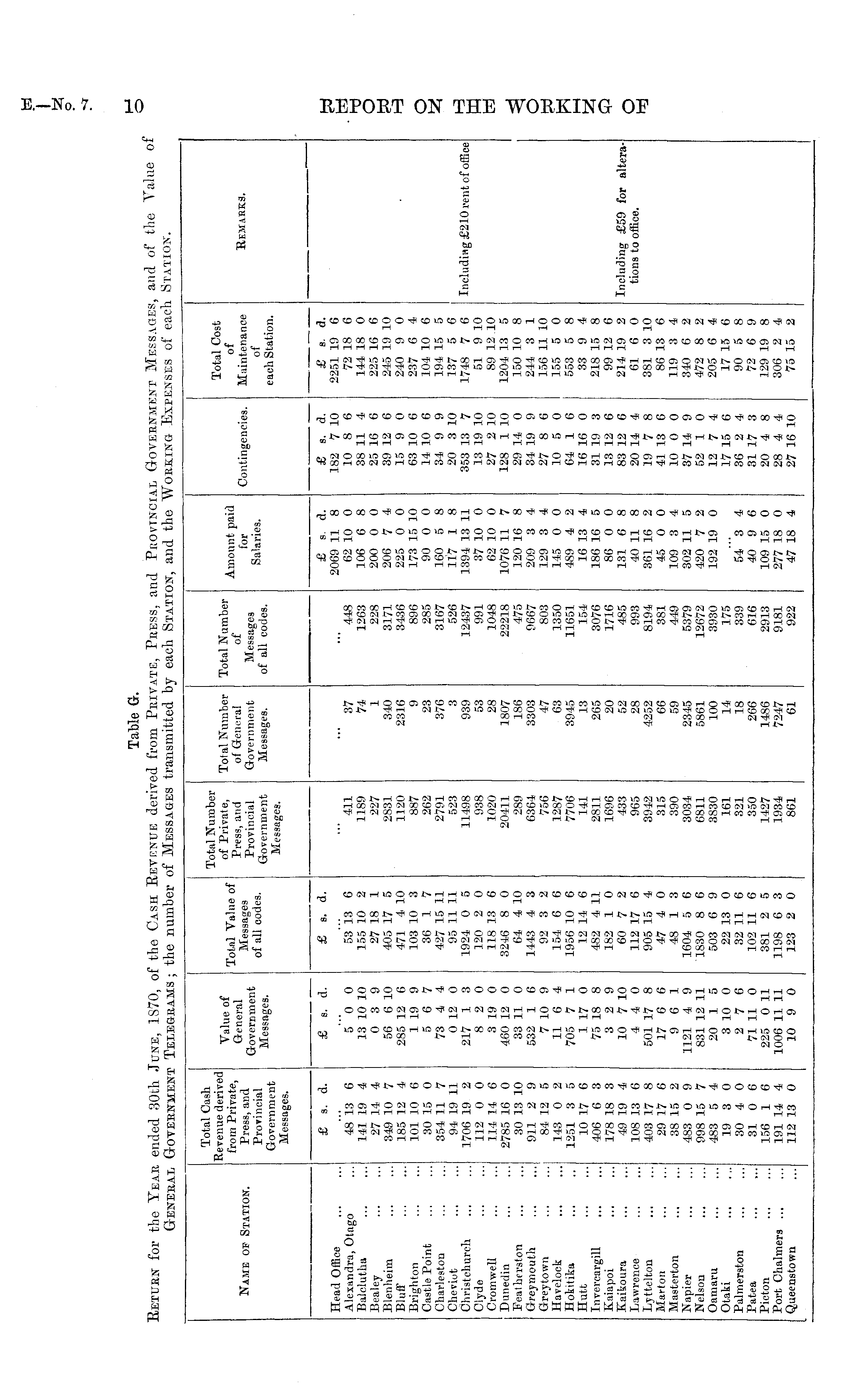 Table G. RETURN for the YEAR ended 30th JUNE, 1870, of the CASH REVENUE derived from PRIVATE, PRESS, and PROVINCIAL GOVERNMENT MESSAGES, and of the Value of GENERAL GOVERNMENT TELEGRAMS; the number of MESSAGES transmitted by each STATION, and the WORKING EXPENSES