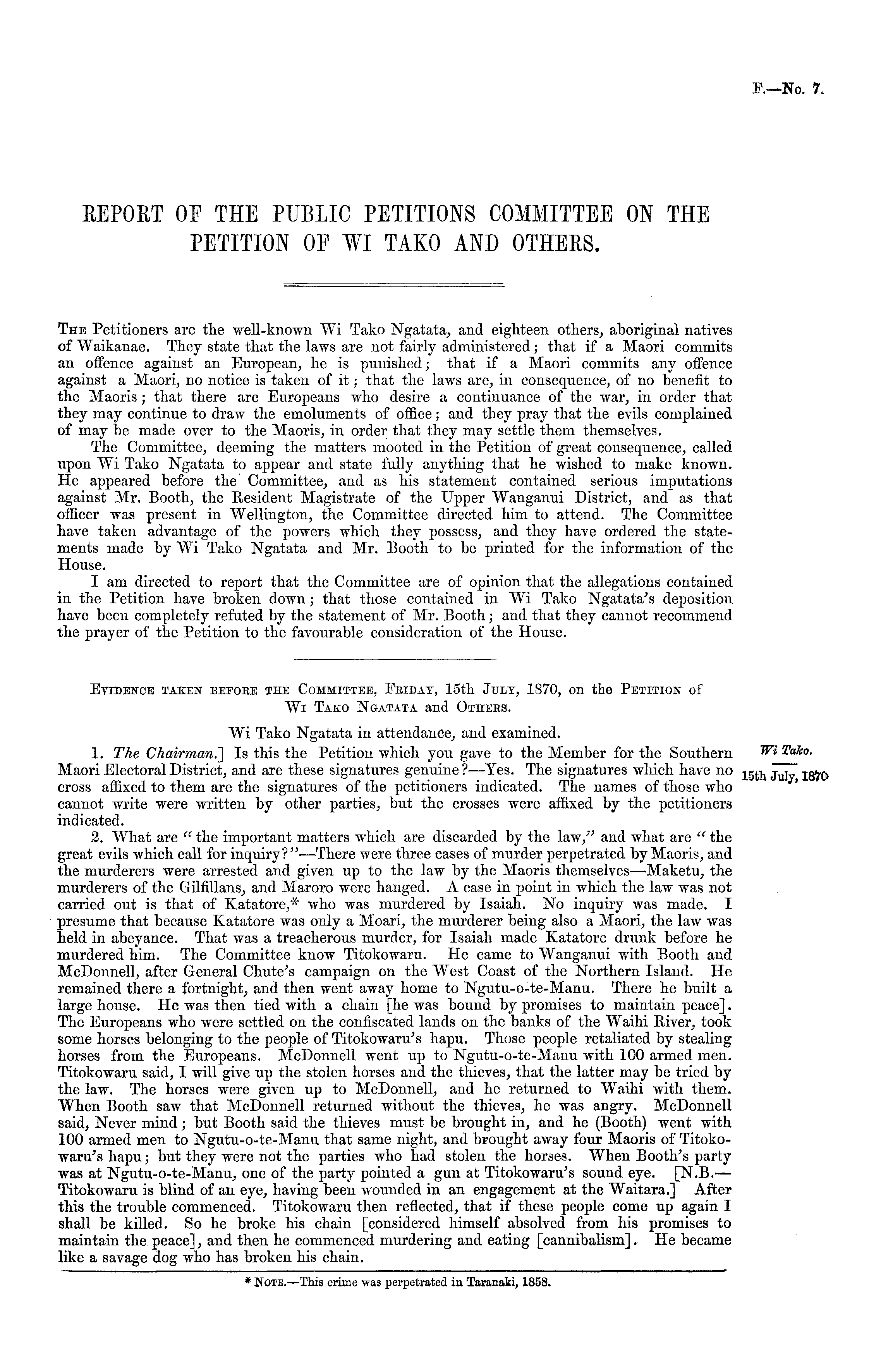 Evidence taken beeoee the Committee, Feiday, 15th July, 1870, on the Petition of Wi Tako Noatata and Othees. Wi Tako Ngatata in attendance, and examined. 1. The Chairman?] Is this the Petition which you gave to the Member for the Southern Maori Electoral District, and are these signatures genuine ?—Yes. The signatures which have no cross affixed to them are the signatures of the petitioners indicated. The names of those who cannot write were written by other parties, but the crosses were affixed by the petitioners indicated. 2. What are " the important matters which are discarded by the law/ and what are " the great evils which call for inquiry?"— There were three cases of murder perpetrated by Maoris, and the murderers were arrested and given up to the law by the Maoris themselves—Maketu, the murderers of the Gilfillans, and Maroro were hanged. A case in point in which the law was not carried out is that of Katatore,* who was murdered by Isaiah. No inquiry was made. I presume that because Katatore was only a Moari, the murderer being also a Maori, the law was held in abeyance. That was a treacherous murder, for Isaiah made Katatore drunk before he murdered him. The Committee know Titokowaru. He came to Wanganui with Booth and McDonnell, after General Chute's campaign on the West Coast of the Northern Island. He remained there a fortnight, and then went away home to Ngutu-o-te-Manu. There he built a large house. He was then tied with a chain [he was bound by promises to maintain peace]. The Europeans who were settled on the confiscated lands on the banks of the Waihi River, took some horses belonging to the people of Titokowaru''s hapu. Those people retaliated by stealing horses from the Europeans. McDonnell went up to Ngutu-o-te-Manu with 100 armed men. Titokowaru said, I will give up the stolen horses and the thieves, that the latter may be tried by the law. The horses were given up to McDonnell, and he returned to Waihi with them. When Booth saw that McDonnell returned without the thieves, he was angry. McDonnell said, Never mind; but Booth said the thieves must be brought in, and he (Booth) went with 100 armed men to Ngutu-o-te-Manu that same night, and brought away four Maoris of Titokowaru's hapu; but they were not the parties who had stolen the horses. When Booth's party was at Ngutu-o-te-Manu, one of the party pointed a gun at Titokowaru's sound eye. [N.B. — Titokowaru is blind of an eye, having been wounded in an engagement at the Waitara.] After this the trouble commenced. Titokowaru then reflected, that if these people come up again I shall be killed. So he broke his chain [considered himself absolved from his promises to maintain the peace], and then he commenced murdering and eating [cannibalism]. He became like a savage dog who has broken his chain. * Note. —This crime was perpetrated in Taranaki, 1858.