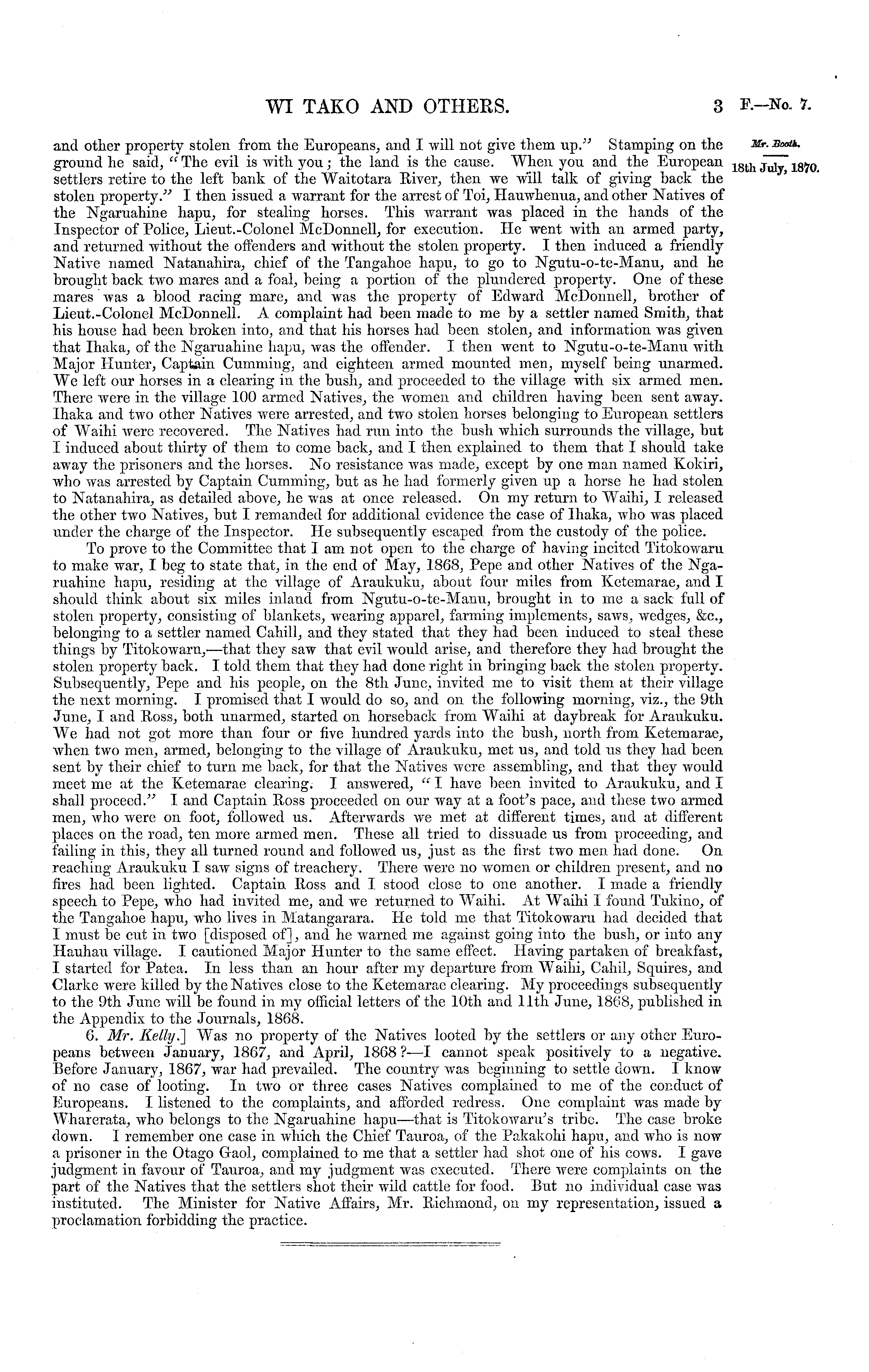 and other property stolen from the Europeans, and I will not give them up." Stamping on the ground he said, " The evil is with you ; the land is the cause. When you and the European settlers retire to the left bank of the Waitotara River, then we will talk of giving back the stolen property.'" I then issued a warrant for the arrest of Toi, Hauwhenua, and other Natives of the Ngaruahine hapu, for stealing horses. This warrant was placed in the hands of the Inspector of Police, Lieut.-Colonel McDonnell, for execution. He went with an armed party, and returned without the offenders and without the stolen property. I then induced a friendly Native named Natanahira, chief of the Tangahoe hapu, to go to Ngutu-o-te-Manu, and he brought back two mares and a foal, being a portion of the plundered property. One of these mares was a blood racing mare, and was the property of Edward McDonnell, brother of Lieut.-Colonel McDonnell. A complaint had been made to me by a settler named Smith, that his house had been broken into, and that his horses had been stolen, and information was given that Ihaka, of the Ngaruahine hapu, was the offender. I then went to Ngutu-o-te-Manu with Major Hunter, Captain Cumming, and eighteen armed mounted men, myself being unarmed. We left our horses in a clearing in the bush, and proceeded to the village with six armed men. There were in the village 100 armed Natives, the women and children having been sent away. Ihaka and two other Natives were arrested, and two stolen, horses belonging to European settlers of Waihi were recovered. The Natives had run into the bush which surrounds the village, but I induced about thirty of them to come back, and I then explained to them that I should take away the prisoners and the horses. No resistance was made, except by one man named Kokiri, who was arrested by Captain Gumming, but as he had formerly given up a horse he had stolen to Natanahira, as detailed above, he was at once released. On my return to Waihi, I released the other two Natives, but I remanded for additional evidence the case of Ihaka, who was placed tinder the charge of the Inspector. He subsequently escaped from the custody of the police. To prove to the Committee that I am not open to the charge of having incited Titokowaru to make war, I beg to state that, in the end of May, 1868, Pepe and other Natives of the Ngaruahine hapu, residing at the village of Araukuku, about four miles from Ketemarae, and I should think about six miles inland from Ngutu-o-te-Manu, brought in to me a sack full of stolen property, consisting of blankets, wearing apparel, farming implements, saws, wedges, &c, belonging to a settler named Cahill, and they stated that they had been induced to steal these things by Titokowarn, —that they saw that evil would arise, and therefore they had brought the stolen property back. I told them that they had done right in bringing back the stolen property. Subsequently, Pepe and his people, on the Bth June, invited me to visit them at their village the next morning. I promised that I would do so, and on the following morning, viz., the 9th June, I and Ross, both unarmed, started on horseback from Waihi at daybreak for Araukuku. We had not got more than four or five hundred yards into the bush, north from Ketemarae, when two men, armed, belonging to the village of Araukuku, met us, and told us they had been sent by their chief to turn me back, for that the Natives were assembling, and that they would meet me at the Ketemarae clearing. I answered, " I have been invited to Araukuku, and I shall proceed." I and Captain Ross proceeded on our way at a foot's pace, and these two armed men, who were on foot, followed us. Afterwards we met at different times, and at different places on the road, ten more armed men. These all tried to dissuade us from proceeding, and failing in this, they all turned round and followed us, just as the first two men had done. On reaching Araukuku I saw signs of treachery. There were no women or children present, and no fires had been lighted. Captain Ross and I stood close to one another. I made a friendly speech to Pepe, who had invited me, and we returned to Waihi. At Waihi I found Tukino, of the Tangahoe hapu, who lives in Matangarara. He told me that Titokowaru had decided that I must be cut in two [disposed of], and he warned me against going into the bush, or into any Hauhau village. I cautioned Major Hunter to the same effect. Having partaken of breakfast, I started for Patea. In less than an hour after my departure from Waihi, Cahil, Squires, and Clarke were killed by the Natives close to the Ketemarae clearing. My proceedings subsequently to the 9th June will be found in my official letters of the 10th and 11th June, 1868, published in the Appendix to the Journals, 1868. 6. Mr. Kelly. ,] Was no property of the Natives looted by the settlers or any other Europeans between January, 1867, and April, 1868 ?-—I cannot speak positively to a negative. Before January, 1867, war had prevailed. The country was beginning to settle clown. I know of no case of looting. In two or three cases Natives complained to me of the conduct of Europeans. I listened to the complaints, and afforded redress. One complaint was made by Wharerata, who belongs to the Ngaruahine hapu—that is Titokowaru's tribe. The case broke down. I remember one case in which the Chief Tauroa, of the Pakakohi hapu, and who is now a prisoner in the Otago Gaol, complained to me that a settler had shot one of his cows. I gave judgment in favour of Tauroa, and my judgment was executed. There were complaints on the part of the Natives that the settlers shot their wild cattle for food. But no individual case was instituted. The Minister for Native Affairs, Mr. Richmond, on my representation, issued a proclamation forbidding the practice.