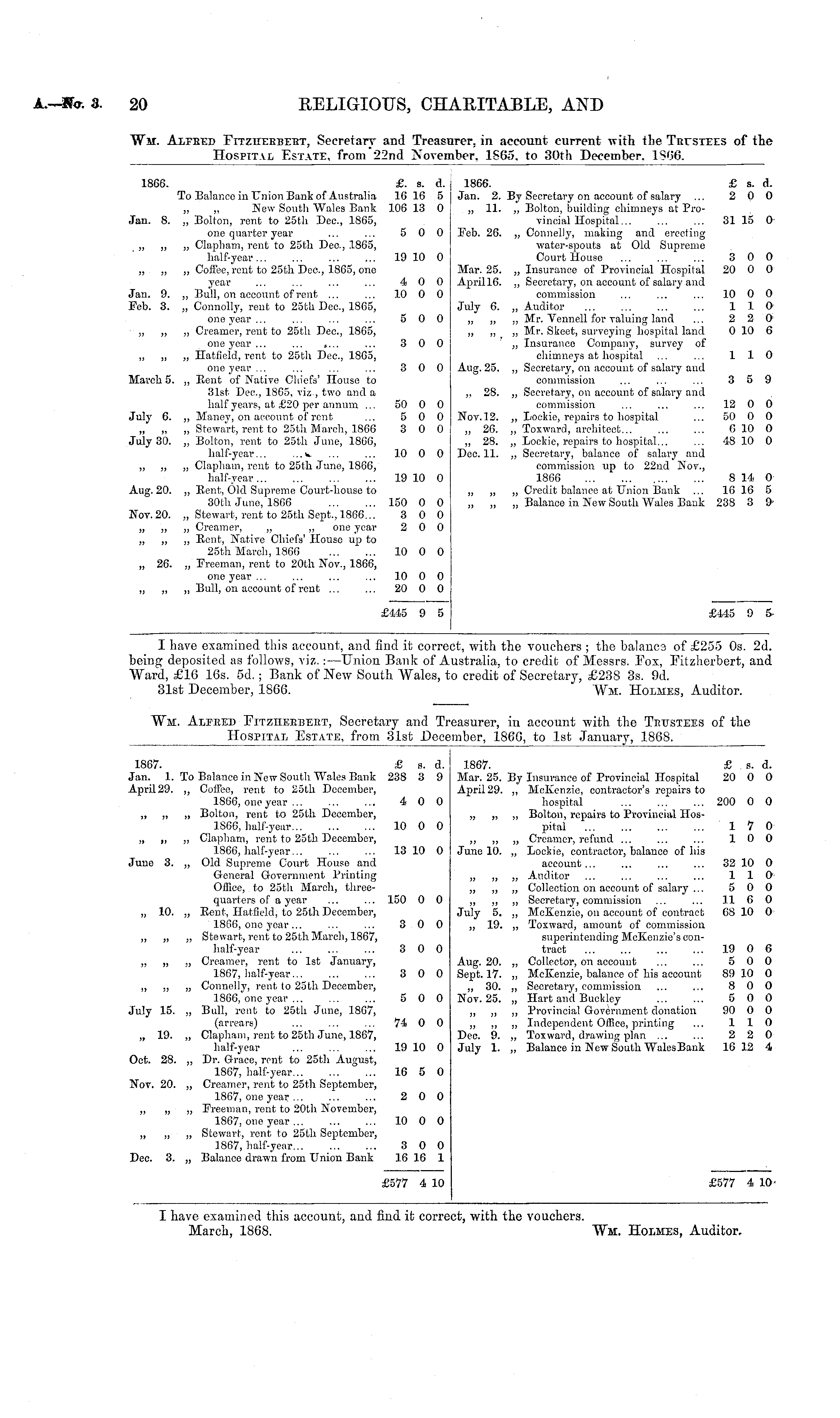 I have examined this account, and find it correct, with the vouchers ; the balance of £255 Os. 2d. being deposited as follows, viz.: —Union Bank of Australia, to credit of Messrs. Fox, Fitzherbert, and Ward, £16 16s. sd. ; Bank of New South Wales, to credit of Secretary, £238 3s. 9d. 31st December, 1866. Wm. Holmes, Auditor.