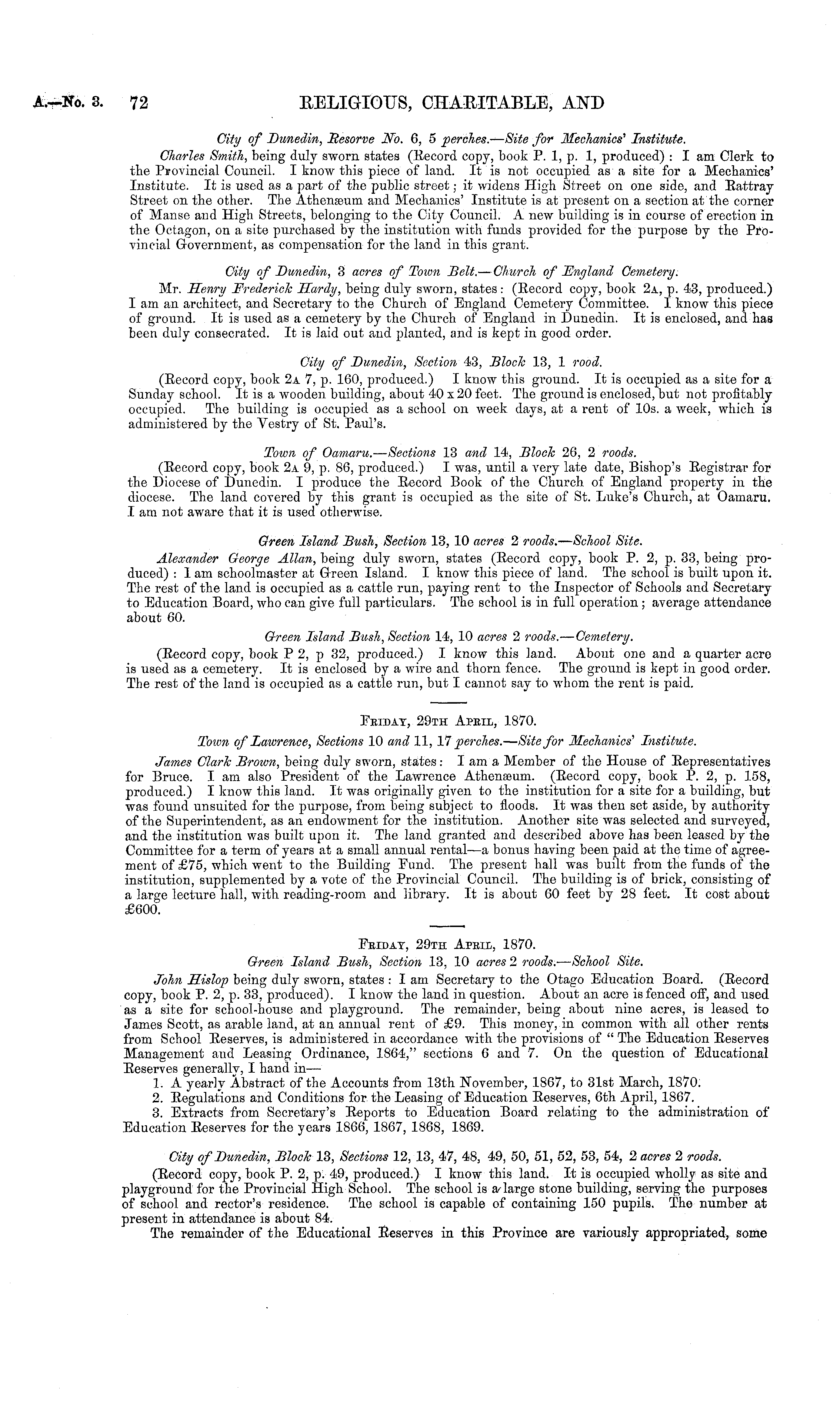 City of Dunedin, Resorve No. 6, 5 perches. — Site for Mechanics' Institute. Charles Smith, being duly sworn states (Record copy, book P. 1, p. 1, produced) : I am Clerk to the Provincial Council. I know this piece of land. It is not occupied as a site for a Mechanics' Institute. It is used as a part of the public street; it widens High Street on one side, and Rattray Street on the other. The Athenaeum and Mechanics' Institute is at present on a section at the corner of Manse and High Streets, belonging to the City Council. A new building is in course of erection in the Octagon, on a site purchased by the institution with funds provided for the purpose by the Provincial Government, as compensation for the land in this grant. City of Dunedin, 3 acres of Town Belt. — Church of England Cemetery. Mr. Henry Frederick Hardy, being duly sworn, states : (Record copy, book 2a, p. 43, produced.) lam an architect, and Secretary to the Church of England Cemetery Committee. I know this piece of ground. It is used as a cemetery by the Church of England in Dunedin. It is enclosed, and has been duly consecrated. It is laid out and planted, and is kept in good order. City of Dunedin, Section 43, Block 13, 1 rood. (Record copy, book 2a 7, p. 160, produced.) I know this ground. It is occupied as a site for a Sunday school. It is a wooden building, about 40 x2O feet. The ground is enclosed, but not profitably occupied. The building is occupied as a school on week days, at a rent of 10s. a week, which is administered by the Vestry of St. Paul's. Town of Oamaru. — Sections 13 and 14, Block 26, 2 roods. (Record copy, book 2a 9, p. 86, produced.) I was, until a very late date, Bishop's Registrar for the Diocese of Dunedin. I produce the Record Book of the Church of England property in the diocese. The land covered by this grant is occupied as the site of St. Luke's Church, at Oamaru. I am not aware that it is used otherwise. Green Island Bush, Section 13, 10 acres 2 roods. — School Site. Alexander George Allan, being duly sworn, states (Record copy, book P. 2, p. 33, being produced) : lam schoolmaster at Green Island. I know this piece of land. The school is built upon it. The rest of the land is occupied as a cattle run, paying rent to the Inspector of Schools and Secretary to Education Board, who can give full particulars. The school is in full operation ; average attendance about 60. Green Island Bush, Section 14, 10 acres 2 roods. — Cemetery. (Record copy, book P2, p 32, produced.) I know this land. About one and a quarter acre is used as a cemetery. It is enclosed by a wire and thorn fence. The ground is kept in good order. The rest of the land is occupied as a cattle run, but I cannot say to whom the rent is paid.