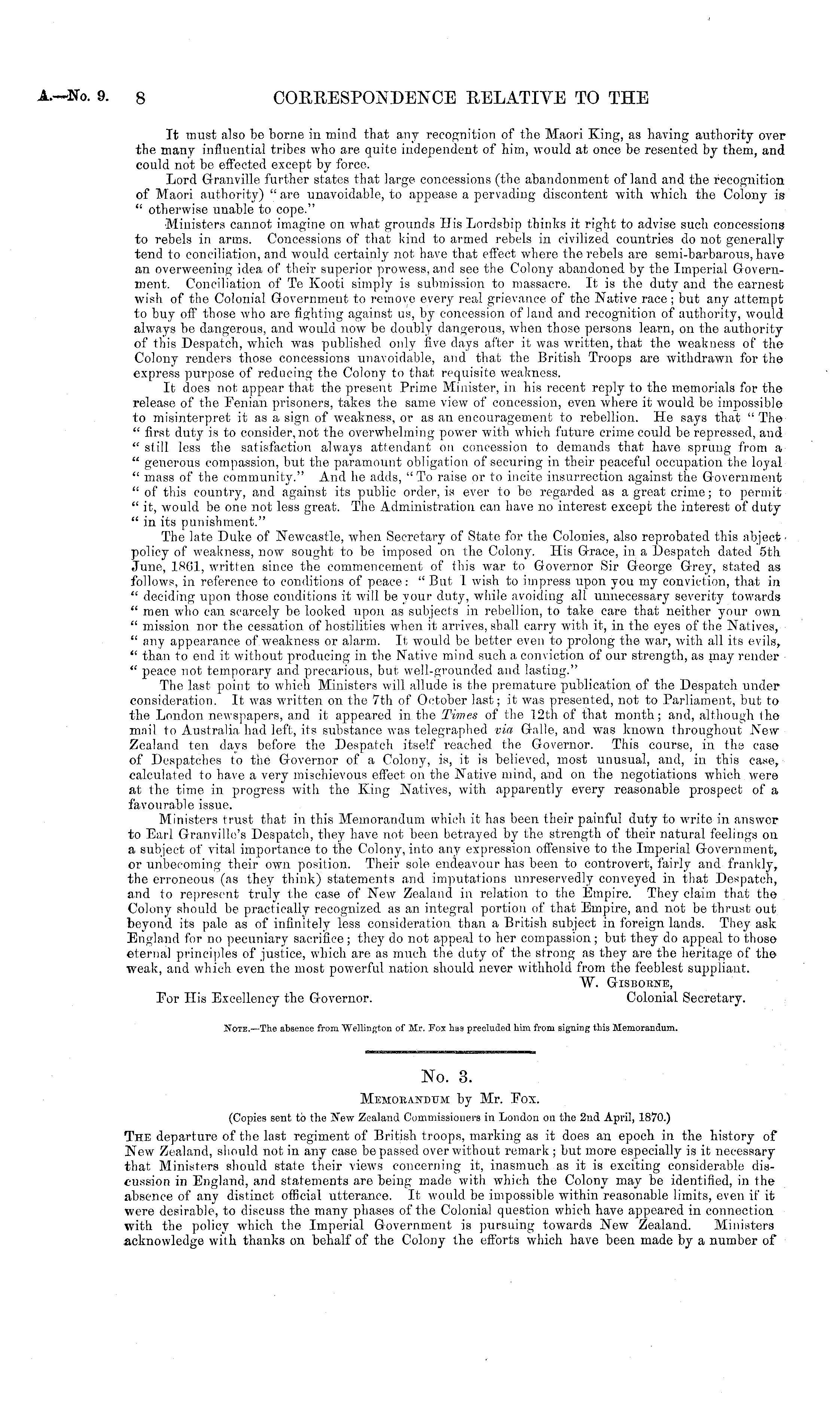 No. 3. Memorandum by Mr. Fox. (Copies sent to the New Zealand Commissioners in London on the 2nd April, 1870.) The departure of the last regiment of British troops, marking as it docs an epoch in the history of New Zealand, should not in any case be passed over without remark ; but more especially is it necessary that Ministers should state their views concerning it, inasmuch as it is exciting considerable discussion in England, and statements are being made with which the Colony may be identified, in the absence of any distinct official utterance. It would be impossible within reasonable limits, even if it were desirable, to discuss the many phases of the Colonial question which have appeared in connection with the policy which the Imperial Government is pursuing towards New Zealand. Ministers acknowledge with thanks on behalf of the Colony the efforts which have been made by a number of