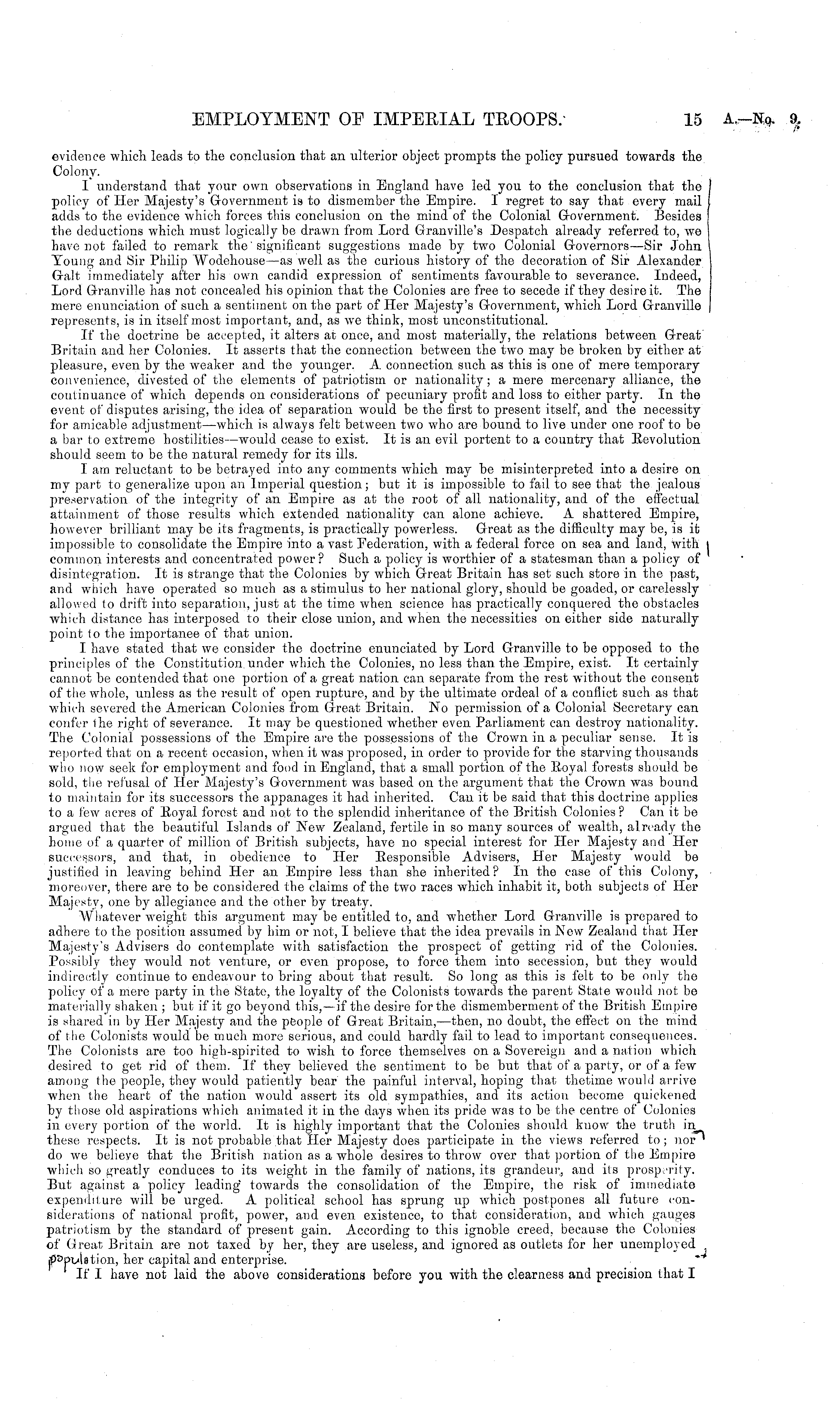 evidence which leads to the conclusion that an ulterior object prompts the policy pursued towards the Colony. I understand that your own observations in England have led you to the conclusion that the j policy of Her Majesty's Government is to dismember the Empire. I regret to say that every mail J adds to the evidence which forces this conclusion on the mind of the Colonial Government. Besides the deductions which must logically be drawn from Lord Granville's Despatch already referred to, we j have not failed to remark the' significant suggestions made by two Colonial Governors—Sir John 1 Young and Sir Philip Wodehouse —as well as tho curious history of the decoration of Sir Alexander Gait immediately after his own candid expression of sentiments favourable to severance. Indeed, Lord Granville has not concealed his opinion that the Colonies are free to secede if they desire it. The mere enunciation of such a sentiment on the part of Her Majesty's Government, which Lord Granville represents, is in itself most important, and, as we think, most unconstitutional. If the doctrine be accepted, it alters at once, and most materially, the relations between Great Britain and her Colonies. If asserts that the connection between the two may be broken by either at pleasure, even by the weaker and the younger. A connection such as this is one of mere temporary convenience, divested of the elements of patriotism or nationality; a mere mercenary alliance, the continuance of which depends on considerations of pecuniary profit and loss to either party. In the event of disputes arising, the idea of separation would be the first to present itself, and the necessity for amicable adjustment —which is always felt between two who are bound to live under one roof to be a bar to extreme hostilities—would cease to exist. It is an evil portent to a country that Eevolution should seem to be the natural remedy for its ills. I am reluctant to be betrayed into any comments which may be misinterpreted into a desire on my part to generalize upon an Imperial question; but it is impossible to fail to see that the jealous preservation of the integrity of an Empire as at the root of all nationality, and of the effectual attainment of those results which extended nationality can alone achieve. A shattered Empire, however brilliant may be its fragments, is practically powerless. Great as the difficulty may be, is it impossible to consolidate the Empire into a vast Federation, with a federal force on sea and land, with I common interests and concentrated power ? Such a policy is worthier of a statesman than a policy of disintegration. It is strange that the Colonies by which Great Britain has set such store in the past, and which have operated so much as a stimulus to her national glory, should be goaded, or carelessly allowed to drift into separation, just at the time when science has practically conquered the obstacles which distance has interposed to their close union, and when the necessities on either side naturally point to the importance of that union. I have stated that we consider the doctrine enunciated by Lord Granville to bo opposed to the principles of the Constitution under which the Colonies, no less than the Empire, exist. It certainly cannot be contended that one portion of a great nation can separate from the rest without the consent of the whole, unless as the result of open rupture, and by the ultimate ordeal of a conflict such as that which severed the American Colonies from Great Britain. No permission of a Colonial Secretary can confer the right of severance. It may be questioned whether even Parliament can destroy nationality. The Colonial possessions of the Empire are the possessions of the Crown in a peculiar sense. It is reported that on a recent occasion, when it was proposed, in order to provide for the starving thousands who now seek for employment and food in England, that a small portion of the Eoyal forests should be sold, the refusal of Her Majesty's Government was based on the argument that the Crown was bound to maintain for its successors the appanages it had inherited. Can it be said that this doctrine applies to a few acres of Eoyal forest and not to the splendid inheritance of the British Colonies? Can it be argued that the beautiful Islands of New Zealand, fertile in so many sources of wealth, already the home of a quarter of million of British subjects, have no special interest for Her Majesty and Her successors, and that, in obedience to Her Besponsible Advisers, Her Majesty would be justified in leaving behind Her an Empire less than she inherited? In the case of this Colony, moreover, there are to be considered the claims of the two races which inhabit it, both subjects of Her Majesty, one by allegiance and the other by treaty. Whatever weight this argument may be entitled to, and whether Lord Granville is prepared to adhere to the position assumed by him or not, I believe that the idea prevails in New Zealand that Her Majesty's Advisers do contemplate with satisfaction the prospect of getting rid of the Colonies. Possibly they would not venture, or even propose, to force them into secession, but they would indirectly continue to endeavour to bring about that result. So long as this is felt to be only the policy of a mere party in the State, the loyalty of the Colonists towards the parent State would not be materially shaken ; but if it go beyond this, —if the desire for the dismemberment of the British Empire is shared in by Her Majesty and the people of Great Britain, —then, no doubt, the effect on the mind of the Colonists would be much more serious, and could hardly fail to lead to important consequences. The Colonists are too high-spirited to wish to force themselves on a Sovereign and a nation which desired to get rid of them. If they believed the sentiment to be but that of a party, or of a few among the people, they would patiently bear the painful interval, hop