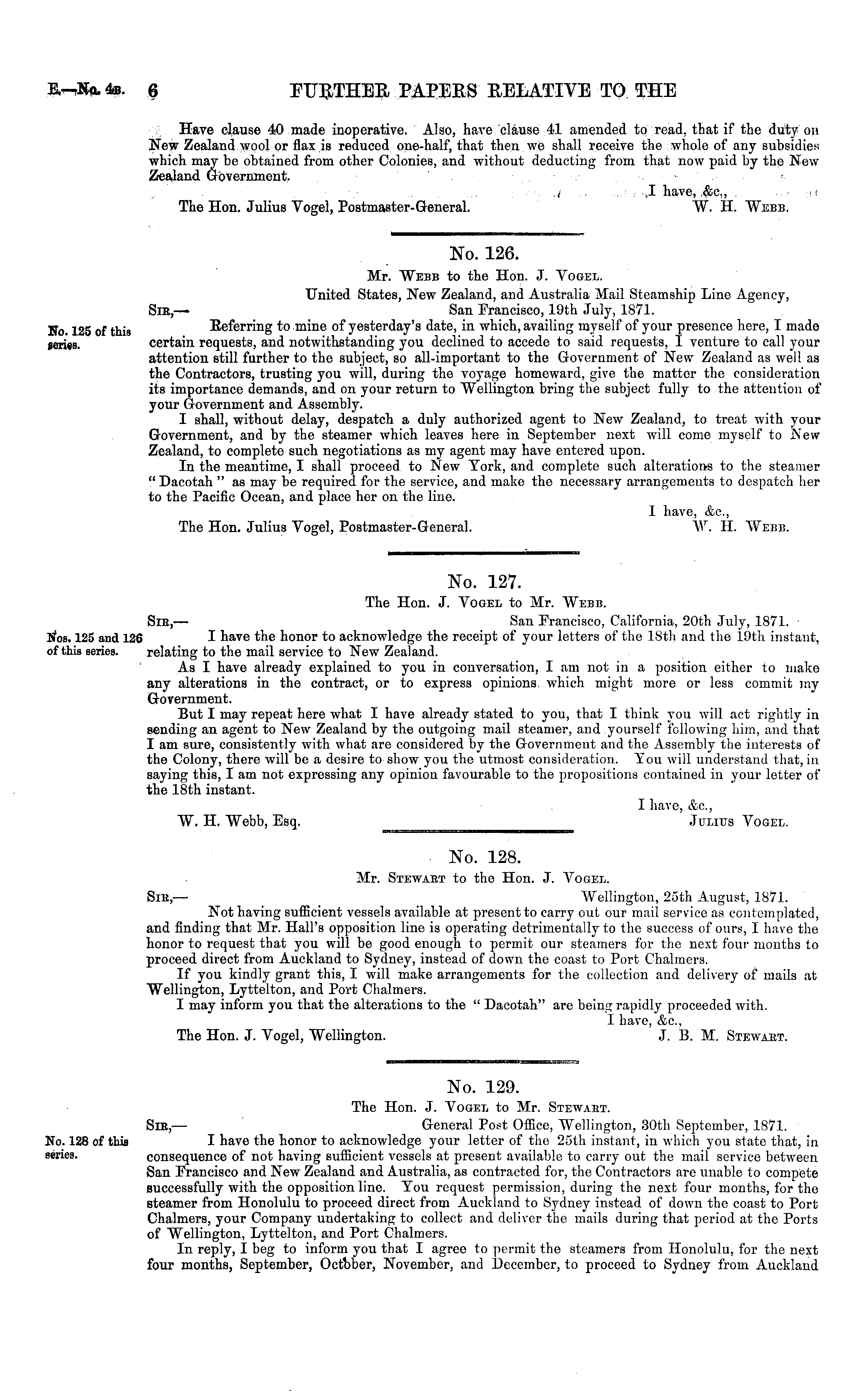 No. 126. Mr. Webb to the Hon. J. Vogel. United States, New Zealand, and Australia Mail Steamship Line Agency, Sir,— San Francisco, 19th July, 1871. Referring to mine of yesterday's date, in which, availing myself of your presence here, I made certain requests, and notwithstanding you declined to accede to said requests, I venture to call your attention still further to the subject, so all-important to the Government of New Zealand as well as the Contractors, trusting you will, during the voyage homeward, give the matter the consideration its importance demands, and on your return to Wellington bring the subject fully to the attention of your Government and Assembly. I shall, without delay, despatch a duly authorized agent to New Zealand, to treat with your Government, and by the steamer which leaves here in September next will come myself to Hew Zealand, to complete such negotiations as my agent may have entered upon. In the meantime, I shall proceed to New York, and complete such alterations to the steamer " Dacotah " as may be required for the service, and make the necessary arrangements to despatch her to the Pacific Ocean, and place her on the line. I have, Ac, The Hon. Julius Vogel, Postmaster-General. W. fi. AVebb.