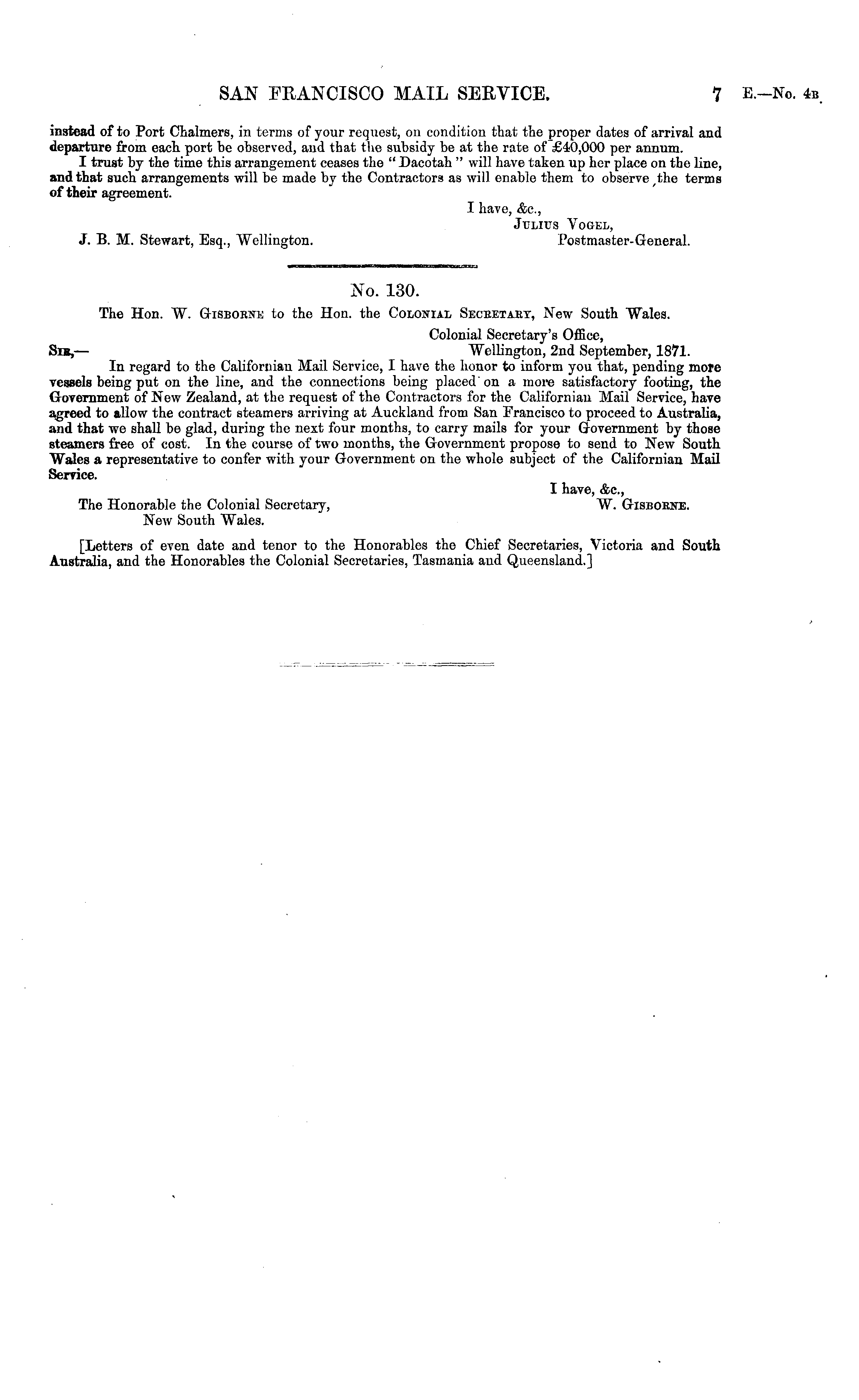 No. 130. The Hon. W. Gisborne to the Hon. the Colonial Secretary, New South Wales. Colonial Secretary's Office, Sr_, — Wellington, 2nd September, 1871. In regard to the Californian Mail Service, I have the honor to inform you that, pending more vessels being put on the line, and the connections being placed' on a more satisfactory footing, the Government of New Zealand, at the request of the Contractors for the Californian Mail Service, have agreed to allow the contract steamers arriving at Auckland from San Francisco to proceed to Australia, and that wo shall be glad, during the next four months, to carry mails for your Government by those steamers free of cost. In the course of two months, the Government propose to send to New South Wales a representative to confer with your Government on the whole subject of the Californian Mail Service. I have, Ac, The Honorable the Colonial Secretary, W. Gisborne. New South Wales. [Letters of even date and tenor to the Honorables the Chief Secretaries, Victoria and South Australia, and the Honorables the Colonial Secretaries, Tasmania and Queensland.]
