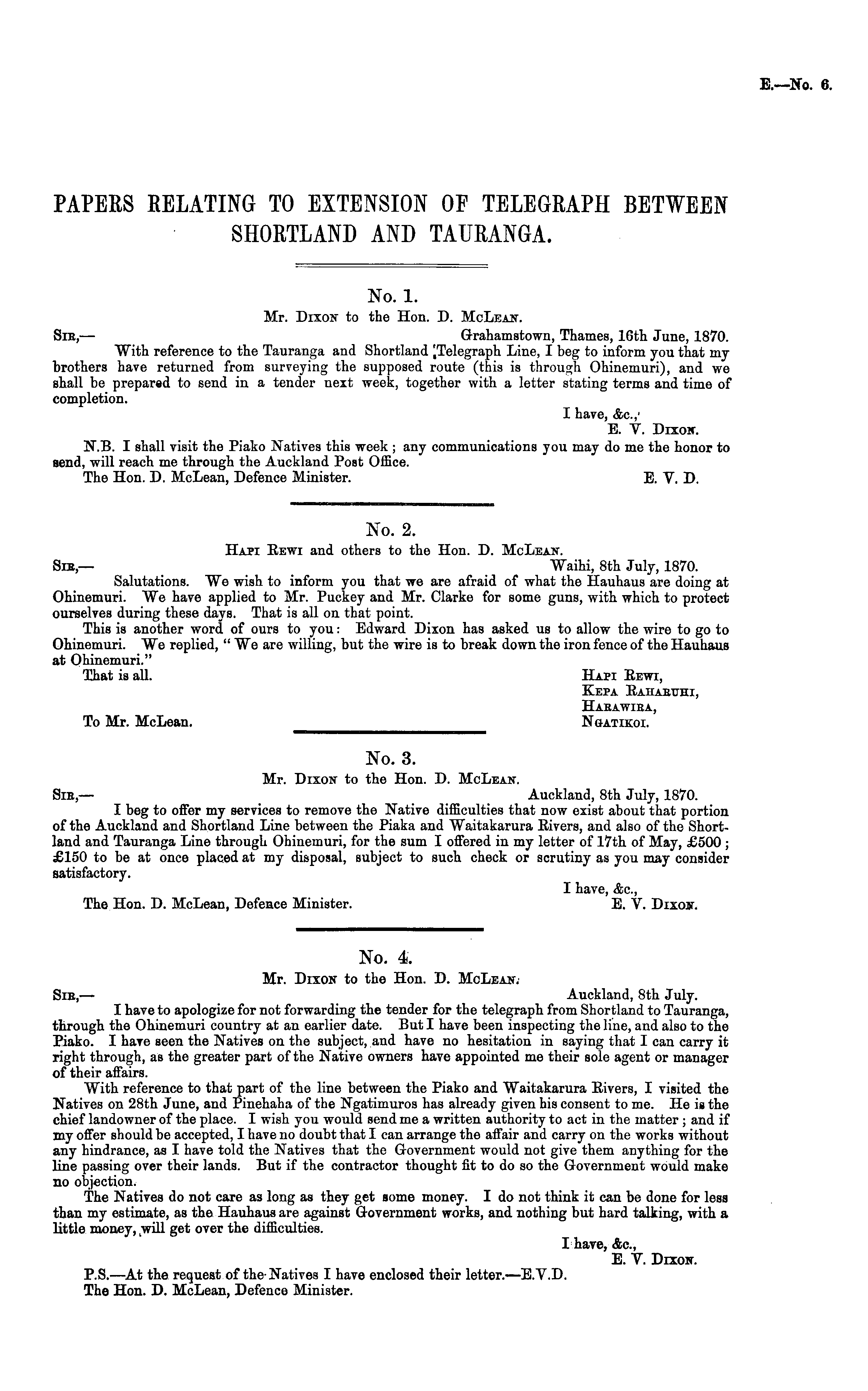 No. 1. Mr. Dixon to the Hon. D. McLean. Sir, — Grahamstown, Thames, 16th June, 1870. With reference to the Tauranga and Shortland [Telegraph Line, I beg to inform you that my brothers have returned from surveying the supposed route (this is through Ohinemuri), and we shall be prepared to send in a tender next week, together with a letter stating terms and time of completion. I have, Ac,E. V. Dixon. N.B. I shall visit the Piako Natives this week ; any communications you may do me the honor to send, will reach me through the Auckland Post Office. The Hon. D. McLean, Defence Minister. E. V. D.