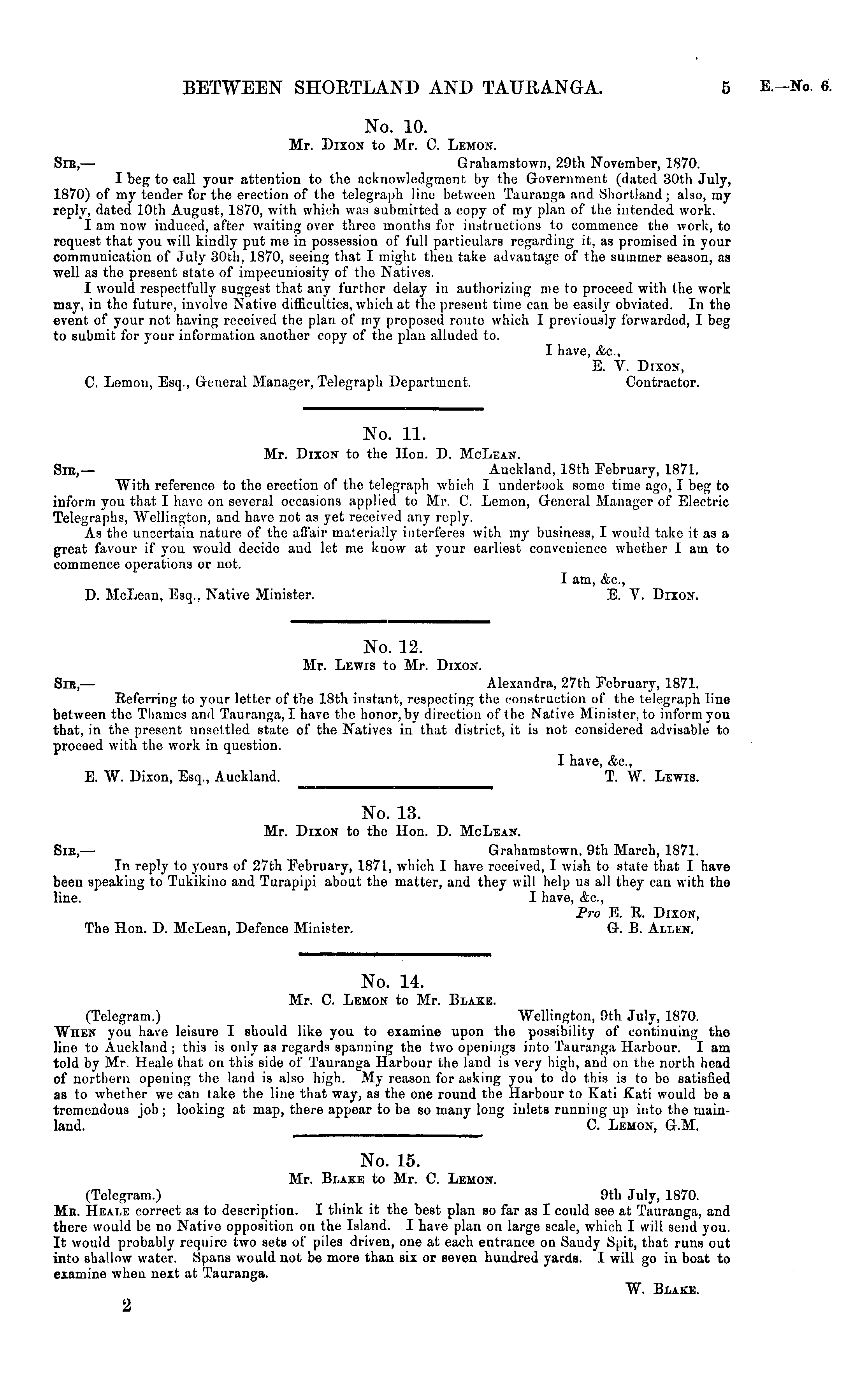 No. 10. Mr. Dixon to Mr. C. Lemon. Sic, — Grahamstown, 29th November, 1870. I beg to call your attention to the acknowledgment by the Government (dated 30th July, 1870) of my tender for the erection of the telegraph line between Tauranga and Shortland; also, my reply, dated 10th August, 1870, with which was submiited a copy of my plan of the intended work. I am now induced, after waiting over three months for instructions to commence the work, to request that you will kindly put me in possession of full particulars regarding it, as promised in your communication of July 30th, 1870, seeing that I might then take advantage of the summer season, as well as the present state of impecuniosity of tho Natives. I would respectfully suggest that any further delay in authorizing me to proceed with the work may, in the future, involve Native difficulties, which at the present time can be easily obviated. In the event of your not having received the plan of my proposed route which I previously forwarded, I beg to submit for your information another copy of the plan alluded to. I have, Ac, E. V. Dixon, C. Lemon, Esq., General Manager, Telegraph Department. Contractor.
