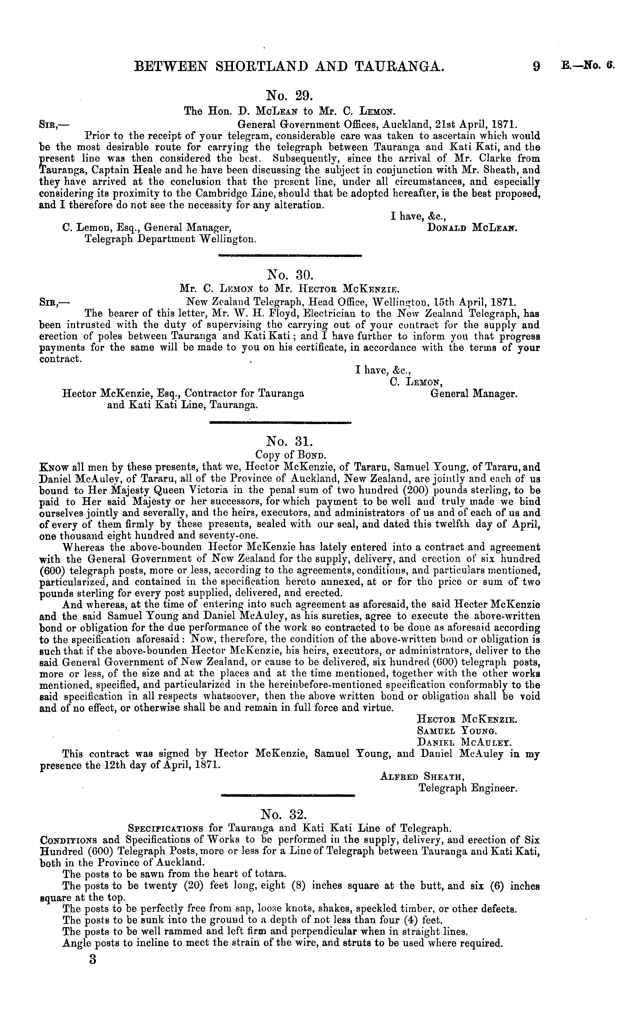 No. 31. Copy of Bond. Know all men by these presents, that we, Hector McKenzie, of Tararu, Samuel Young, of Tararu, and Daniel McAuley, of Tararu, all of the Province of Auckland, New Zealand, are jointly and each of us bound to Her Majesty Queen Victoria in the penal sum of two hundred (200) pounds sterling, to be paid to Her said Majesty or her successors, for which payment to be well and truly made we bind ourselves jointly and severally, and the heirs, executors, and administrators of us and of each of us and of every of them firmly by these presents, sealed with our seal, and dated this twelfth day of April, one thousand eight hundred and seventy-one. Whereas the above-bounden Hector McKenzie has lately entered into a contract and agreement with the General Government of New Zealand for the supply, delivery, and erection of six hundred (600) telegraph posts, more or less, according to the agreements, conditions, and particulars mentioned, particularized, and contained in the specification hereto annexed, at or for the price or sum of two pounds sterling for every post supplied, delivered, and erected. And whereas, at the time of entering into such agreement as aforesaid, the said Hecter McKenzie and the said Samuel Young and Daniel McAuley, as his sureties, agree to execute the above-written bond or obligation for the due performance of the work so contracted to be done as aforesaid according to the specification aforesaid : Now, therefore, the condition of the above-written bond or obligation is such that if the above-bounden Hector McKenzie, his heirs, executors, or administrators, deliver to the said General Government of New Zealand, or cause to be delivered, six hundred (600) telegraph posts, more or less, of the size and at tho places and at the time mentioned, together with the other works mentioned, specified, and particularized in the hereinbefore-mentioned specification conformably to the said specification in all respects whatsoever, then the above written bond or obligation shall be void and of no effect, or otherwise shall be and remain in full force and virtue. Hector McKenzie. Samuel Young. Daniel McAuley. This contract was signed by Hector McKenzie, Samuel Young, and Daniel McAuley in my presence the 12th day of April, 1871. Alfred Sheath, Tele-cranh Enrn'neer.