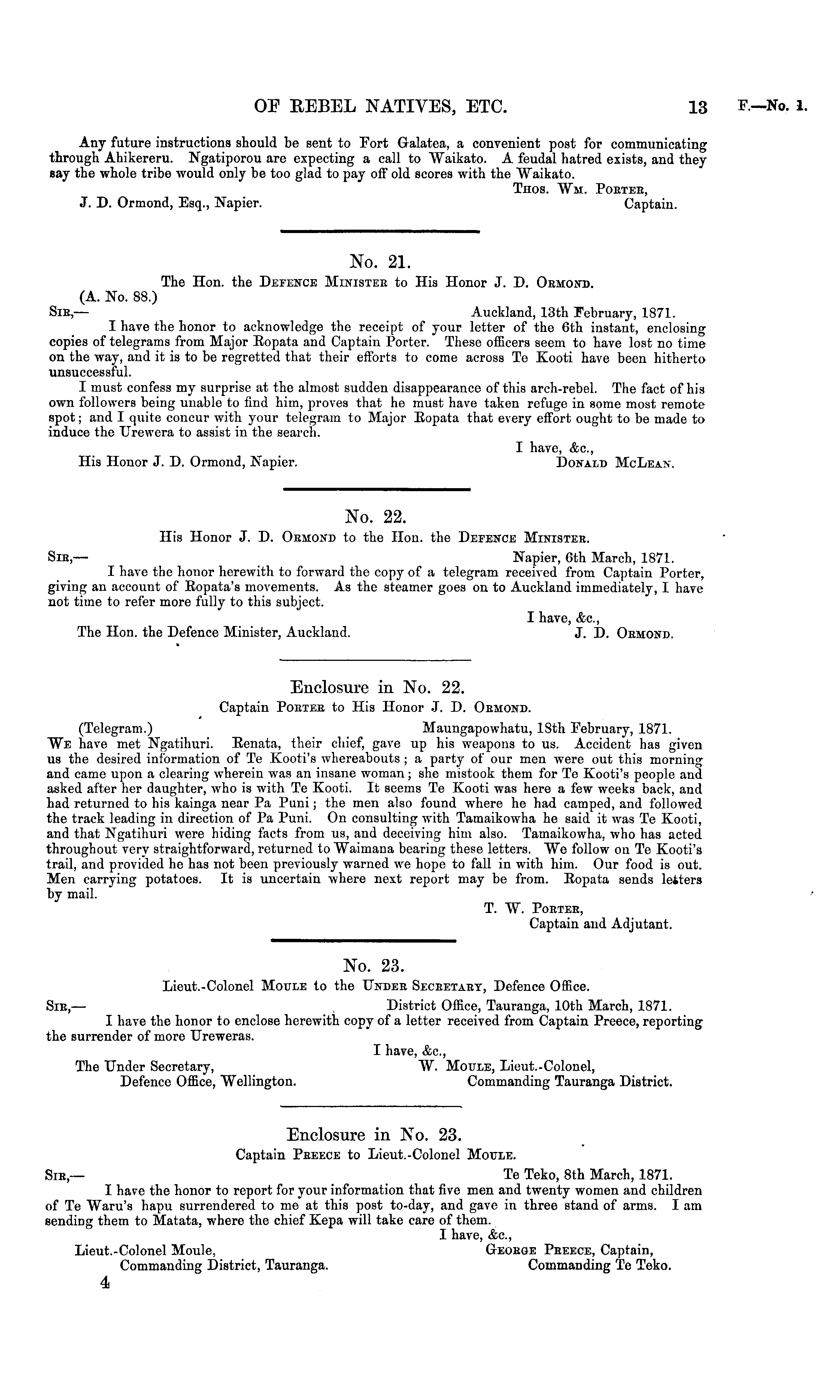 Enclosure in No. 23. Captain Preece to Lieut.-Colonel Moule. Sir,— Te Teko, Bth March, 1871. I have the honor to report for your information that five men and twenty women and children of Te Waru's hapu surrendered to me at this post to-day, and gave in three stand of arms. lam sending them to Matata, where the chief Kepa will take care of them. I have, &c, Lieut.-Colonel Moule, George Peeece, Captain, Commanding District, Tauranga. Commanding Te Teko. 4