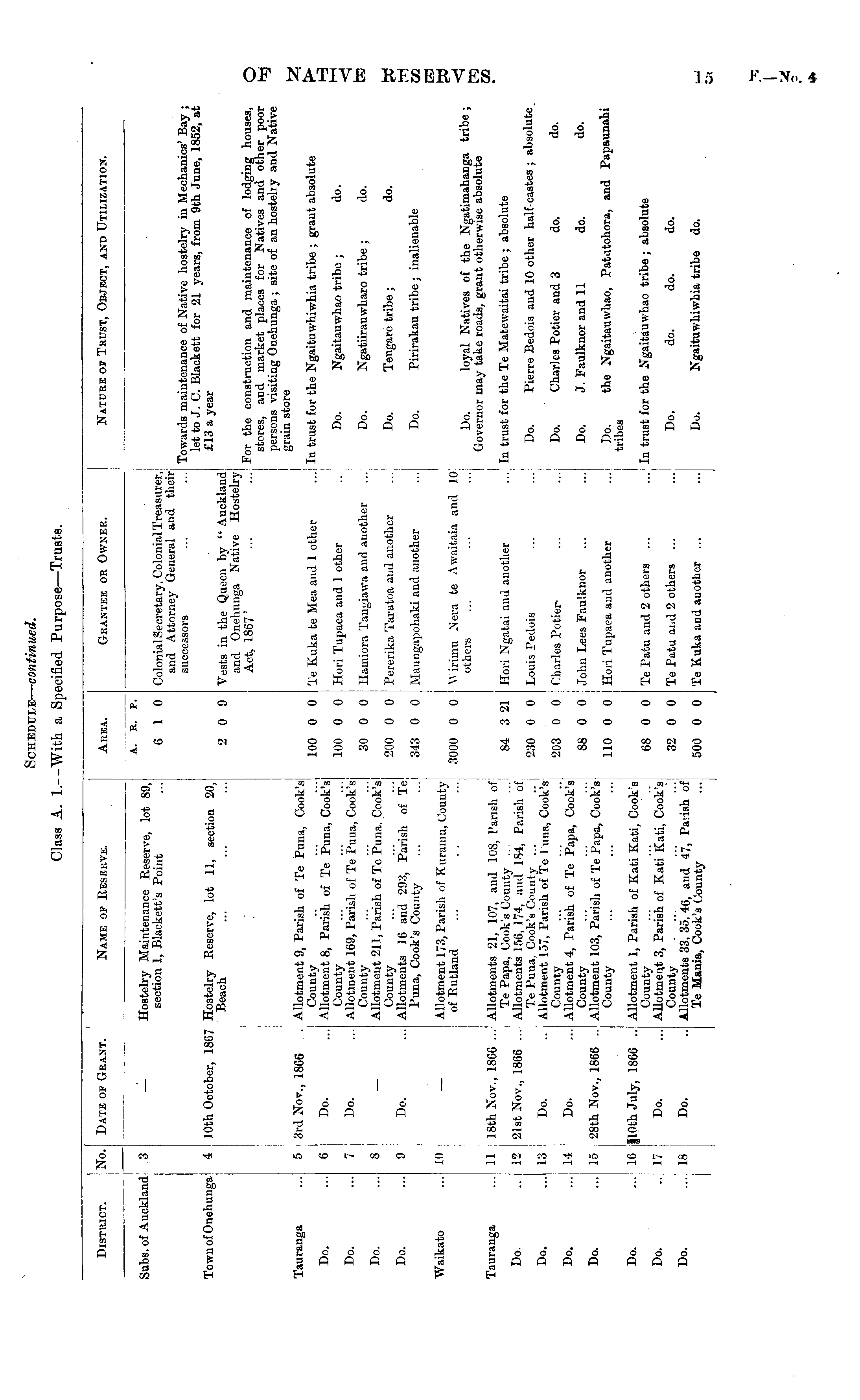 District. No. Date of Grant. Name of Reserve. Area. Grantee or Owner. Nature of Trust, Object, and Utilization. Subs, of Auckland .3 A. E. P. — Hostelry Maintenance Reserve, lot 89, section 1, Blackett's Point 6 1 0 6 1 0 Colonial Secretary, Colonial Treasurer, and Attorney Guneral aud their successors ... ... Towards maintenance of Native hostelry in Mechanics' Bay ; let to J. C. Black ett for 21 years, from 9th June, 1852, at £13 a year Vests in the Queen by " Auckland and Onehunga Native Hostelry! Act, 1867' ... ... For the construction and maintenance of lodging houses, stores, and market places for Natives and other poor persons visiting Onehunga ; site of an hostelry and Native grain store Town of Onehunga 10th October, 1867 Hostelry Reserve, lot 11, section 20, Beach 2 0 9 2 0 9 Tauranga 3rd Nov., 1866 . Allotment 9, Parish of Te Puna, Cook's County Do. ... Allotment 8, Parish of Te Puna, Cook'sj County ... ... ...| Do. ... Allotment 169, Parish of Te Puna, Cook's. County ... ... ...| — Allotment 211, Parish of Te Puna. Cook'si County ... ... ...| Do. ... Allotments 16 and 293, Parish of Te Puna, Cook's County 100 0 0 100 0 0 30 0 0 200 0 0 343 0 0 5 Do. C Te Kuka te Mea and 1 other ... In trust for the Ngaituwhiwhia tribe ; grant absolute Hori Tupaea and 1 other .. Do. Ngaitauwhao tribe ; do. Do. 7 Do. 8 Hamiora Tangiawa and another ... Do. Ngatiirauwharo tribe ; do. Do. 9 Pererika Taratoa and another ... Do. Tengare tribe; do. Waikato Maungapohaki and another ... Do. Pirirakau tribe ; inalienable 10 — Allotment 173, Parish of Kuramu, County of Rutland 3000 0 0 Wirimu Nera te Awaitaia and 10 others ... ... ...j Do. loyal Natives of the Ngatimahanga tribe; Governor may take roads, grant otherwise absolute Tauranga 18th Nov., 1866 ... Allotments 21, 107, and 108, Parish of Te Papa, Cook's County ... 21st Nov., 1866 ... Allotments 156, 174, and 184, Parish of Te Puna. Cook's County ... .. j Do. .. Allotment 1.37, Parish of Te I'uua, Cook's County Do. ... Allotments Parish of Te Papa, Cook's County 28th Nov., 1866 .. Allotment 103, Parish of Te Papa, Cook'si County S4 3 21 230 0 0 203 0 0 88 0 0 110 0 0 11 Hori Ngatai and another ... In trust for the Te Matewaitai tribe ; absolute .. j 12 Louis Pedois ... ... Do. Pierre Bedois aud 10 other half-castes; absolute Do. 13 Do. 14 Oharlee Potier- ... ... Do. Charles Potier and 3 do. do. John Lees Faulknor ... ... Do. J. Faulknor and 11 do. do. Do. 1.1 Hori Tupaea and another ...I Do. the Ngaitauwhao, Patatohora, and Papaunabi tribes Do. 110th July, 1866 .. Allotment 1, Pariah of Kati Kati, Cook's County Do. ... Allotment 3, Parish of Kati Kati, Cook's County .... Do. .. Allotments 33, 35, 46, and 47, Parish of Te Mania, Cook's County 68 0 0 32 0 0 500 0 0 Jii Te Patu and 2 others ... ...'■ In trust for the Ngaitauwhao tribe ; absolute Do. 17 Do. ... Te Patu and 2 others ... ... Do. do. do. do. 18 Te Kuka aud another ... ... Do. Ngaituwhiwhia tribe do.