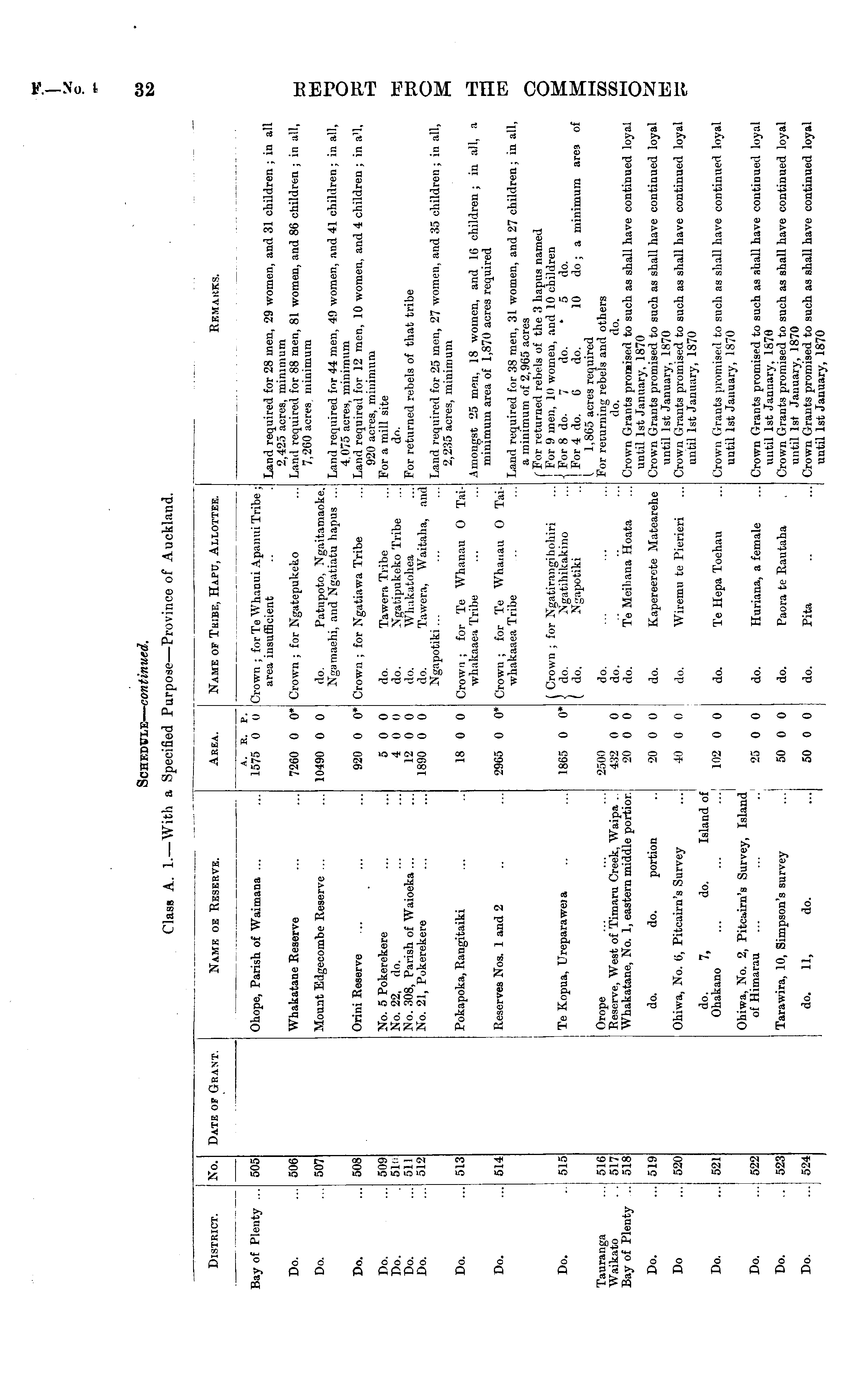 District. No. Date of Grant. Name oe "Reserve. Area. Name of Thibe, Hapu, Allottee. Remaiiks. Bay of Plenty ... 505 Ohope, Parish of Waimana ... a. e. p. 1575 0 0 Crown ; for Te Whanni Apanui Tribe ; area insufficient Land required for 28 men, 29 women, and 31 children ; in all 2,425 acres, minimum Land required for 88 men, 81 women, and 86 children ; in all, 7,260 acres minimum Do. 506 Whakatane Reserve 7260 0 0* Crown ; for Ngatepukeko Do. 507 Mount Edgecombe Reserve ... 10490 0 0 do. Patupoto, Ngaitamaoke, Ngaraaehi, and Ngatiatu liapus ... Land required for 44 men, 49 women, and 41 children; in all, 4,075 acres, minimum Land required for 12 men, 10 women, and 4 children ; in a'l, 920 acres, minimum For a mill site do. For returned rebels of that tribe Do. Orini Reserve 920 0 0* Crown ; for Ngatiawa Tribe 508 ■ Do. Do. Do. Do. 509 51i: 511 512 No. 5 Pokerekere No. 22, do. No. 308, Parish of Waioeka ... No. 21, Pokerekere 5 0 0 4 0 0 12 0 0 1890 0 0 do. Tawera Tribe do. Ngatipukeko Tribe do. Whakatohea do. Tawera, Waitaha, and Ngapotiki... Do. Land required for 25 men, 27 women, and 35 children ; in all, 2,235 acres, minimum 513 Pokapoka, Rangitaiki 18 0 0 Crown ; for Te Whanau 0 Taiwhakaaea Tribe Do. Amongst 25 men, 18 women, and 16 children ; in all, a minimum area of 1,870 acres required 514 Reserves Nos. 1 and 2 2965 0 0* Crown ; for Te Whauau 0 Taiwhakaaea Tribe Land required for 38 men, 31 women, and 27 children; in all, a minimum of 2,965 acres ( For returned rebels of the 3 hapus named j For 9 men, 10 women, and 10 children -j For 8 do. 7 do. * 5 do. I For 4 do. 6 do. 10 do; a minimum area of I 1,S65 acres required For returning rebels and others do. do. Crown Grants promised to such as shall have continued loyal until 1st January, 1870 Crown Grants promised to such as shall have continued loyal until 1st January, 1870 Crown Grants promised to such as shall have continued loyal until 1st January, 1870 Do. Te Kopua, Ureparawei a 1865 0 0* ( Crown ; for Ngatirangihohiri < do. Ngatihikakino ( do. Ngapotiki 515 Tauranga Waikato . . Bay of Plenty .. 516 517 518 Orope Reserve, West of Timaru Creek, Waipa .. Whakatane, No. 1, eastern middle portior 2500 432 0 0 20 0 0 do. do. do. Te Meiliana Hoata Do. 519 do. do. portion 20 0 0 do. Kapereerote Matearehe Do 520 Ohiwa, No. (5, Pitcairn's Survey 40 0 0 do. Wiremu te Pierieri Do. Do. 521 522 do. 7, do. Island of Ohakano ... ... ...[ Ohiwa, No. 2, Pitcairn's Survey, Island of Himarau ... ... ..' Tarawira, 10, Simpson's survey ... do. 11, do. 102 0 0 25 0 0 50 0 0 50 0 0 do. Te Hepa Toehau do. Huriana, a female Crown Grauts promised to such as shall have continued loyal until 1st January, 1870 Crown Grants promised to such as shall have continued loyal until 1st January, 1870 Crown Grants promised to such as shall have continued loyal until 1st January, 1870 Crown Grants promised to such as shall have continued loyal until 1st January, 1870 Do. 523 do. Paora te Rautaha Do. 524 do. Pita