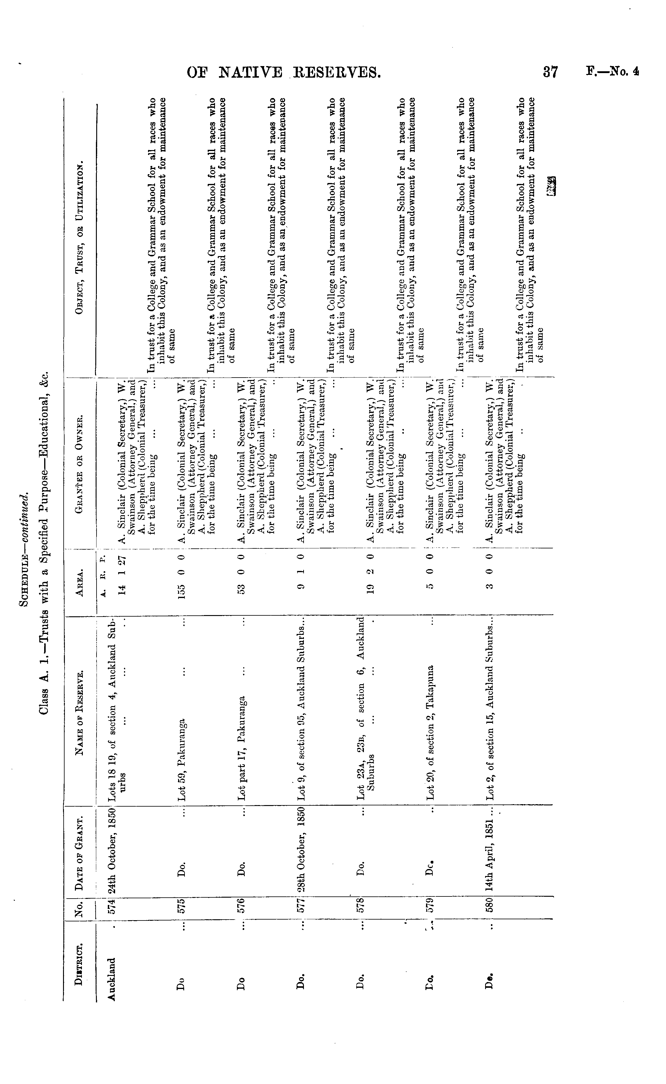District. No. Date of Grant. Name ov Reserve. Area. Grantee or Owner. Object, Trust, or Utilization. a. e. p. j Auckland 5741 24th October, 1850 Lots 18 19, of section 4, Auckland Suburbs 14 1 27 14 1 27 j A. Sinclair (Colonial Secretary,) W. Swainson (Attorney General.) and A. Sheppherd (Colonial Treasurer,) for the time being Do 575 Do. Lot 59, Pakuranga 155 0 0 55 0 0 A. Sinclair (Colonial Secretary,) W. Swainson (Attorney General,) and A. Sheppherd (Colonial Treasurer,) for the time being In trust for a College and Grammar School for all races wh< inhabit this Colony, and as an endowment for maintenonci of same Do Do. Lot part 17, Pakuranga 53 0 0 In trust for a College and Grammar School for all races wh( inhabit this Colony, and as an endowment for maintenance of same 576 53 0 0 A. Sinclair (Colonial Secretary,) W. Swainson (Attorney General,) and A. Sheppherd (Colonial Treasurer,) for the time being In trust for a College and Grammar School for all races wh( inhabit this Colony, and as an endowment for maintenance of same Do. 577; 28th October, 1850 Lot 9, of section 95, Auckland Suburbs... 9 10 9 1 0 A. Sinclair (Colonial Secretary,) W. Swainson (Attorney General,) and A. Sheppherd (Colonial Treasurer,) for the time being Do. Do. Lot 23a, 23b, of section 6, Auckland Suburbs In trust for a College and Grammar School for all races wh( inhabit this Colony, and as an endowment for maintenanci of same 578 19 2 0 A. Sinclair (Colonial Secretary,) W. Swainson (Attorney General,) and A. Sheppherd (Colonial Treasurer,) for the time being In trust for a College and Grammar School for all races wh< inhabit this Colony, and as an endowment for maintenanci of same Do. 579 Dc. Lot 20, of section 2, Takapuna 5 0 0 A. Sinclair (Colonial Secretary,) W. Swainson (Attorney General,) and A. Sheppherd (Colonial Treasurer,) for the time being D.. 14th April, 1851 ... Lot 2, of section 15, Auckland Suburbs... In trust for a College and Grammar School for all races wh< inhabit this Colony, and as an endowment for maintenanc< of same 580 3 0 0 A. Sinclair (Colonial Secretary,) W. Swainson (Attorney General,) and A. Sheppherd (Colonial Treasurer,) for the time being In trust for a College and Grammar School for all races wh( inhabit this Colony, and as an endowment for maintenanci of same L2ii9