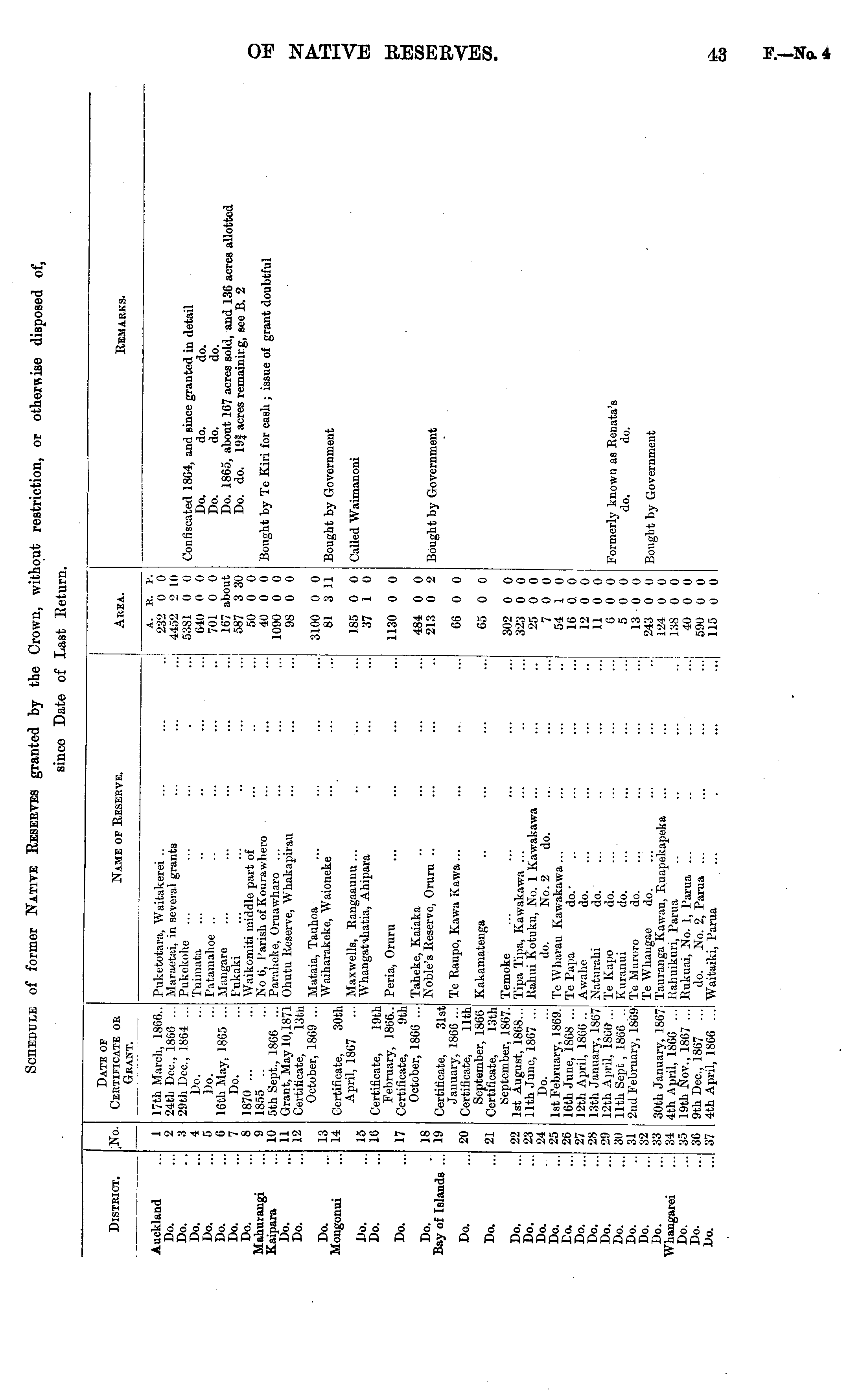 District. ,No. Date of Certificate or Grant. Name of Beseevb. Area. Remarks. Auckland Do. Do. Do. Do. Do. Do. Do. Mahurangi Kaipara Do. Do. 1 2 5 6 7 8 9 10 11 12 17th March, 1866.. 24th Dec, 1866 ... 2<)tli Dec., 1864 .. Do. Do. 16th May, 1865 ... Do. 1870 ... 1855 .. 5th Sept., 1866 ... Grant, May 10,1871 Certificate, 13th October, 1869 ... Puketotara, Waitakerei .. Maraetai, in several grants Pukekohe Tuimata I'atamahoe .. Mangare Fukaki Waikomiti middle part of No 6, l'arish of Kourawliero ■ Paraheke, Oruawharo ... Ohutu Keserve, Whakapirau A. K. P. 232 0 0 4452 i. 1 10 5381 0 0 640 0 0 701 0 0 167 about 587 3 30 50 0 0 40 0 0 1090 0 0 9S 0 0 Confiscated 18C4, and since granted in detail Do. do. do. Do. do. do. Do. 1865, about 167 acres sold, and 136 acres allotted Do. do. 19 j acres remaining, see B. 2 Bought by Te Kiri for cash ; issue of grant doubtful Do. Mongonui 13 14 Mataia, Tauhoa Waiharakeke, Waioneke 3100 0 0 81 3 11 Bought by Government Certificate, 30th April, 1807 ... Maxwells, Rangaaunu ... Whangatihatia, Ahipara 185 0 0 37 1 0 Called Waimanoni Do. Do. 15 16 Certificate, 19th February, 1866.. Certificate, 9th October, 1866 ... Do. 17 Peria, Oruru 1130 0 0 Do. Bay of Islands ... 18 19 Taheke, Kaiaka Noble's Reserve, Oruru .. 484 0 0 213 0 2 Bought by Government Do. Do. Do. Do. Do. Do. Co. Do. Do. Do. Do. Do. Do. Do. Whangarei Do. Do. Do. 20 21 22 23 24 25 26 27 28 29 30 31 32 33 34 35 36 37 Certificate, 31st January, 1866 ... Certificate, 11th September, 1866 Certificate, 13th September, 1867. 1st August, 1868... 11th June, 1867 Do. 1st February, 1869. 16th June, 1868 ... 12th April, 1866 .. 13th January. 1S67 12th April, 186fr... 11th Sept , 1866 .. 2nd February, 1869 Te Raupo, Kawa Kawa ... Kakamatenga Temoke Tipa Tipa, Kawakawa ... Kahui Kotuku, No. 1 Kawakawa ... do. No. 2 do. Te Wharau Kawakawa... Te Papa do. ■ Awshe do. Naturahi do. Te Kapo do. Kuranui do. ... Te Maroro do. Te Whangae do. Taurauga Kawau, Faiapekapeka ... Kahuikuri, Parua Eukuai, No. 1, Parua ... do. No. 2, Paraa ... Waitaiki, Parua 66 0 0 65 0 0 302 0 0 323 0 0 25 0 0 7 0 0 54 1 0 16 0 0 12 0 0 11 0 0 6 0 0 5 0 0 13 0 0 243 0 0 124 0 0 138 0 0 40 0 0 590 0 0 115 0 0 Formerly known as Renata's do. do. 30th January, 1867' 4th April, 1S66 . . 19th Nov., 1867 9th Dec, 1867 ... 4th April, 1866 ... Bought by Government