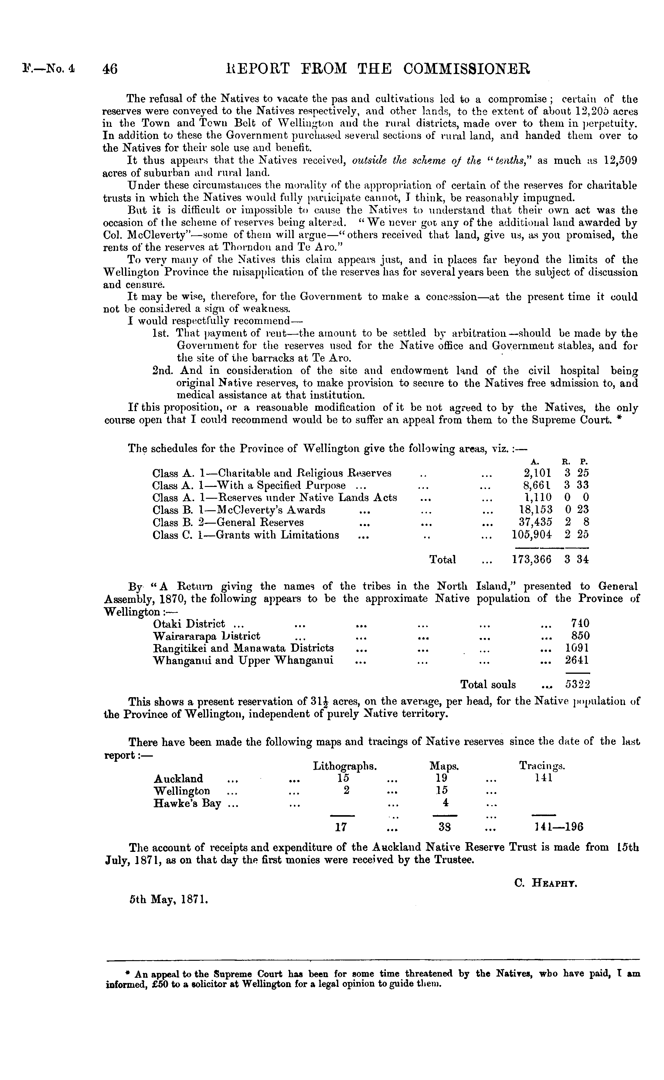 The refusal of the Natives to vacate the pas and cultivations led to a compromise ; certain of the reserves were conveyed to the Natives respectively, and other lands, to the extent of about 12,205 acres in the Town and Town Bolt of Wellington aud the rural districts, made over to them in perpetuity. In addition to these the Government purchased several sections of rural land, and handed them over to the Natives for their sole use and benefit. It thus appears that the Natives received, outside the scheme of the "tenths" as much as 12,509 acres of suburban and rural land. Under these circumstances the morality of the appropriation of certain of the reserves for charitable trusts in which the Natives would fully participate cannot, I think, be reasonably impugned. But it is difficult or impossible to cause the Natives to understand that their own act was the occasion of the scheme of reserves being altersd. "We never goc any of the additional land awarded by Col. McCleverty"—some of them will argue—"others received that land, give us, as you promised, the rents of the reserves at Thorndon and Te Aro." To very many of the Natives this claim appears just, and in places far beyond the limits of the Wellington Province the misapplication of the reserves has for several years been the subject of discussion and censure. It may be wise, therefore, for the Government to make a concession—at the present time it could not be considered a sign of weakness. I would respectfully recommend — Ist. That payment of rent—the amount to be settled by arbitration—should be made by the Government for tiie reserves used for the Native office and Government stable 3, and for the site of the barracks at Te Aro. 2nd. And in consideration of the site and endowment 1-md of the civil hospital being original Native reserves, to make provision to secure to the Natives free admission to, and medical assistance at that institution. If this proposition, ox a reasonable modification of it be not agreed to by the Natives, the only course open that I could recommend would be to suffer an appeal from them to the Supreme Court. * The schedules for the Province of Wellington give the following areas, viz. :— A. R. P. Class A. I—Charitable and Religious Reserves .. ... 2,101 3 25 Class A. I—With a Specified Purpose ... ... ... 8,661 3 33 Class A. I—Reserves under Native Lands Acts ... ... 1,110 0 0 Class B. I—McCJeverty's Awards ... ... ... 18,153 0 23 Class B. 2—General Reserves ... ... ... 37,435 2 8 Class C. I—Grants with Limitations ... .. ... 105,904 225 Total ... 173,366 334 By " A Return giving the names of the tribes in the North Island," presented to General Assembly, 1870, the following appears to be the approximate Native population of the Province of Wellington: — Otaki District ... ... ... ... ... ... 740 Wairararapa District ... ... ... ... ... 850 Rangitikei and Manawata Districts ... ... ... ... 1091 Whanganui and Upper Whanganui ... ... ... ... 2641 Total souls ... 5322 This shows a present reservation of 31J aci'es, on the average, per head, for the Native population of the Province of Wellington, independent of purely Native territory. There have been made the following maps and tracings of Native reserves since the date of the last report:— Lithographs. Maps. Tracings. Auckland ... ... 15 ... 19 ... HI Wellington ... ... 2 ... 15 Hawke's Bay ... ... ... 4 17 ... 33 ... 141—196 The account of receipts and expenditure of the Auckland Native Reserve Trust is made from 15th July, 1871, as on that day the first monies were received by the Trustee. C. Heapht. sth May, 1871. * An appeal to the Supreme Court has been for some time threatened by the Natires, wbo have paid, t am informed, £50 to a solicitor at Wellington for a legal opinion to guide them.