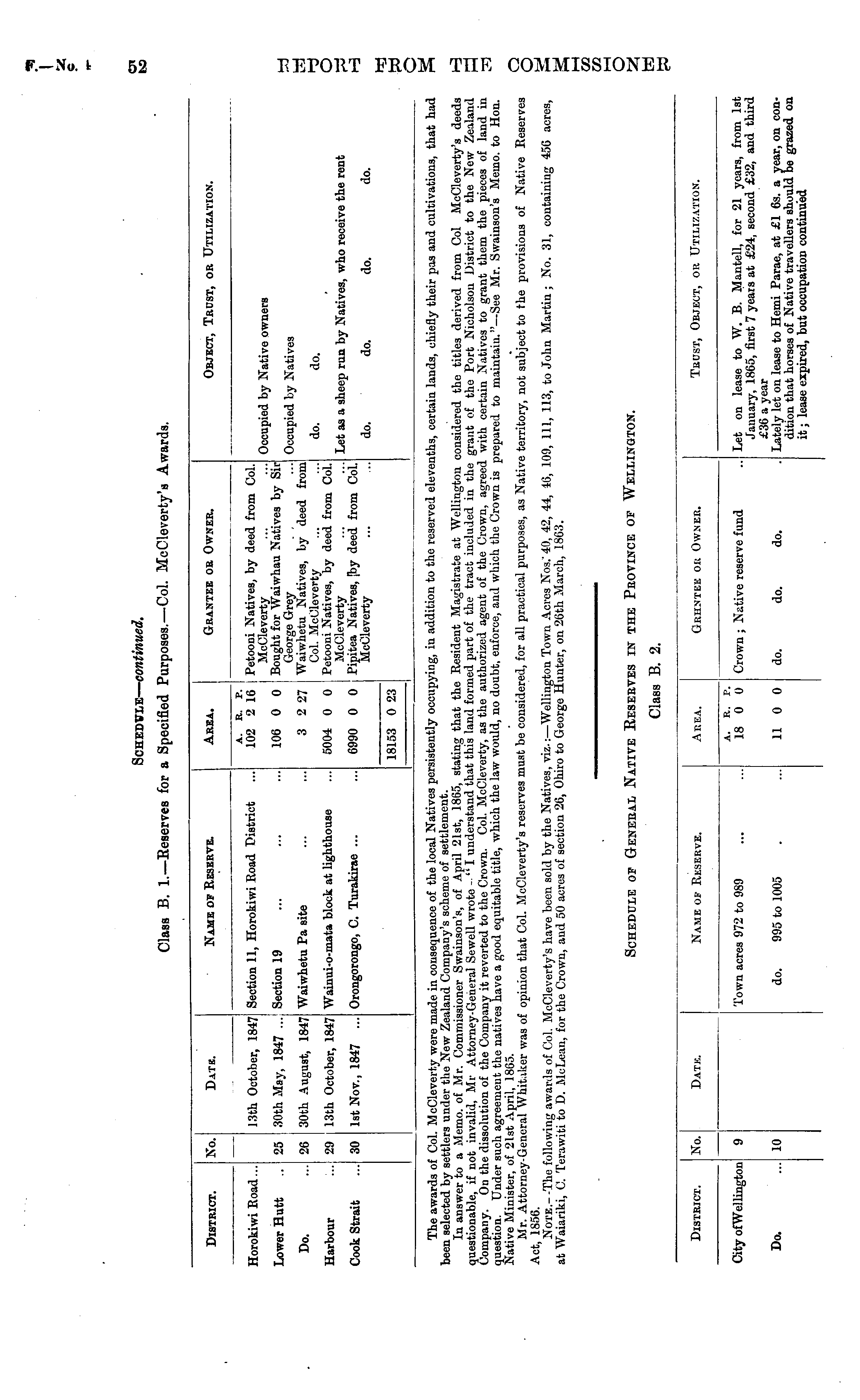 District. No. Date. Name of Reserve. Area. Grantee or Owner. Object, Trust, or Utilization. I Horokiwi Road... 13th October, 1847 Section 11, Horokiwi Road District a. r. p. j 102 2 16 i Petooni Natives, by deed from Col. McCle verty Bought for Waiwhau Natives by Sir George Grey Waiwhetu Natives, by deed from Col. McOleverty Petooni Natives, by deed from Col. McCleverty Pipitea Natives, [by deed from Col. McCleverty Lower Hutt 30th May, 1847 ... Section 19 106 0 0 Occupied by Native owners 25 Occupied by Natives Do. 2(i 30th August, 1847 Waiwhetu Pa site 3 2 27 do. do. Harbour 29 13th October, 1847 Wainui-o-mata block at lighthouse 5004 0 0 Cook Strait 30 Orongorongo, C. Turakirae ... 6990 0 0 ! Let as a sheep run by Natives, who receive the rent 1st Nov., 1847 ... do. do. do. do. 18153 0 23 The awards of Col. McCleverfcy were made in consequence of the local Natives persistently occupying, in addition to the reserved elevenths, certain lands, chiefly their pas and cultivations, that had been selected by settlers under the New Zealand Company's scheme of settlement. In answer to a Memo, of Mr. Commissioner Swainson's, of April 21st, 1865, stating that the Resident Magistrate at Wellington considered the titles derived from Col McCleverty's deeds questionable, if not invalid, Mr Attorney-General Sewell wrote -■" I understand that this land formed part of the tract included in the grant of the Port Nicholson District to the New Zealand Company. On the dissolution of the Company it reverted to the Crown. Col. McCleverty, as the authorized agent of the Crown, agreed with certain Natives to grant them the pieces of land in question. Under such agreement the natives have a good equitable title, which the law would, no doubt, enforce, and which the Crown is prepared to maintain." —See Mr. Swainson's Memo, to Hon. Native Minister, of 2lst April, 1865. ■ • Mr. Attorney-General Whit.tker was of opinion that Col. McCleverty's reserves must be considered, for all practical purposes, as Native territory, not subject to the provisions of Native Reserves Act, 1850. Note.- -The following awards of Col. McCleverty's have been sold by the Natives, viz.: —Wellington Town Acres Nos.'40, 42, 44, 46, 109, 111, 113, to John Martin ; No. 31, containing 456 acres, at Waiariki, C. Terawiti to D. McLean, for the Crown, and 50 acres of section 26, Ohiro to George Hunter, on 26th March, 1863. Schedule op Geneeal Native Besebves in the Peovince op Wellington. Class B. 2. District. No. Datk. Name of Reserve. Area. Grhntee oi; Owner. Trust, Object, or Utilization. City of Wellington I Town acres 972 to 989 a. r. p. 18 0 0 Crown ; Native reserve fund Let on lease to W. B. Mantell, for 21 years, from 1st January, 1865, first 7 years at £24, second £32, and third £36 a year Lately let on lease to Hemi Parae, at £1 6s. a year, on condition that horses of Native travellers should be grazed on it; lease expired, but occupation continued Do. do. 995 to 1005 11 0 0 do. do. do. 10
