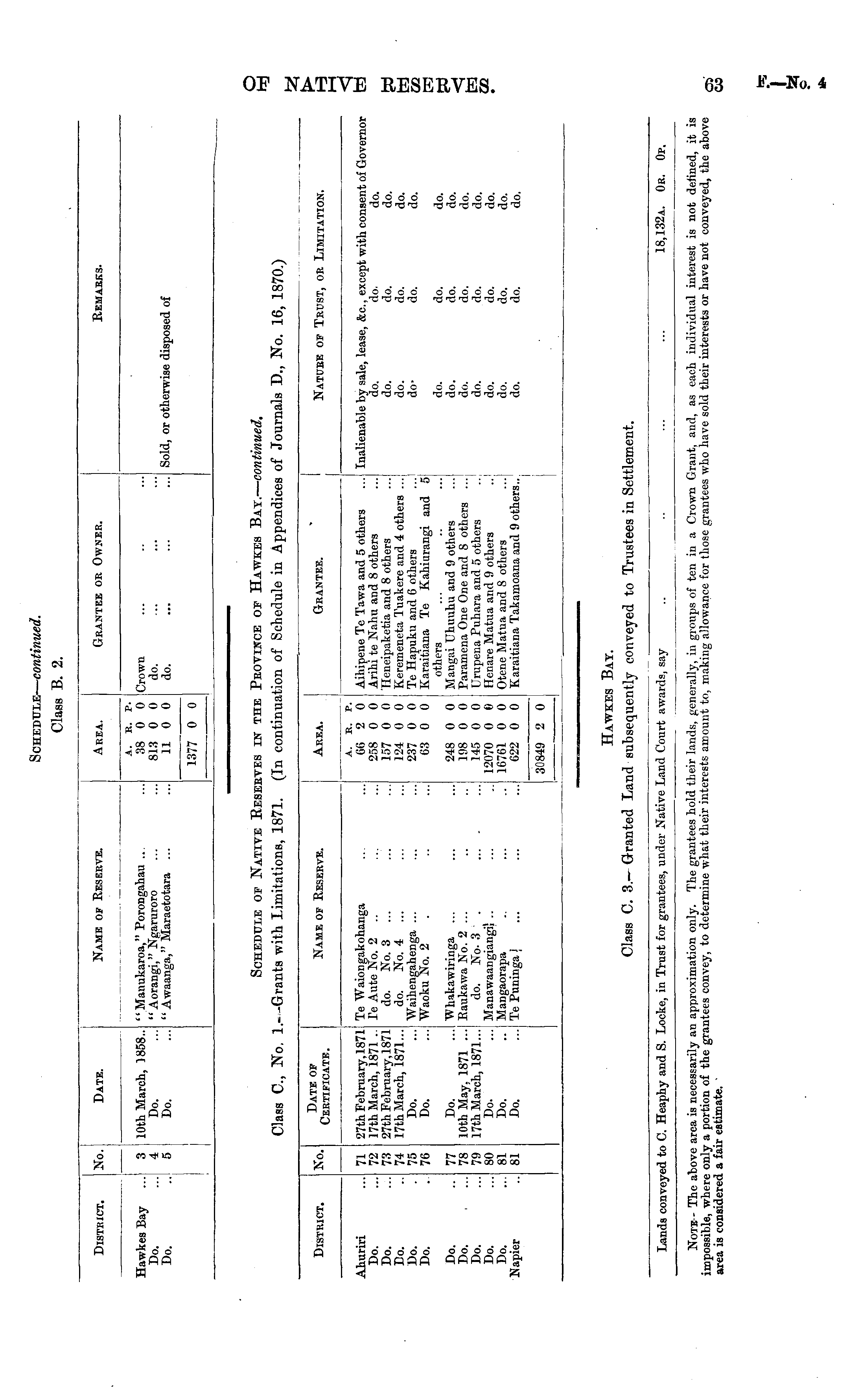 Hawkes Bat. Class C. 3.— Granted Land subsequently conveyed to Trustees in Settlement. Lands conveyed to C. Heaphy and S. Locke, in Trust for grantees, under Native Land Court awards, say .. .. ... ... 18,132a. Or. Op. Note - The above area is necessarily an approximation only. The grantees hold their lands, generally, in groups of ten in a Crown Grant, and, as each individual interest is not defined, it is impossible, where only a portion of the grantees convey, to determine what their interests amount to, making allowance for those grantees who have sold their interests or have not conveyed, the above area is considered a fair estimate.