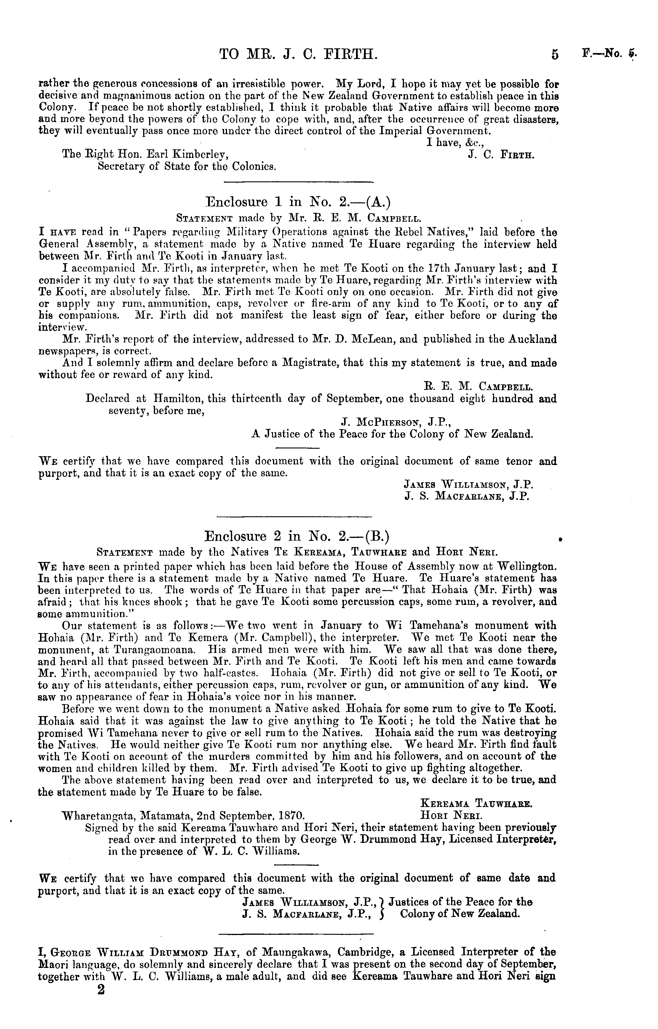 Enclosure 2in No. 2. — (B.) Statement made by the Natives Te Kereama, Tauwhare and Hori Neri. We have seen a printed paper which has been laid before the House of Assembly now at Wellington. In this paper there is a statement made by a Native named Te Huare. Te Huare's statement has been interpreted to us. The words of Te Huare in that paper are—" That Hohaia (Mr. Firth) was afraid ; that his knees shook; that he gave Te Kooti some percussion caps, some rum, a revolver, aud some ammunition." Our statement is as follows:—We two went in January to Wi Tamehana's monument with Hohaia (Mr. Firth) and Tc Kemera (Mr. Campbell), the interpreter. We met Te Kooti near the monument, at Turangaomoana. His armed men were with him. We saw all that was done there, and heard all that passed between Mr. Firth and Te Kooti. Te Kooti left his men and came towards Mr. Firth, accompanied by two half-castes. Hohaia (Mr. Firth) did not give or sell to Te Kooti, or to any of his attendants, either percussion caps, rum, revolver or gun, or ammunition of any kind. We saw no appearance of fear in Hohaia's voice nor in his manner. Before we went down to the monument a Native asked Hohaia for some rum to give to Te Kooti. Hohaia said that it was against the law to give anything to Te Kooti; he told the Native that he promised Wi Tamehana never to give or sell rum to the Natives. Hohaia said the rum was destroying the Natives. He would neither give Te Kooti rum nor anything else. We heard Mr. Firth find fault with Tc Kooti on account of the murders committed by him and his followers, and on account of the women and children killed by them. Mr. Firth advised Te Kooti to give up fighting altogether. The above statement having been read over and interpreted to us, we declare it to be true, and the statement made by Te Huare to be false. Kereama Tauwhare. Wharetangata, Matamata, 2nd September, 1870. Hori Neri. Signed by the said Kereama Tauwhare and Hori Neri, their statement having been previously read over and interpreted to them by George W. Drummond Hay, Licensed Interpreter, in the presence of W. L. C. Williams. We certify that we have compared this document with the original document of same date and purport, and that it is an exact copy of the same. James Williamson, J.P., 7 Justices of the Peace for the J. S. Macfarlane, J.P., ) Colony of New Zealand.