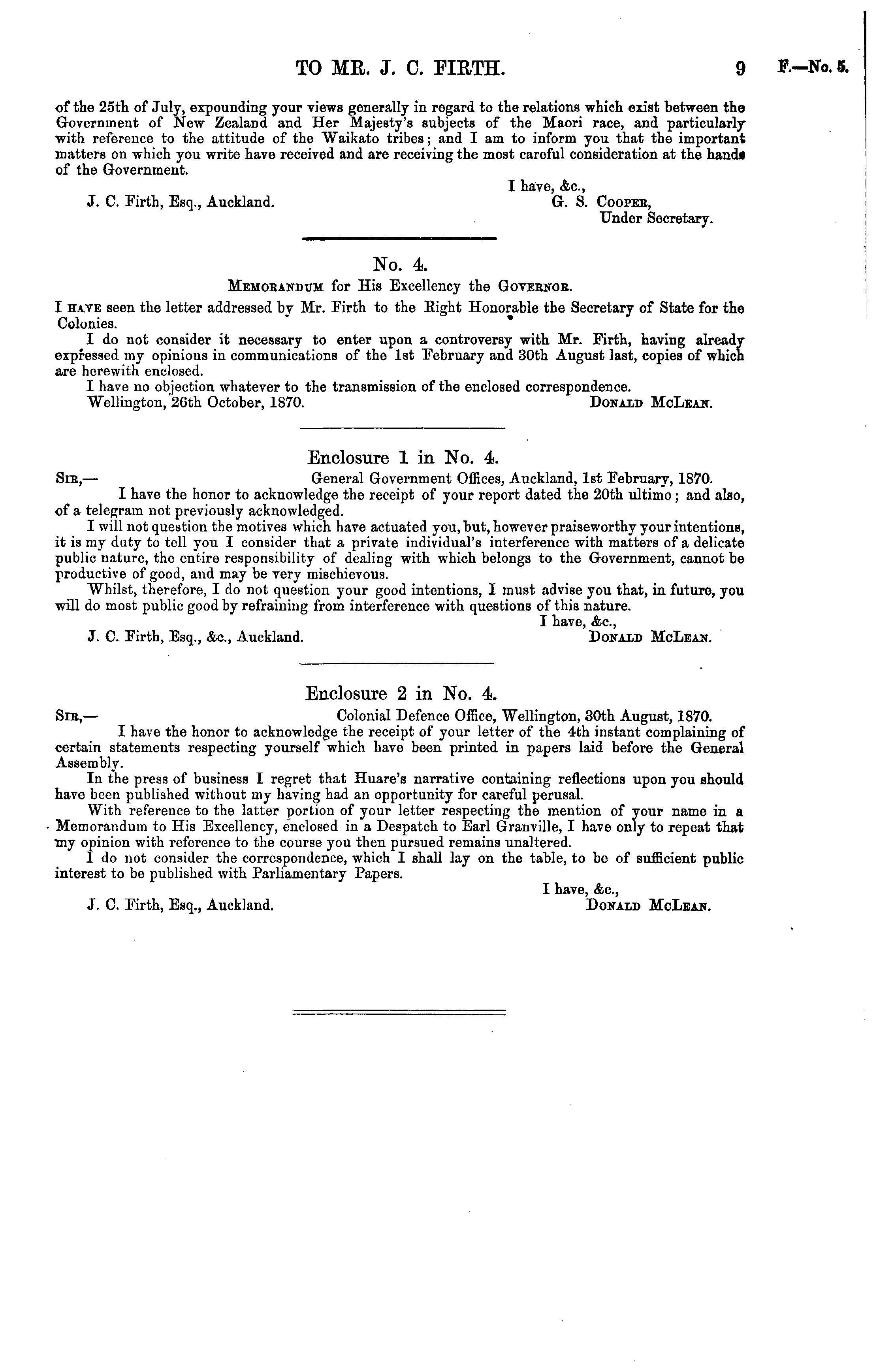 Enclosure 2 in No. 4. Sir, — Colonial Defence Office, Wellington, 30th August, 1870. I have the honor to acknowledge the receipt of your letter of the 4th instant complaining of certain statements respecting yourself which have been printed in papers laid before the General Assembly. In tho press of business I regret that Huare's narrative containing reflections upon you should have been published without my having had an opportunity for careful perusal. With reference to the latter portion of your letter respecting the mention of your name in a Memorandum to His Excellency, enclosed in a Despatch to Earl Granville, I have only to repeat that my opinion with reference to the course you then pursued remains unaltered. I do not consider the correspondence, which I shall lay on the table, to be of sufficient public interest to be published with Parliamentary Papers. I have, Ac, J. C. Firth, Esq., Auckland. Donald McLean.