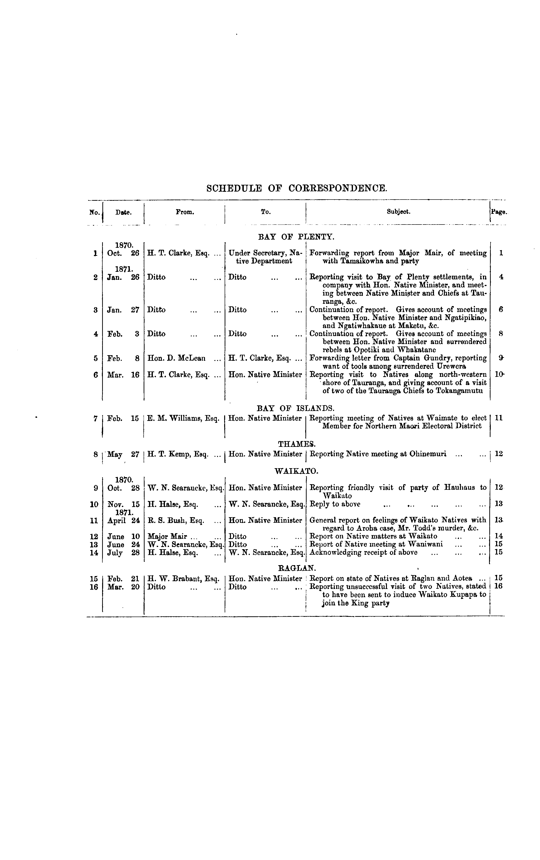 Ifo. D»te. From. To. Subject. Page 1870. Oct. 26 BAY OK PI /ENTY. H. T. Clarke, Esq. ... Under Secretary, Native Department Forwardiug report from Major Mair, of meeting with Tamaikowha and party 1871. Jan. 26 Ditto Ditto Reporting visit to Bay of Plenty settlements, in company with Hon. Native Minister, and meeting between Native Minister and Chiefs at Tauranga, &c. Continuation of report. Gives account of meetings between Hon. Native Minister and Ngatipikiao, and Ngatiwhakaue at Maketu, &e. Continuation of report. Gives account of meetings between Hon. Native Minister and surrendered rebels at Opotiki and Whakatane Forwarding letter from Captain Gundry, reporting want of tools among surrendered XJrcwera Reporting visit to Natives along north-western shore of Tauranga, and giving account of a visit of two of the Tauranga Chiefs to Tokangamutu Jan. 27 Ditto Ditto Feb. 3 Ditto Ditto 5 Feb. 8 Hon. D. McLean H. T. Clarke, Esq. ... 90 Mar. 16 H.T.Clarke, Esq. ... Hon. Native Minister in Feb. 15 E. M. Williams, Esq. BAY OF IS! Hon. Native Minister jANDS. Reporting meeting of Natives at Waimate to elect Member for Northern Maori Electoral District 11 May 27 H. T. Kemp, Esq. ... I THAM1 Hon. Native Minister I :s. Reporting Native meeting at Ohinemuri \-2 1870. Oot. 28 WAIKA' DO. W. N. Searancke, Esq. Hon. Native Minister Reporting friondly visit of partv of Hauhaus to Waikuto Reply to above 9 1-' Id Nov. 15 1871. April 24 H. Halse.Esq. W. N. Searancke, Esq. 13 11 R. S. Bush, Esq. ... Hon. Native Minister General report on feelings of Waikato Natives with regard to Aroha case, Mr. Todd's murder, &c. Report on Native matters at Waikato Report of Native meeting at Waniwam Acknowledging receipt of above 13 12 I 1 June 10 June 84 July 28 Major Mair ... W. N. Searancke, Esq. H. Halse, Esq. Ditto Ditto W. N. Searancke, Esq. I 1 IB 16 Feb. 21 Mar. 20 H. W. Brabant, Esq. Ditlo RAGL4 N. us 16 Hon. Native Minister Ditto Report on Btato of Natives at Raglan and Aotea ... Reporting unsuccessful visit of two Natives, stated to have been sent to induce Waikato Kupapa to join the King party 15 l(i