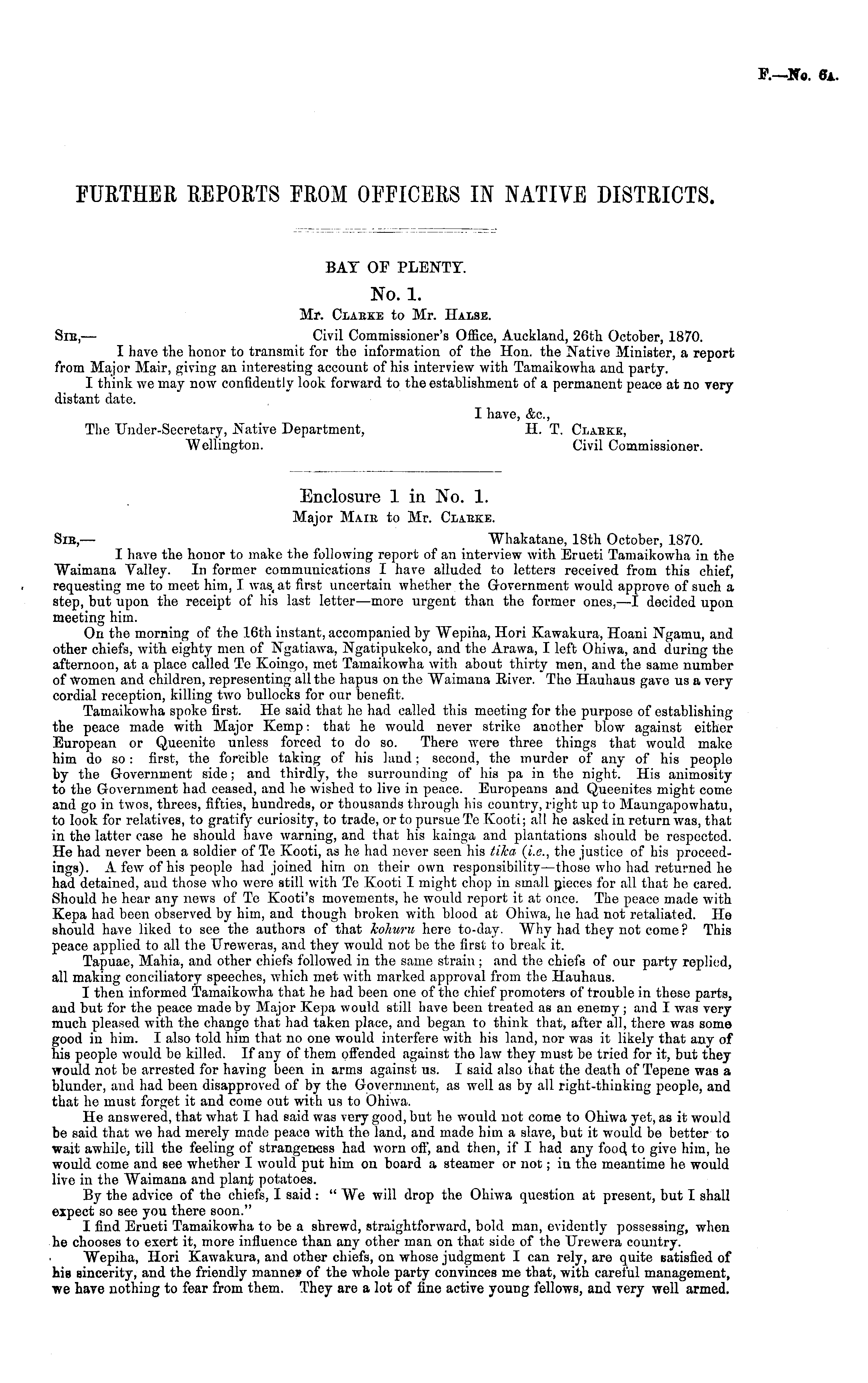 BAT OF PLENTY. No. 1. Mr. Clarke to Mr. Halse. Sie, — Civil Commissioner's Office, Auckland, 26th October, 1870. I have the honor to transmit for the information of the Hon. the Native Minister, a report from Major Mair, giving an interesting account of his interview with Tamaikowha and party. I think we may now confideutly look forward to the establishment of a permanent peace at no very distant date. I have, &c, The Under-Secretary, Native Department, H. T. Clarke, "Wellington. Civil Commissioner.