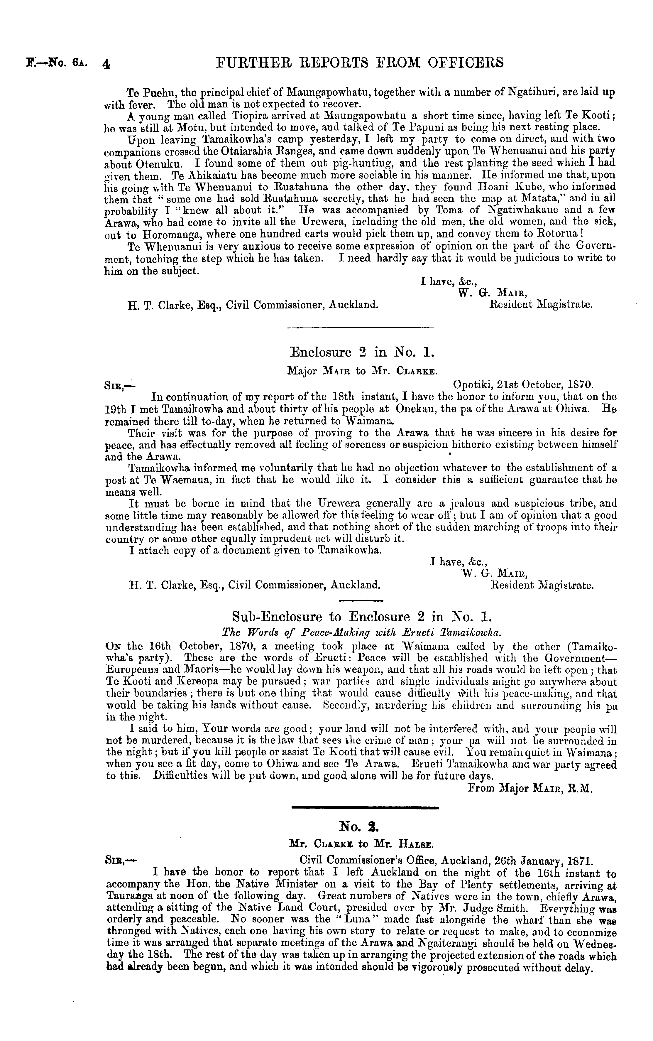 Enclosure 2 in No. 1. Major Mair to Mr. Clarke. Sir,— Opotiki, 21st October, 1870. In continuation of my report of the 18th instant, I have the honor to inform you, that on the 19th I met Tamaikowha and about thirty of his people at Onekau, the pa of the Arawa at Ohiwa. He remained there till to-day, when he returned to Waimana. Their visit was for the purpose of proving to the Arawa that he was sincere iu his desire for peace, and has effectually removed all feeling of soreness or suspicion hitherto existing between himself and the Arawa. Tamaikowha informed me voluntarily that he had no objection whatever to the establishment of a post at Te Waemaua, in fact that he would like it. I consider this a sufficient guarantee that ho means well. It must be borne in mind that the Urewera generally are a jealous and suspicious tribe, and some little time may reasonably be allowed for this feeling to wear off; but lam of opinion that a good understanding has been established, and that nothing short of the sudden marching of troops into their country or some other equally imprudent act will disturb it. I attach copy of a document given to Tamaikowha. I have, &c, W. G. Mair, H. T. Clarke, Esq., Civil Commissioner, Auckland. Resident Magistrate.