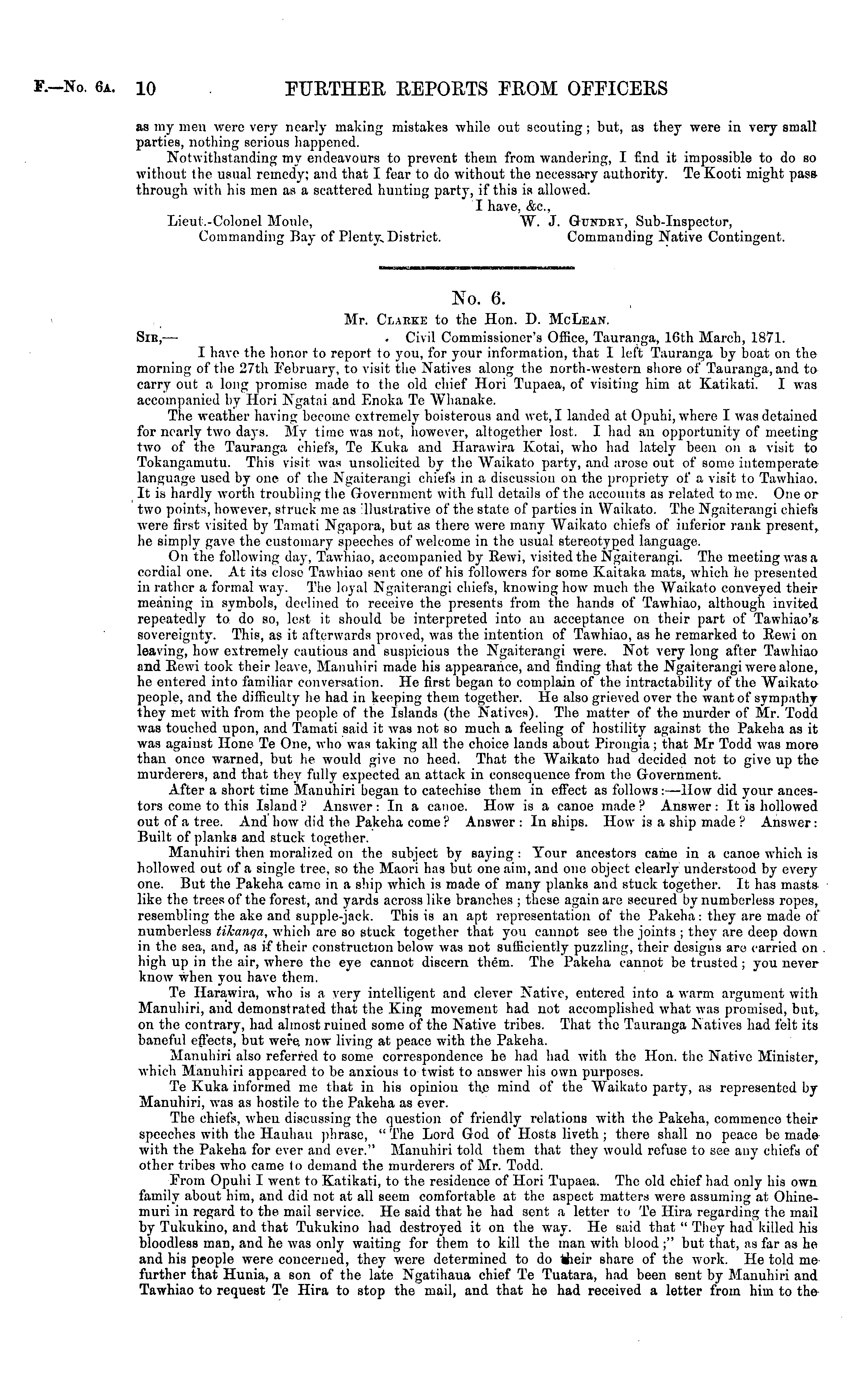 No. 6. Mr. Clarke to the Hon. D. McLean. Sir, — Civil Commissioner's Office, Tauranga, 16th March, 1871. I have the honor to report to } rou, for your information, that I left Tauranga by boat on the morning of the 27th February, to visit the Natives along the north-western shore of Tauranga, and to carry out a long promise made to the old chief Hori Tupaea, of visiting him at Katikati. I was accompanied by Hori Ngatai and Enoka Te Whanake. The weather having become extremely boisterous and wet, I landed at Opuhi, where I was detained for nearly two days. My time was not, however, altogether lost. I had an opportunity of meeting two of the Tauranga chiefs, To Kuka and Harawira Kotai, who had lately been on a visit to Tokangainutu. This visit was unsolicited by the Waikato party, and arose out of somo intemperate language used by one of the Ngaiterangi chiefs in a discussion on the propriety of a visit to Tawhiao. It is hardly worth troubling the Government with full details of the accounts as related to me. One or two points, however, struck me as illustrative of the state of parties in Waikato. The Ngaiterangi chiefs were first visited by Tamati Ngapora, but as there were many Waikato chiefs of inferior rank present, he simply gave the customary speeches of welcome in the usual stereotyped language. On the following day. Tawhiao, accompanied by Rewi, visited the Ngaiterangi. The meeting was a cordial one. At its close Tawhiao sent one of his followers for some Kaitaka mats, which he presented in rather a formal way. The loyal Ngaiterangi chiefs, knowing how much the Waikato conveyed their meaning in symbols, declined to receive the presents from the hands of Tawhiao, although invited repeatedly to do so, lest it should be interpreted into an acceptance on their part of Tawhiao's sovereignty. This, as it afterwards proved, was the intention of Tawhiao, as he remarked to Rewi on leaving, how extremely cautious and suspicious the Ngaiterangi were. Not very long after Tawhiao and Rewi took their leave, Manuhiri made his appearance, and finding that the Ngaiterangi were alone, he entered into familiar conversation. He first began to complain of the intractability of the Waikato people, and the difficulty he had in keeping them together. He also grieved over the want of sympathy they met with from the people of the Islands (the Natives). The matter of the murder of Mr. Todd was touched upon, and Tamati said it was not so much a feeling of hostility against the Pakeha as it was against Hone Te One, who was taking all the choice lands about Pirongia ; that Mr Todd was more than once warned, but he would give no heed. That the Waikato had decided not to give up the murderers, and that they fully expected an attack in consequence from the Government. After a short time Manuhiri began to catechise them in effect as follows: —How did your ancestors come to this Island? Answer: In a canoe. How is a canoe made? Answer: It is hollowed out of a tree. And how did the Pakeha come ? Answer :In ships. How is a ship made ? Answer: Built of planks and stuck together. Manuhiri then moralized on the subject by saying : Tour ancestors came in a canoe which is hollowed out of a single tree, so the Maori has but one aim, and one object clearly understood by every one. But the Pakeha came in a ship which is made of many planks and stuck together. It has masts like the trees of the forest, and yards across like branches ; these again are secured by numberless ropes, resembling the ake and supple-jack. This is an apt representation of the Pakeha: they are made of numberless tikanga, which are so stuck together that you cannot see the joints ; they are deep down in tho sea, and, as if their construction below was not sufficiently puzzling, their designs are carried on . high up in the air, where the eye cannot discern them. The Pakeha cannot be trusted ; you never know when you have them. Te Harawira, who is a very intelligent and clever Native, entered into a warm argument with Manuhiri, and demonstrated that the King movement had not accomplished what was promised, but, on the contrary, had almost ruined some of the Native tribes. That the Tauranga Natives had felt its baneful effects, but were, now living at peace with the Pakeha. Manuhiri also referred to some correspondence ho had had with tho Hon. the Native Minister, which Manuhiri appeared to be anxious to twist to answer his own purposes. Te Kuka informed me that in his opinion th.e mind of the Waikato party, as represented by Manuhiri, was as hostile to the Pakeha as ever. The chief's, when discussing the question of friendly relations with the Pakeha, commence their speeches with the Hauhau phrase, " The Lord God of Hosts liveth ; there shall no peace be made with the Pakeha for ever and ever." Manuhiri told them that they would refuse to see any chiefs of other tribes who came to demand the murderers of Mr. Todd. From Opuhi I went to Katikati, to the residence of Hori Tupaea. The old chief had only his own family about him, and did not at all seem comfortable at the aspect matters were assuming at Ohinemuri in regard to the mail service. He said that he had sent a letter to Te Hira regarding the mail by Tukukino, and that Tukukino had destroyed it on the way. He said that " They had killed his bloodless man, and he was only waiting for them to kill the man with blood ;" but that, as far as he and his people were concerned, they were determined to do t_iieir share of the work. He told me further that Hunia, a son of the late Ngatihaua chief Te Tuatara, had been sent by Manuhiri and Tawhiao to request Te Hira to stop the mail, and that he had received a letter from him to the