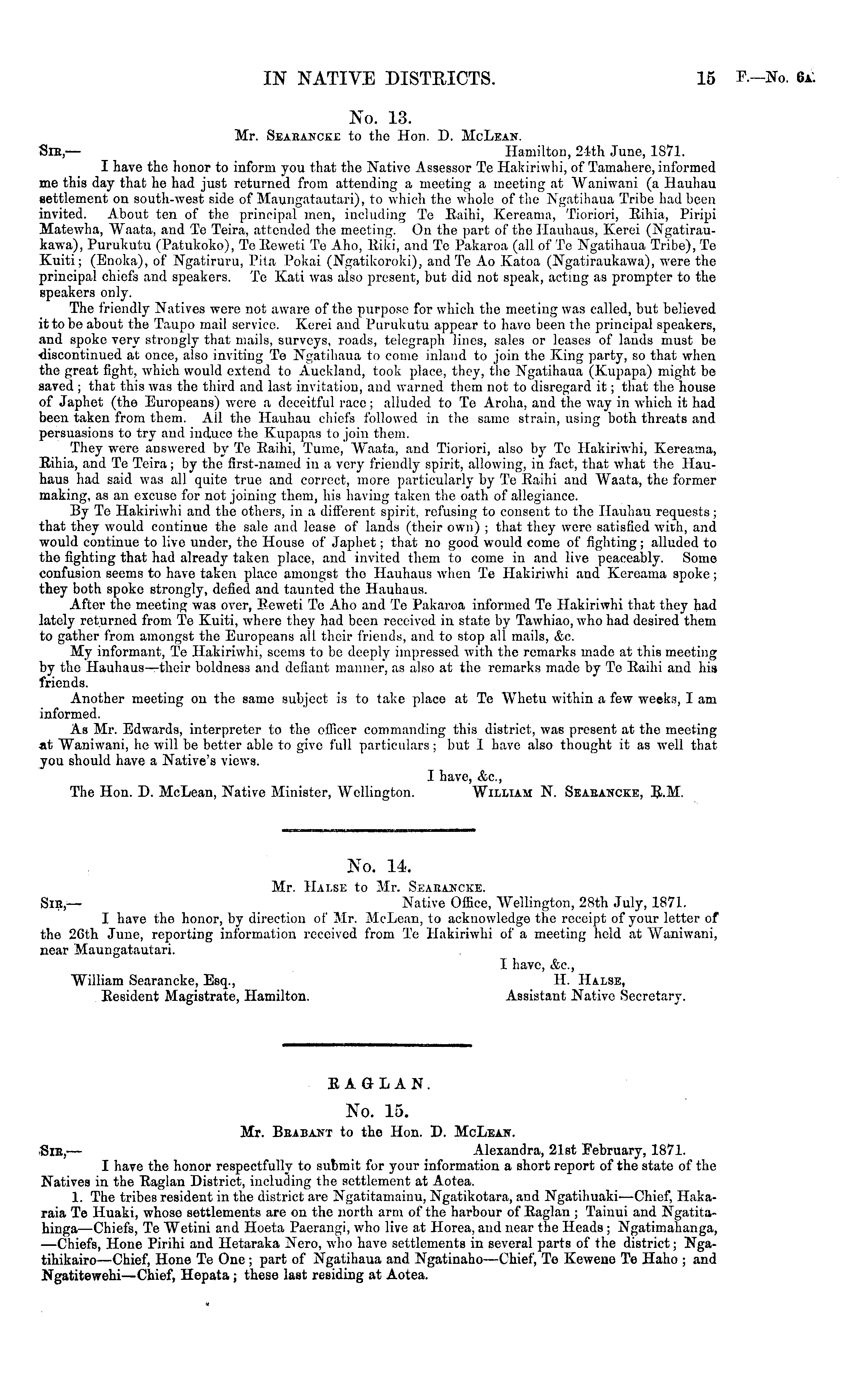 RAGLAN. No. 15. Mr. Brabant to the Hon. D. McLean. Sie, — Alexandra, 21st February, 1871. I have the honor respectfully to submit for your information a short report of the state of the Natives in the Raglan District, including the settlement at Aotea. 1. The tribes resident in the district are Ngatitamainu, Ngatikotara, and Ngatihuaki—Chief, Hakaraia Te Huaki, whose settlements are on the north arm of the harbour of Raglan ; Tainui and Ngatitahinga —Chiefs, Te Wetini and Hoeta Paerangi, who live at Horea, and near the Heads ; Ngatimahanga, —Chiefs, Hone Pirihi and Hetaraka Nero, who have settlements in several parts of the district; Ngatihikairo—Chief, Hone Te One ; part of Ngatihaua and Ngatinaho—Chief, Te Kewene Te Haho ; and Ngatitewehi—Chief, Hepata; these last residing at Aotea.