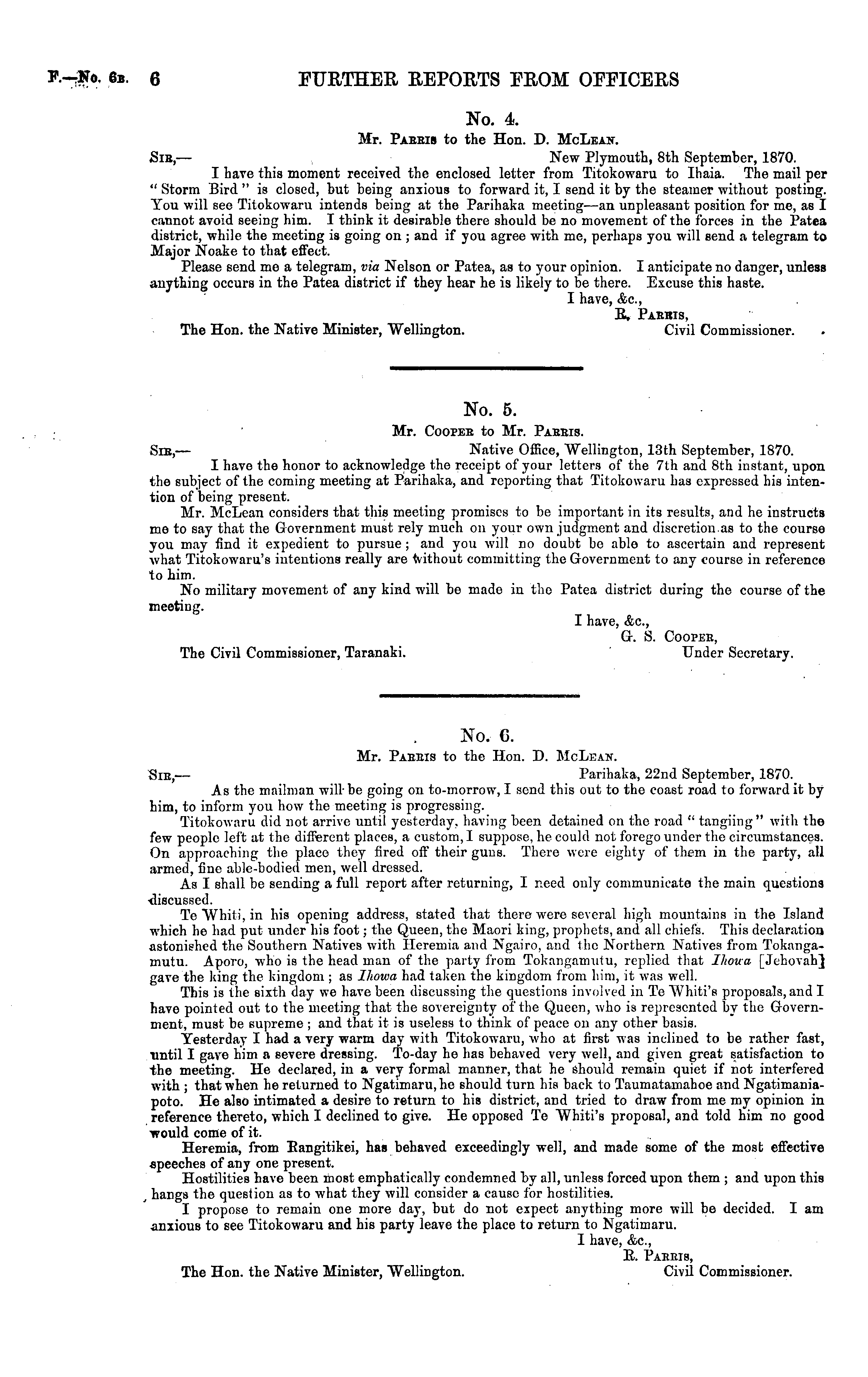 No. 5. Mr. Coopee to Mr. Paeeis. Sib, — Native Office, Wellington, 13th September, 1870. I have the honor to acknowledge the receipt of your letters of the 7th and Bth instant, upon the subject of the coming meeting at Parihaka, and reporting that Titokowaru has expressed his intention of being present. Mr. McLean considers that this meeting promises to be important in its results, and he instructs me to say that the Government must rely much on your own judgment and discretion.as to the course you may find it expedient to pursue ; and you will no doubt be able to ascertain and represent what Titokowaru's intentions really are without committing the Government to any course in reference to him. No military movement of any kind will be made in the Patea district during the course of the meeting. I have, &c, G. S. Coopee, The Civil Commissioner, Taranaki. Under Secretary.