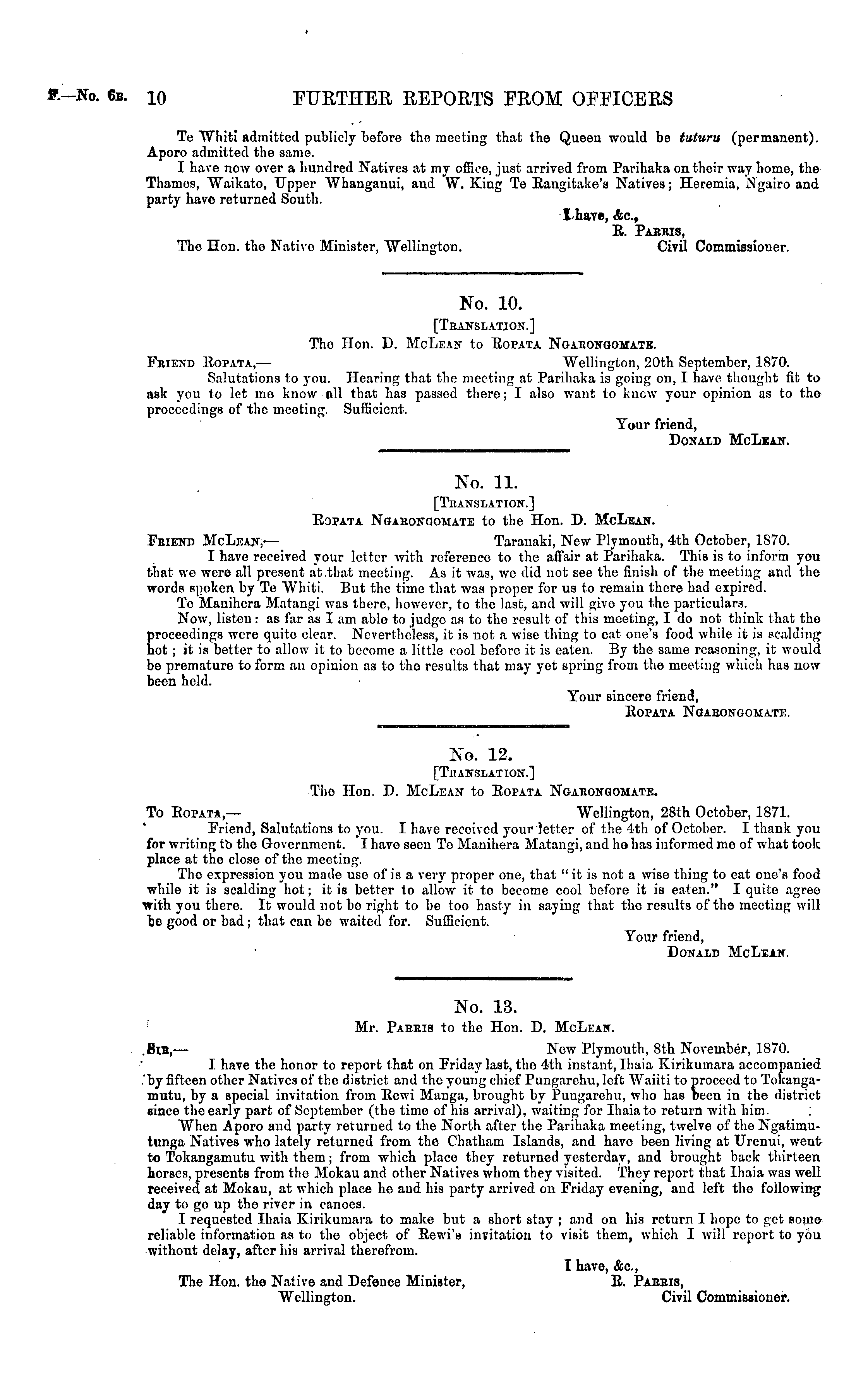 No. 10. [Translation.] Tho Hon. D. McLean to Eopata Ngarongomate. Friend Eopata,— Wellington, 20th September, IS7O. Salutations to you. Hearing that the meeting at Parihaka is going on, I have thought fit to ask you to let mo know all that has passed there; I also want to know your opinion as to the proceedings of the meeting. Sufficient. Tour friend, Donald McLean.