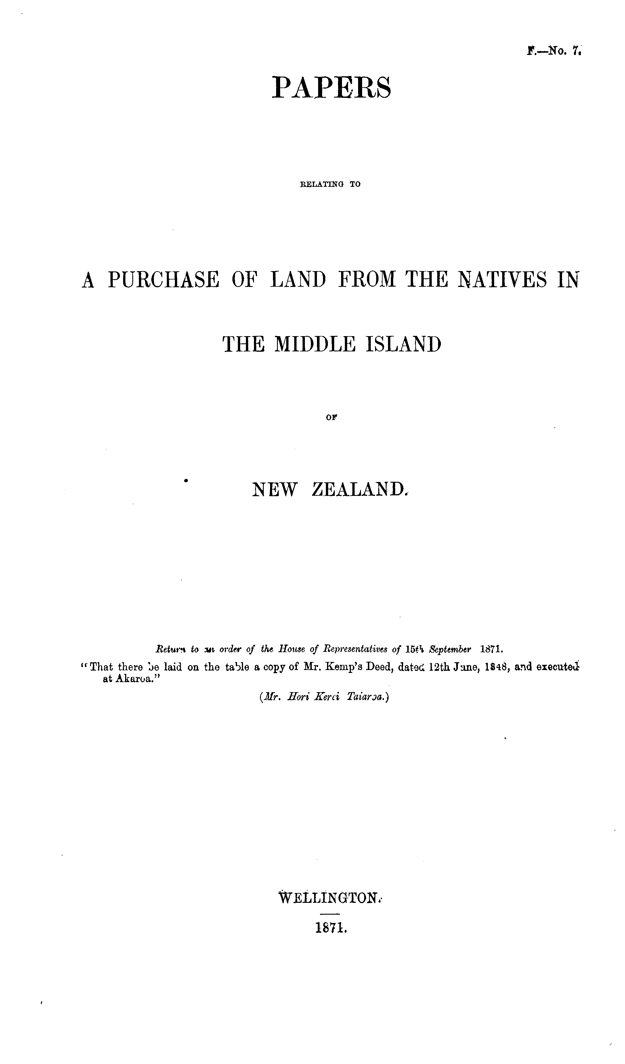 Return to 311 order of the House of Representatives of 15t\ September 1871. "That there he laid on the table a copy of Mr. Kemp's Deed, dateci 12th June, 1848, and executed at Akaroa." (Mr. Hori Kerei Taiaroa.)