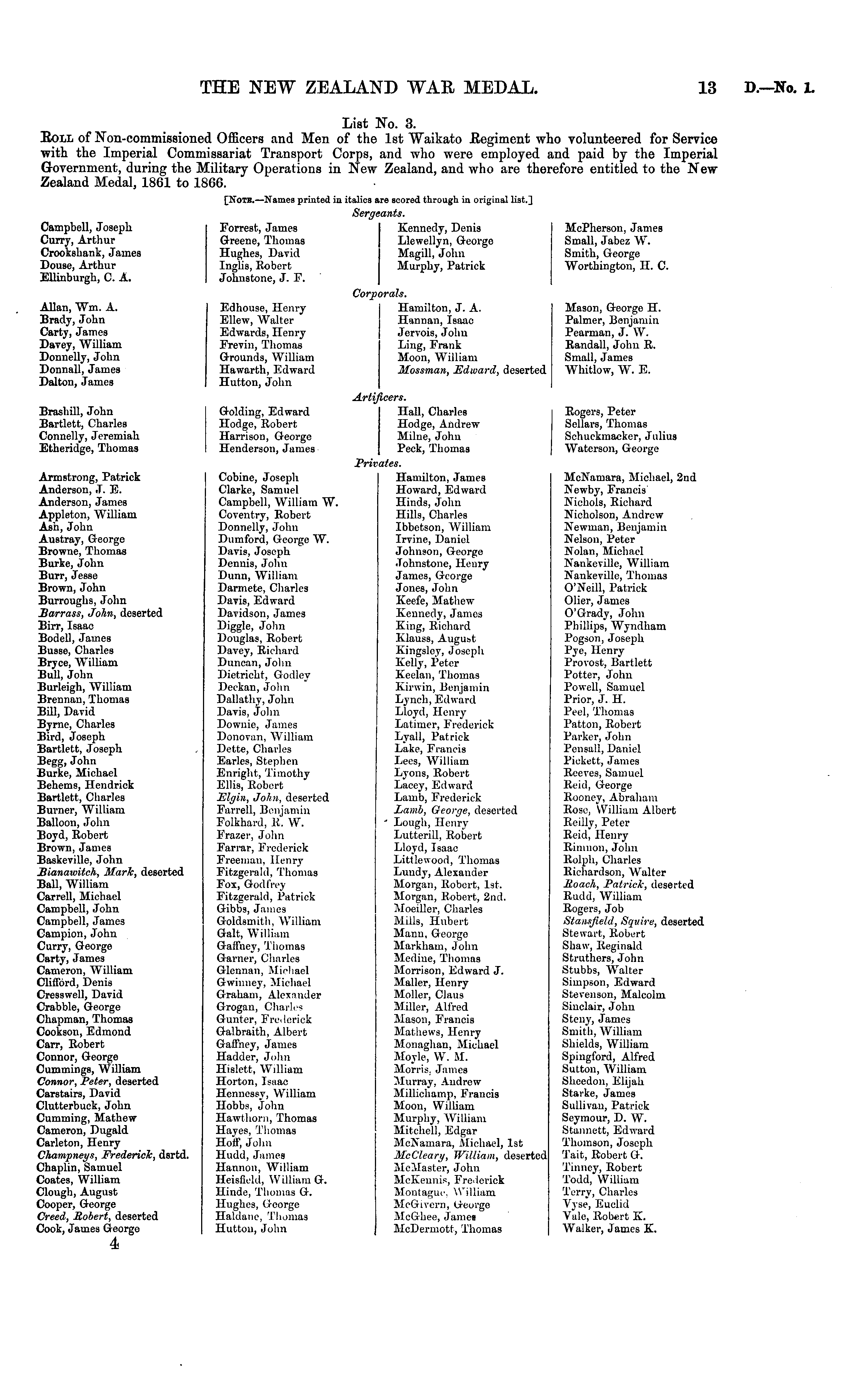 List No. 3. Roll of Non-commissioned Officers and Men of the Ist Waikato Regiment who volunteered for Service with the Imperial Commissariat Transport Corps, and who were employed and paid by the Imperial Government, during the Military Operations in New Zealand, and who are therefore entitled to the New Zealand Medal, 1861 to 1866. [Note. —Names printed in italics are scored through in original list.] Sergeants. Campbell, Joseph Forrest, James Kennedy, Denis McPherson, James Curry, Arthur Greene, Thomas Llewellyn, George Small, Jabez AV. Crookshank, James Hughes, David Magill, John Smith, George Douse, Arthur Inglis, Robert Murphy, Patrick AVorthington, H. C. Ellinburgh, C. A. Johnstone, J. F. Corporals. Allan, Wm. A. Edhouse, Henry Hamilton, J. A. Mason, George H. Brady, John Ellew, AValter Hannan, Isaac Palmer, Benjamin Carty, James Edwards, Henry Jervois, John Pearman, J. AV. Davey, William Frevin, Thomas Ling, Frank Randall, John R. Donnelly, John Grounds, William Moon, William Small, James Donnall, James Hawarth, Edward Mossman, Edward, deserted Whitlow, AA T. E. Dalton, James Hutton, John Artificers. Brashill, John Golding, Edward Hall, Charles Rogers, Peter Bartlett, Charles Hodge, Robert Hodge, Andrew Sellars, Thomas Connelly, Jeremiah Harrison, George Milne, John Schuckmacker, Julius Etheridge, Thomas Henderson, James Peck, Thomas AVaterson, George Privates. Armstrong, Patrick Cobine, Joseph Hamilton, James McNamara, Michael, 2nd Anderson, J. E. Clarke, Samuel Howard, Edward Newby, Francis Anderson, James Campbell, AArilliam W. Hinds, John Nichols, Richard Appleton, William Coventry, Robert Hills, Charles Nicholson, Andrew Ash, John Donnelly, John Ibbetson, AVilliam Newman, Benjamin Austray, George Dumford, George AV. Irvine, Daniel Nelson, Peter Browne, Thomas Davis, Joseph Johnson, George Nolan, Michael Burke, John Dennis, John Johnstone, Henry Nankeville, AVilliam Burr, Jesse Dunn, AArilliam James, George Nankeville, Thomas Brown, John Darmete, Charles Jones, John O'Neill, Patrick Burroughs, John Davis, Edward Keefe, Mathew Olier, James Barrass, John, deserted Davidson, James Kennedy, James O'Grady, John Birr, Isaac Diggle, John Ring, Richard Phillips, AVyndham Bodell, James Douglas, Robert Klauss, August Pogson, Joseph Busso, Charles Davey, Richard Kingsley, Joseph Pye, Henry Bryce, AA'dbam Duncan, John Kelly, Peter Provost, Bartlett Bull, John Dietricht, Godley Keelan, Thomas Potter, John Burleigh, AVilliam Deckan, John Kirwin, Benjamin Powell, Samuel Brennan, Thomas Dallathy, John Lynch, Edward Prior, J. H. Bill, David Davis, John Lloyd, Henry Peel, Thomas Byrne, Charles Dowuie, James Latimer, Frederick Patton, Robert Bird, Joseph Donovan, AVilliam Lyall, Patrick Parker, John Bartlett, Joseph Dette, Charles Lake, Francis Pensall, Daniel Begg, John Earles, Stephen Lees, AVilliam Pickett, James Burke, Michael Enright, Timothy Lyons, Robert Reeves, Samuel Behems, Hendrick Ellis, Robert Lacey, Edward Reid, George Bartlett, Charles Elgin, John, deserted Lamb, Frederick Rooney, Abraham Burner, AVilliam Farrell, Benjamin Lamb, George, deserted Rose, William Albert Balloon, John Folkhanl, R. W. ' Lough, Henry Reilly, Peter Boyd, Robert Frazer, John Lutterill, Robert Reid, Henry Brown, James Farrar, Frederick Lloyd, Isaac Rimnon, John Baskeville, John Freeman, Henry Littlewood, Thomas Rolph, Charles Bianawitch, Mark, deserted Fitzgerald, Thomas Lundy, Alexander Richardson, A.ralter Ball, AVilliam Fox, Godfrey Morgan, Robert, Ist. Roach, Patrick, deserted Carrell, Michael Fitzgerald, Patrick Morgan, Robert, 2nd. Rudd, AVilliam Campbell, John Gibbs, James Moeiller, Charles Rogers, Job Campbell, James Goldsmith, AArilliam Mills, Hubert Stansfield, Squire, deserted Campion, John Gait, William Mann, George Stewart, Robert Curry, George GafTney, Thomas Markham, John Shaw, Reginald Carty, James Garner, Charles Mediue, Thomas Struthers, John Cameron, AVilliam Glennan, Michael Morrison, Edward J. Stubbs, AValter Clifford, Denis Gwinnej', Michael Mailer, Henry Simpson, Edward Cresswell, David Graham, Alexander Moller, Claus Stevenson, Malcolm Crabble, George Grogan, Charles Miller, Alfred Sinclair, John Chapman, Thomas Gunter, Frederick Mason, Francis Steny, James Cookson, Edmond Galbraith, Albert Mathews, Henry Smith, AVilliam Carr, Robert GafTney, James Monaghan, Michael Shields, AVilliam Connor, George Hadder, John Moyle, AV. M. Spingford, Alfred Cummings, AArilliam Hislett, AA'illiam Morris. James Sutton, AA'illiam Connor, Peter, deserted Horton, Isaac Murray, Andrew Sheedon, Elijah Carstairs, David Hennessy, AVilliam Milliehamp, Francis Starke, James Clutterbuck, John Hobbs, John Moon, William Sullivan, Patrick Cumming, Mathew Hawthorn, Thomas Murphy, AA'illiam Seymour, D. W. Cameron, Dugald Hayes, Thomas Mitchell, Edgar Stannett, Edward Carleton, Henry Hoff, John McNamara, Michael, Ist Thomson, Joseph Champneys, Frederick, dsrtd. Hudd, James McCleary, William, deserted Tait, Robert G. Chaplin, Samuel Hannon, AVilliam McMaster, John Tinney, Robert Coates, William Heisficld, William G. McKennis, Frederick Todd, William Clough, August Hinde, Thomas G. Montague, William Terry, Charles Cooper, George Hughes, George MeGivern, U-eorge Vyse, Euclid Creed, Robert, deserted Haldane, Thomas McGhee, Jamee Vale, Robert K. Cook, James George Hutton, John MeDermott, Thomas Walker, James K. 4