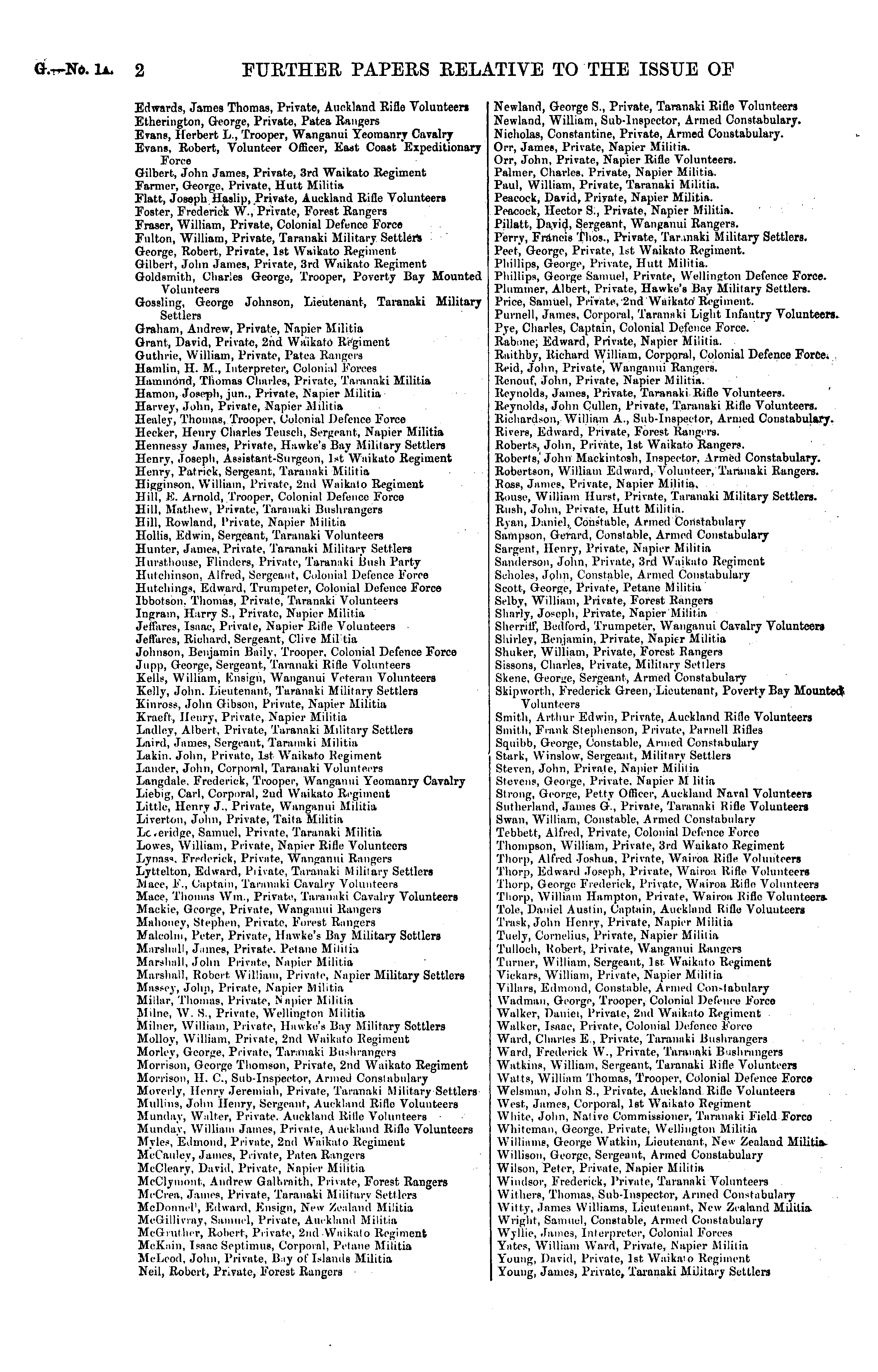 Edwards, James Thomas, Private, Auckland Rifle Volunteers Newland, George S., Private, Taranaki Rifle Volunteers Etherington, George, Private, Patea Rangers Newland, William, Sub-Inspector, Armed Constabulary. Evans, Herbert L., Trooper, Wanganui Yeomanry Cavalry Nicholas, Constantine, Private, Armed Constabulary. Evans, Robert, Volunteer Officer, East Coast Expeditionary Orr, James, Private, Napier Militia. Force Orr, John, Private, Napier Rifle Volunteers. Gilbert, John James, Private, 3rd Waikato Regiment Palmer, Charles, Private, Napier Militia. Parmer, George, Private, Hutt Militia Paul, William, Private, Taranaki Militia. Piatt, Joseph Haslip, Private, Auckland Rifle Volunteers Peacock, David, Private, Napier Militia. Poster, Frederick W., Private, Forest Rangers Peacock, Hector S., Private, Napier Militia. Fraser, William, Private, Colonial Defence Force PiUatt, David, Sergeant, Wanganui Rangers. Fulton, William, Private, Taranaki Military Settlers Perry, Francis Thos., Private, Tar.maki Military Settlers. George, Robert, Private, Ist Waikato Regiment Peet, George, Private, Ist Waikato Regiment. Gilbert, John James, Private, 3rd Waikato Regiment Phillips, George, Private, Hutt Militia. Goldsmith, diaries George, Trooper, Poverty Bay Mounted Phillips, George Samuel, Private, Wellington Defence Force. Volunteers Plummer, Albert, Private, Hawke's Bay Military Settlers. Gossling, George Johnson, Lieutenant, Taranaki Military Price, Samuel, Private, 2nd Waikato Regiment. Settlers Purnell, James, Corporal, Tarantiki Light Infantry Volunteers. Graham, Andrew, Private, Napier Militia Pye, Charles, Captain, Colonial Defence Force. Grant, David, Private, 2nd Waikato Regiment Rabone; Edward, Private, Napier Militia. Guthrie, William, Private, Patea Rangers Raithby, Richard William, Corporal, Colonial Defence Force. Hamlin, 11. M., Interpreter, Colonial Forces Reid, John, Private, Wanganui Rangers. Hammond, Thomas Charles, Private, Taranaki Militia Renouf, John, Private, Napier Militia. Hamon, Joseph, jun., Private, Napier Militia Reynolds, James, Private, Taranaki Rifle Volunteers. Harvey, John, Private, Napier Militia Reynolds, John Cullen, Private, Taranaki Rifle Volunteers. Healey, Thomas, Trooper, Colonial Defence Force Richardson, William A., Sub-Inspector, Armed Constabulary. Hecker, Henry Charles Teuscli, Sergeant, Napier Militia Rivers, Edward, Private, Forest Rangers. Hennessy James, Private, Hawke's Bay Military Settlers Roberts, John, Private, Ist Waikato Rangers. Henry, Joseph, Assistant-Surgeon, Ist Waikato Regiment Roberts,'John Mackintosh, Inspector, Armed Constabulary. Henry, Patrick, Sergeant, Taranaki Militia Robertson, William Edward, Volunteer, Taranaki Rangers. Higginson, William, Private, 2nd Waikato Regiment Boss, James, Private, Napier Militia, Hill, E. Arnold, Trooper, Colonial Defence Force Rouse, William Hurst, Private, Taranaki Military Settlers. Hill, Mathew, Private, Taranaki Bushrangers Rush, John, Private, Hutt Militia. Hill, Rowland, Private, Napier Militia Ryan, Daniel,.Constable, Armed Constabulary Hollis, Edwin, Sergeant, Taranaki Volunteers Sampson, Gerard, Constable, Armed Constabulary Hunter, James, Private, Taranaki Military Settlers Sargent, Henry, Private, Napier Militia Hursthouse, Flinders, Private, Taramiki llush Party Sanderson, John, Private, 3rd Waikato Regiment Hutchinson, Alfred, Sergeant, Colonial Defence Force Scholes, John, Constable, Armed Constabulary Hatchings, Edward, Trumpeter, Colonial Defence Force Scott, George, Private, Petane Militia Ibbotson. Thomas, Private, Taranaki Volunteers Selby, William, Private, Forest Bangers Ingram, Harry S., Private, Napier Militia Sharly, Joseph, Private, Napier Militia Jeffares, Isaac, Private, Napier Rifle Volunteers Sherrill', Bedford, Trumpeter, Wanganui Cavalry Volunteers Jeffares, Richard, Sergeant, Clivc Mil tia Shirley, Benjamin, Private, Napier Militia Johnson, Benjamin Baily, Trooper, Colonial Defence Force Shuker, William, Private, Forest. Bangers Jupp, George, Sergeant, Taranaki Rifle Volunteers Sissons, Charles, Private, Military Settlers Kells, William, Ensign, Wanganui Veteran Volunteers Skene. George, Sergeant, Armed Constabulary Kelly, John. Lieutenant, Taranaki Military Settlers Skipworth, Frederick Green, Lieutenant, Poverty Bay Mounted} Kinross, John Gibson, Private, Napier Militia Volunteers Kraeff, Henry, Private, Napier Militia Smith, Arthur Edwin, Private, Auckland Eifle Volunteers Ladley, Albert, Private, Taranaki Military Settlers Smith, Frank Stephenson, Private, Parnell Billes Laird, James, Sergeant, Taranaki Militia Squihb, George, Constable, Armed Constabulary Lakin. John, Private, Ist Waikato Regiment Stark, Winslow, Sergeant, Military Settlers Lander, John, Corporal, Taranaki Volunteers Steven, John, Private, Napier Militia Langdale, Frederick, Trooper, Wanganui Yeomanry Cavalry Stevens, George, Private. Napier M lit in. Liebig, Carl, Corpnral, 2nd Waikato Regiment Strong, George, Petty Officer, Auckland Naval Volunteers Little, Henry J.. Private, Wanganui Militia Sutherland, James G., Private, Taranaki Hifle Volunteers Liverton, John, Private, Taita Militia Swan, William, Constable, Armed Constabulary Lc.eridge, Samuel, Private, Taranaki Militia Tcbbetf, Alfred, Private, Colonial Defence Force Lowes, William, Private, Napier Rifle Volunteers Thompson, William, Private, 3rd Waikato Regiment Lynast. Frederick, Private, Wanganui Rangers Thorp, Alfred Joshua, Private, Wairoa Rifle Volunteers Lyttelton, Edward, Private, Taranaki Military Settlers Thorp, Edward Joseph, Private, Wairoa Rifle Volunteers Mace, P., Captain, Taranaki Cavalry Volunteers Thorp, George Frederick, Private, Wairoa Rifle Volunteers Mace. Thomas Win., Private, Taranaki Cavalry Volunteers Thorp, William Hampton, Private, Wairoa Rifle Volunteer* Mackie, George, Private, Wanganui Rangers Tola, Daniel Austin, Captain, Auckland Rifle Volunteers Mahoncy, Stephen, Private, Forest Rangers Trask, John Henry, Pr